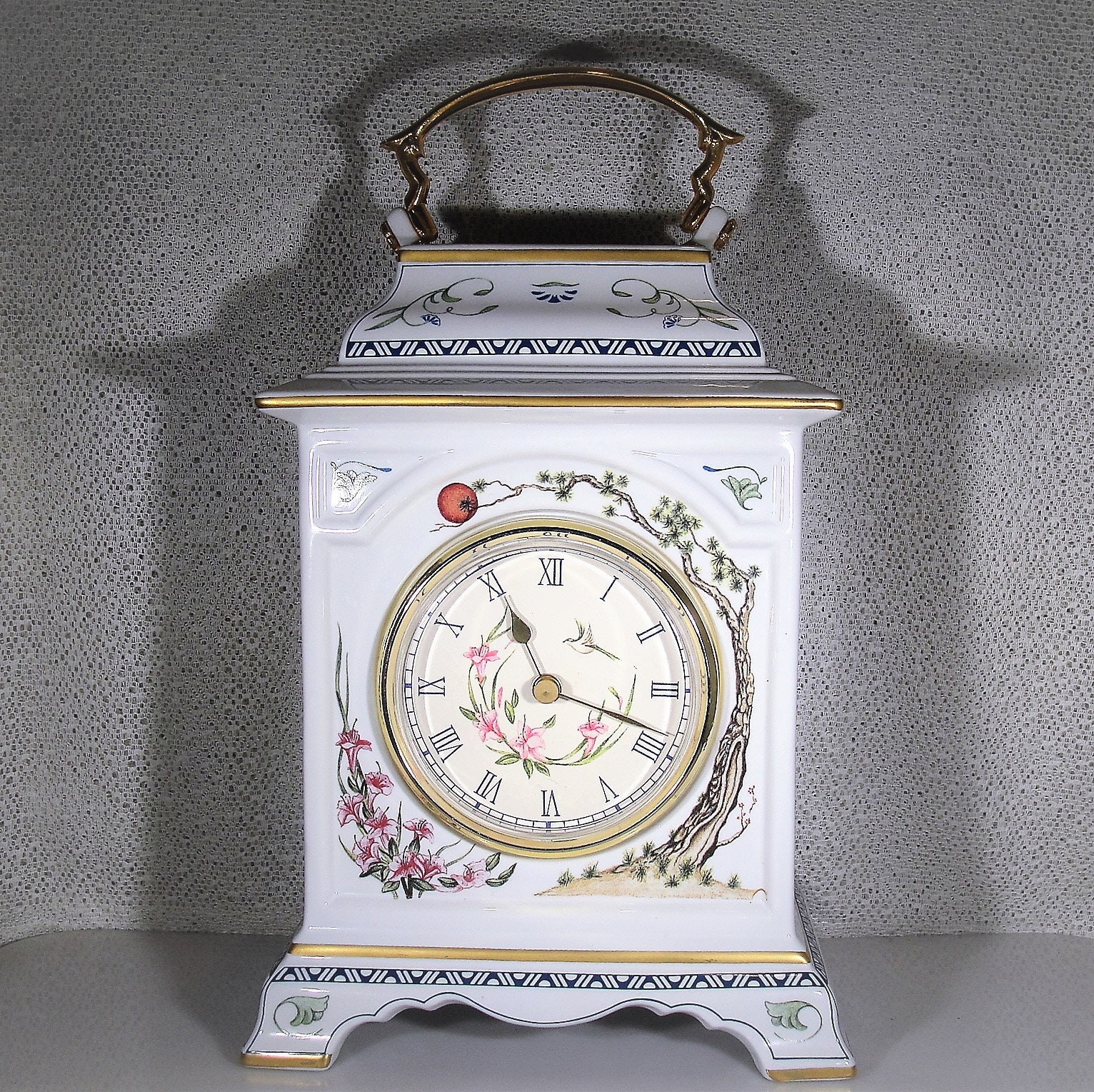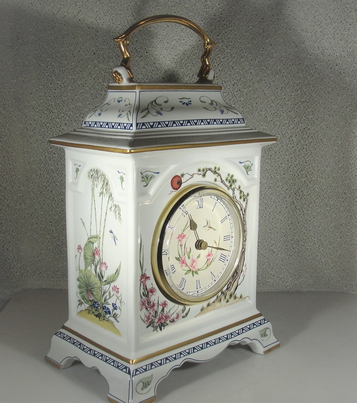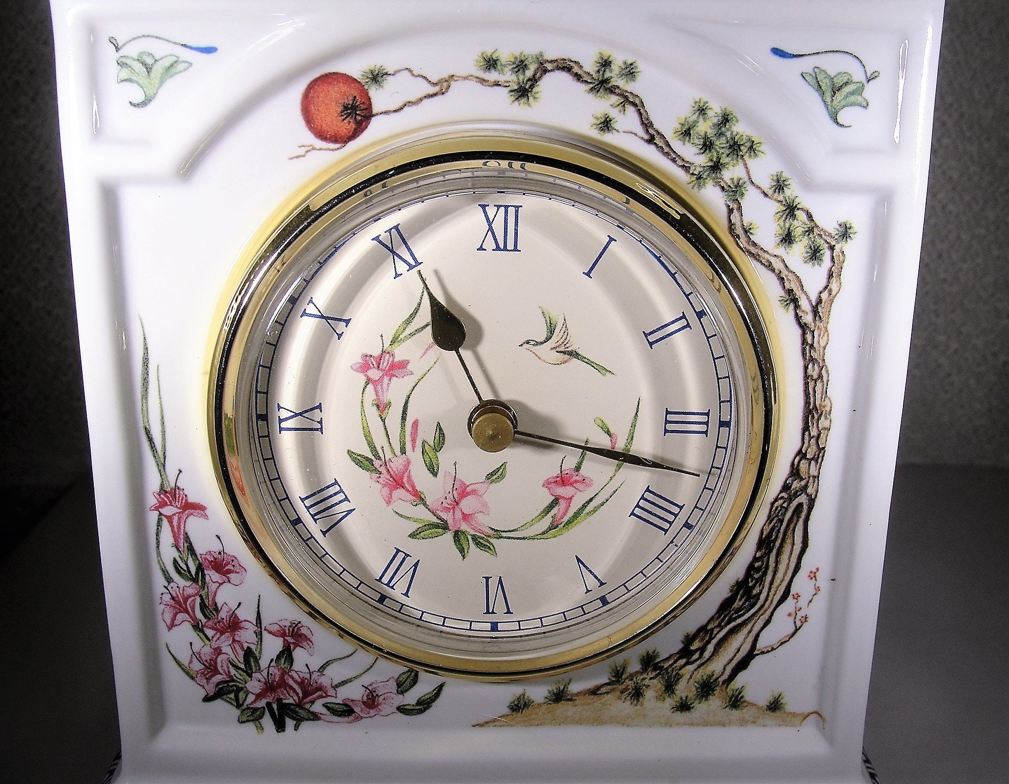 This is a gorgeous Porcelain Hand Painted Carriage Clock with wonderful Trees, Flowers and Birds of the Orient depicted. This Clock comes from the Franklin Mint Company and it is just stunning! Great Detail done in delicate swirls around the clock and within the face as well… Just Beautiful!!