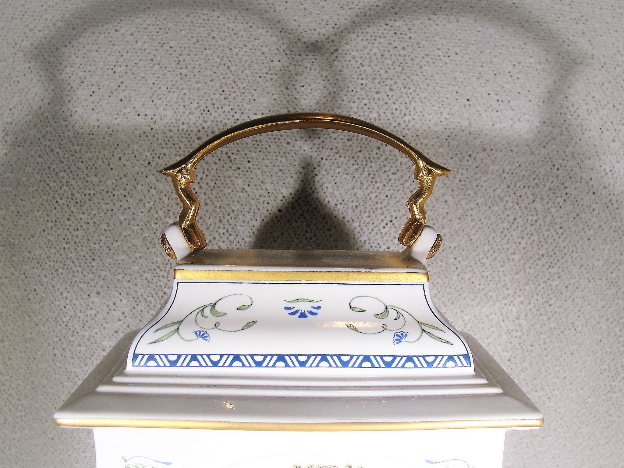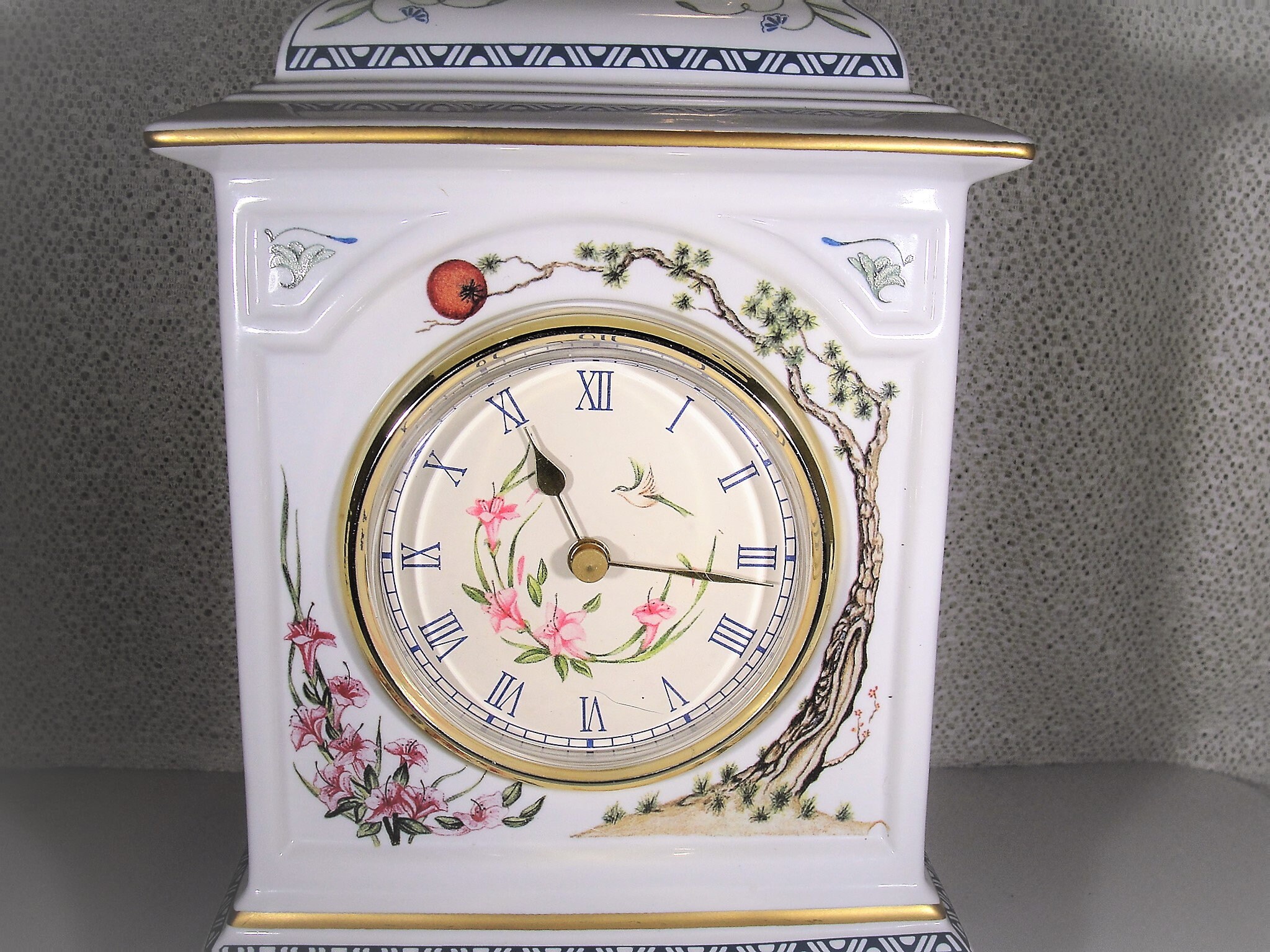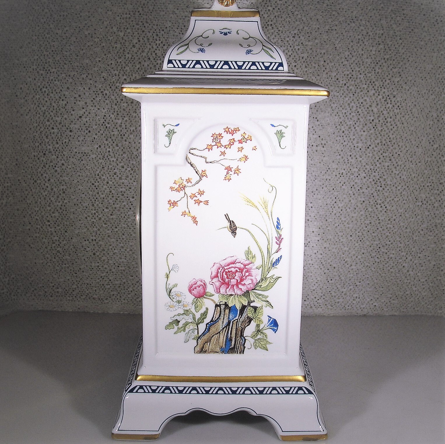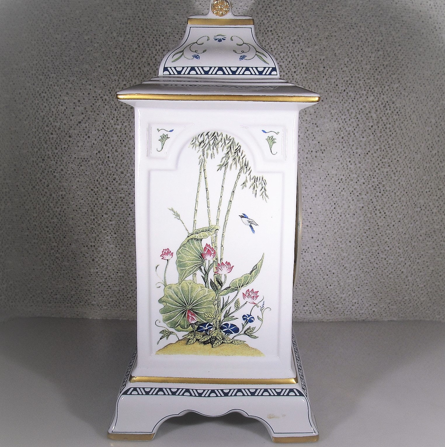 This is a gorgeous Porcelain Hand Painted Carriage Clock with wonderful Trees, Flowers and Birds of the Orient depicted. This Clock comes from the Franklin Mint Company and it is just stunning! Great Detail done in delicate swirls around the clock and within the face as well… Just Beautiful!!