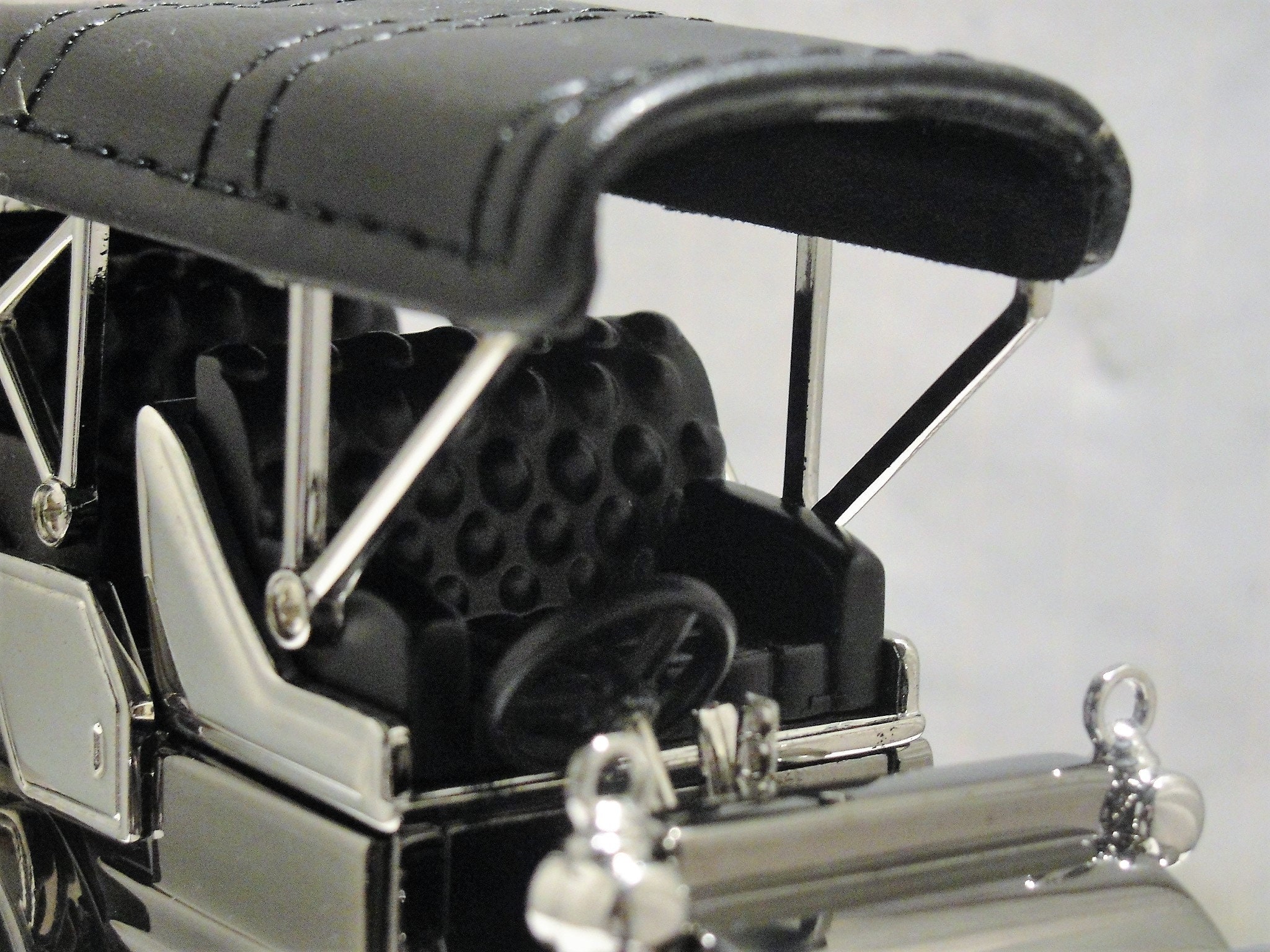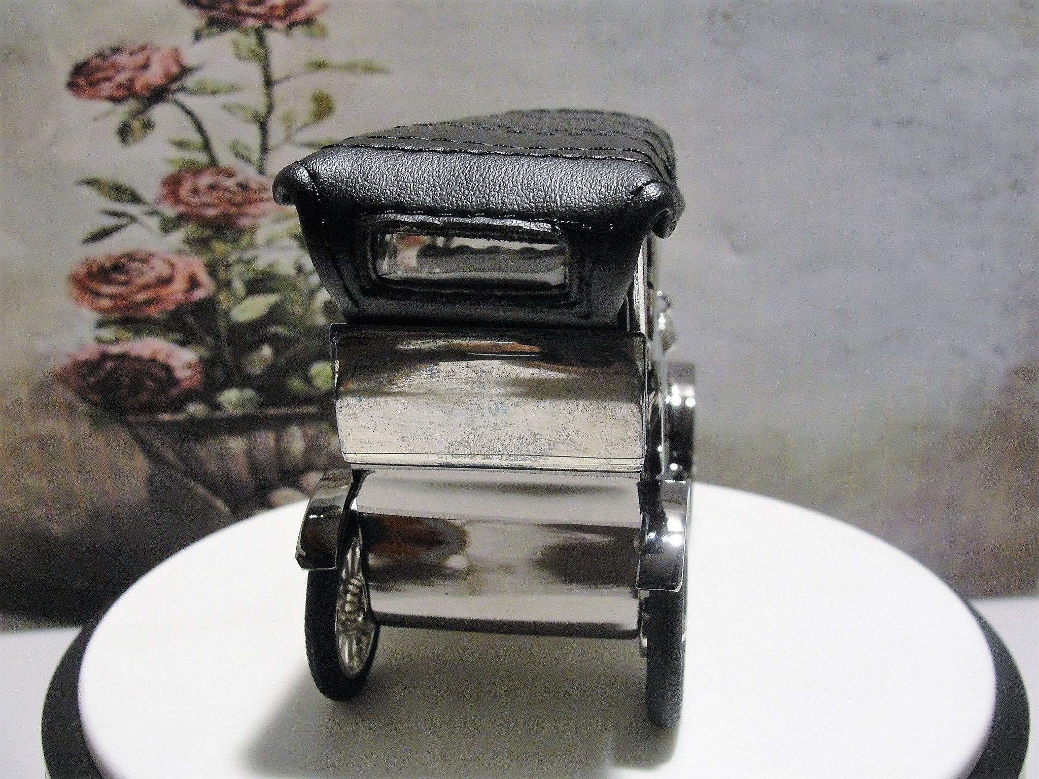 This is a glorious reproduction of a Model T Automobile with a Clock embedded in the driver’s side door of this miniature vehicle. This replica has exquisite details galore… it has rubber tires with Chrome colored rims. The whole thing is decked out with Chrome trim and accents. The body itself is a gorgeous gun metal (dark grey) color… beautiful! It also has leather seats with pushed in button detail and a leather roof. And it keeps time too!! It just doesn’t get any better than this.