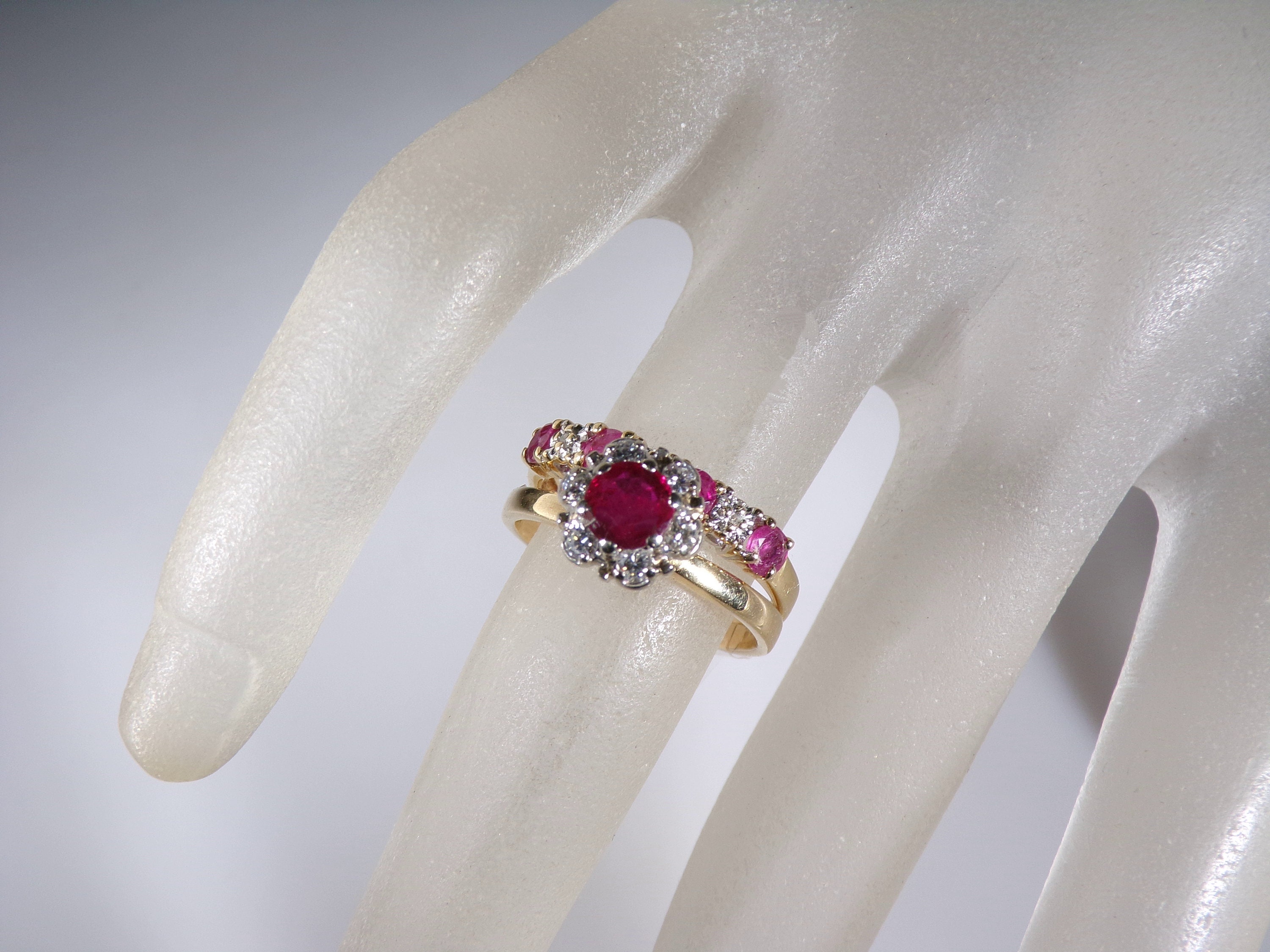 The Engagement Ring has a 5mm blood red ruby as its center stone with brilliant cut round diamonds that halo it. There are 6 (2mm each) diamonds that collectively weigh .12 total carats. Quality of the diamonds are graded as “VS” to “SI” … simply stunning! The Cathedral mounting is made of white gold and measures 8mm across the top. The band is Yellow Gold and this ring makes quite a statement when worn.