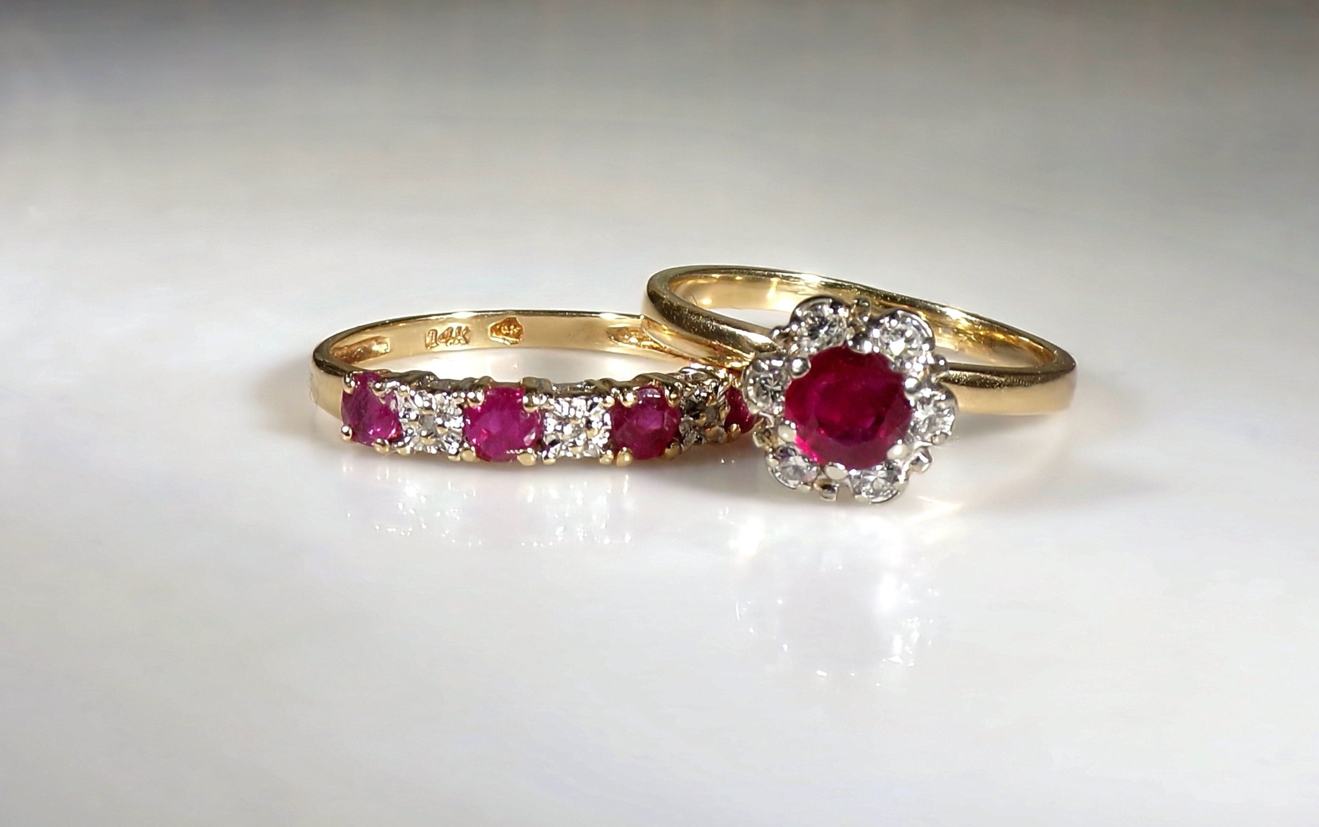 • Hallmarks are “14K” for both and on the inside band of the Engagement Ring is also an image that is illegible