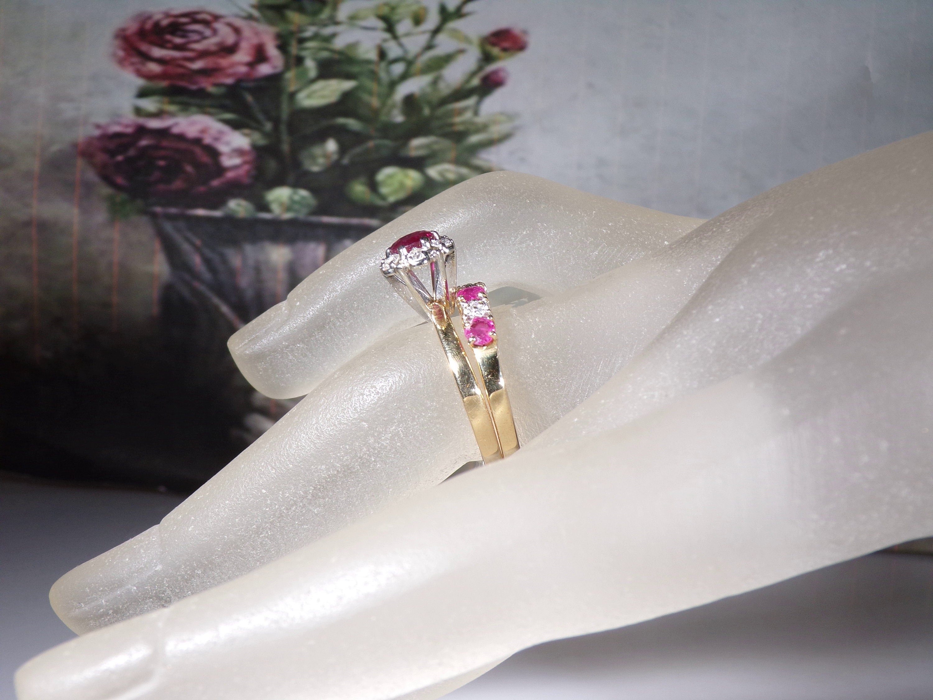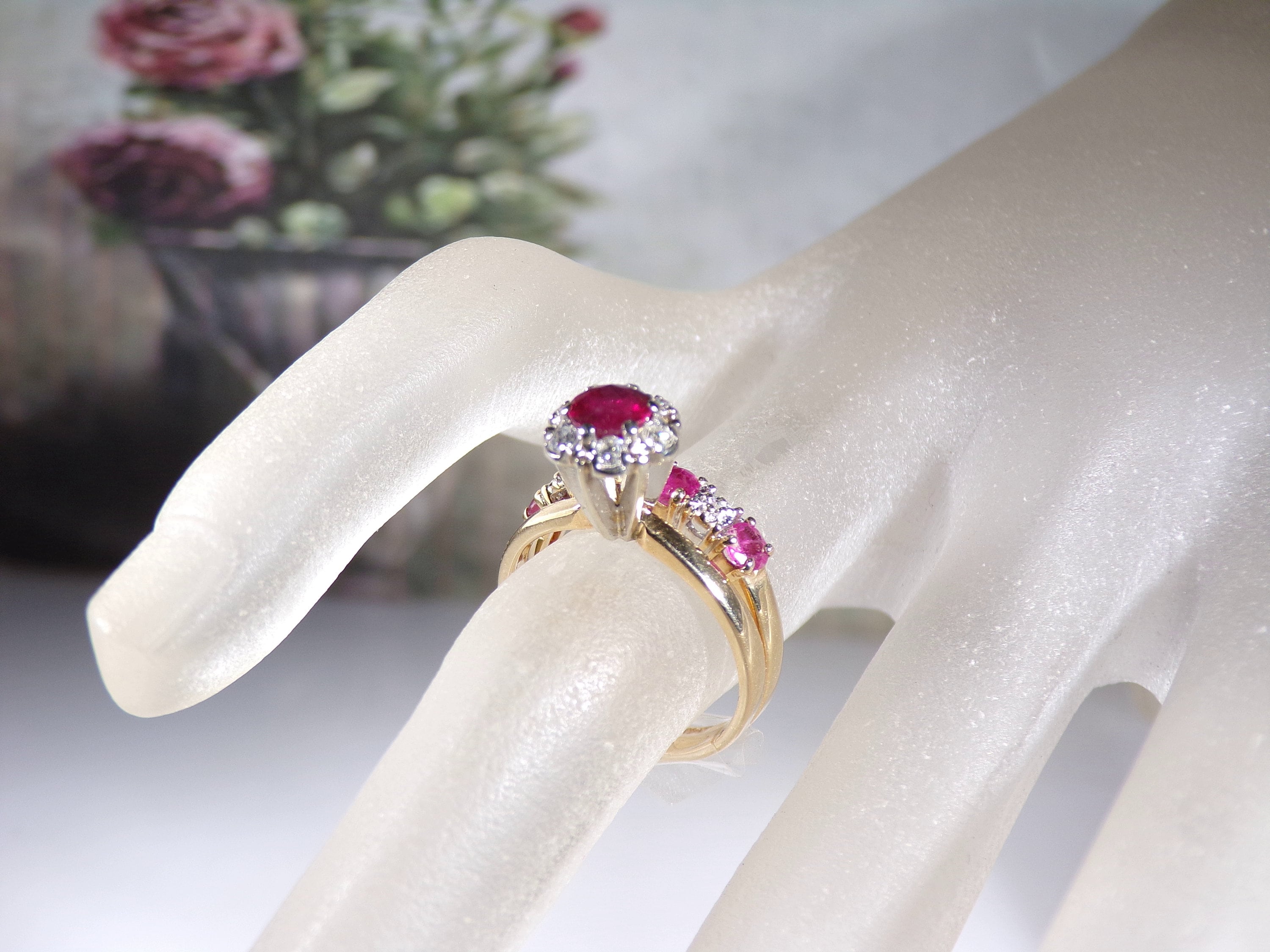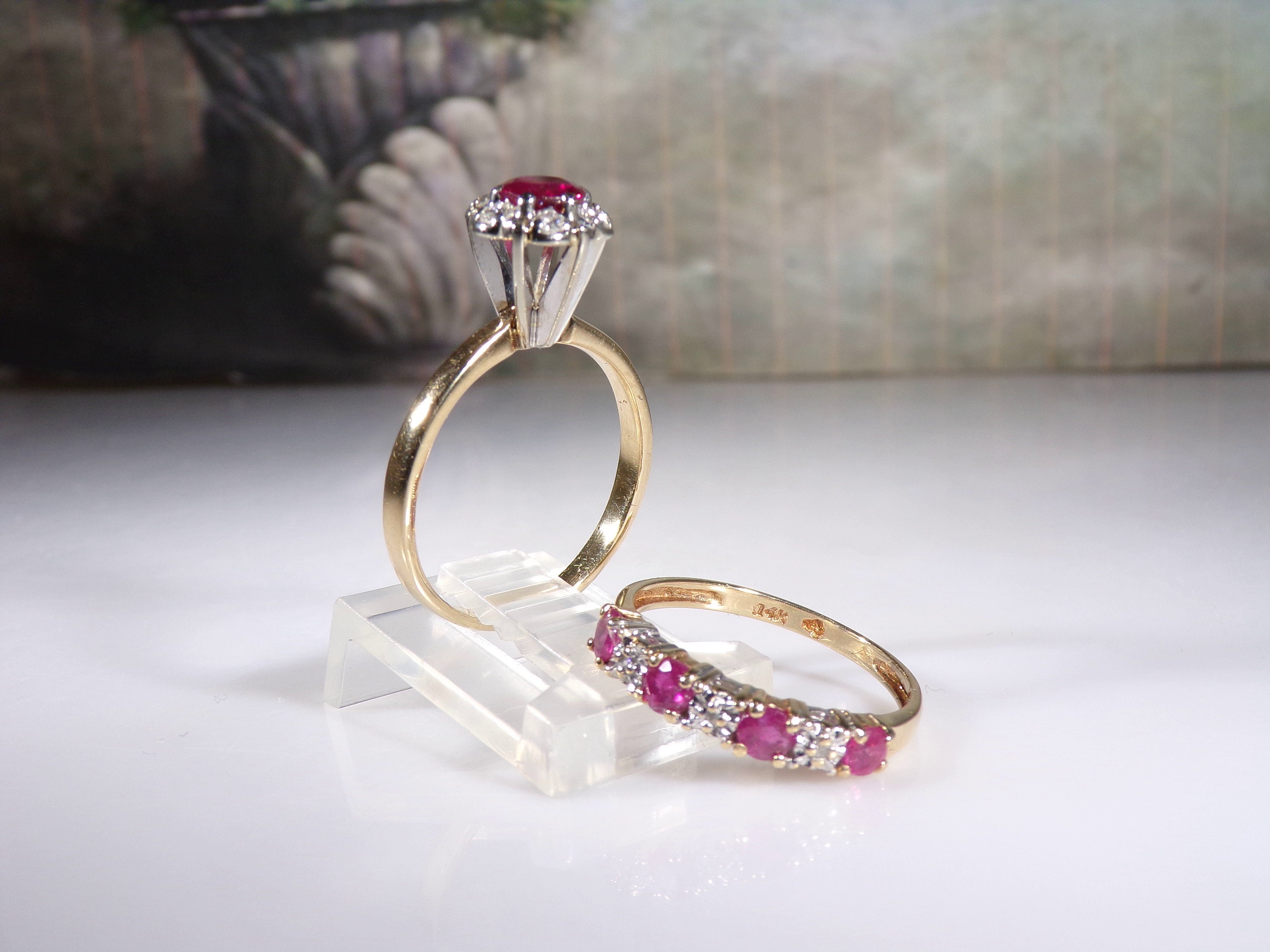 14K Ruby & Diamond Bridal Ring Set, Ruby Diamond Cluster Engagement Ring, Ruby Diamond Wedding Band, Vintage Rings, Size 6, FREE SIZING!!