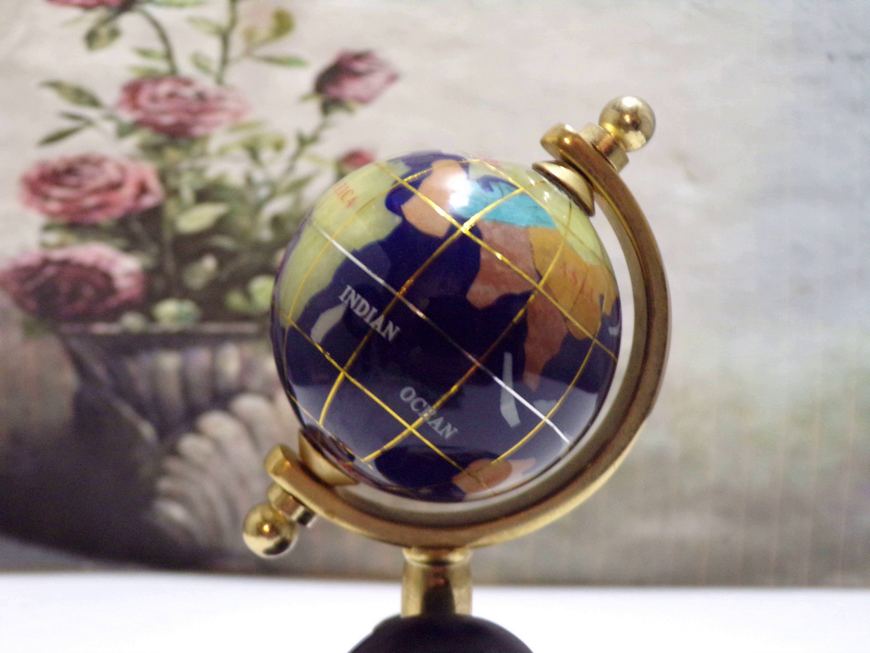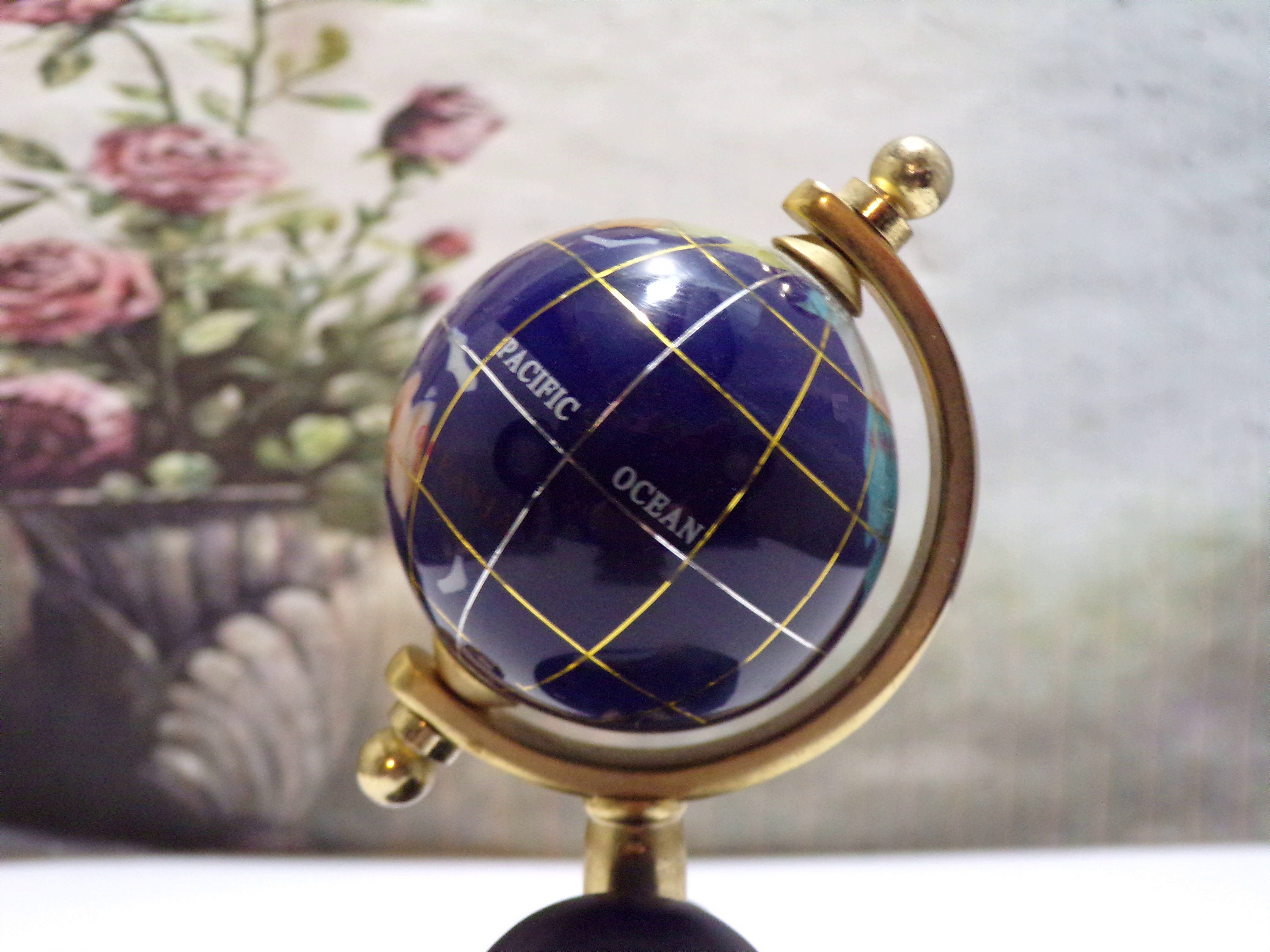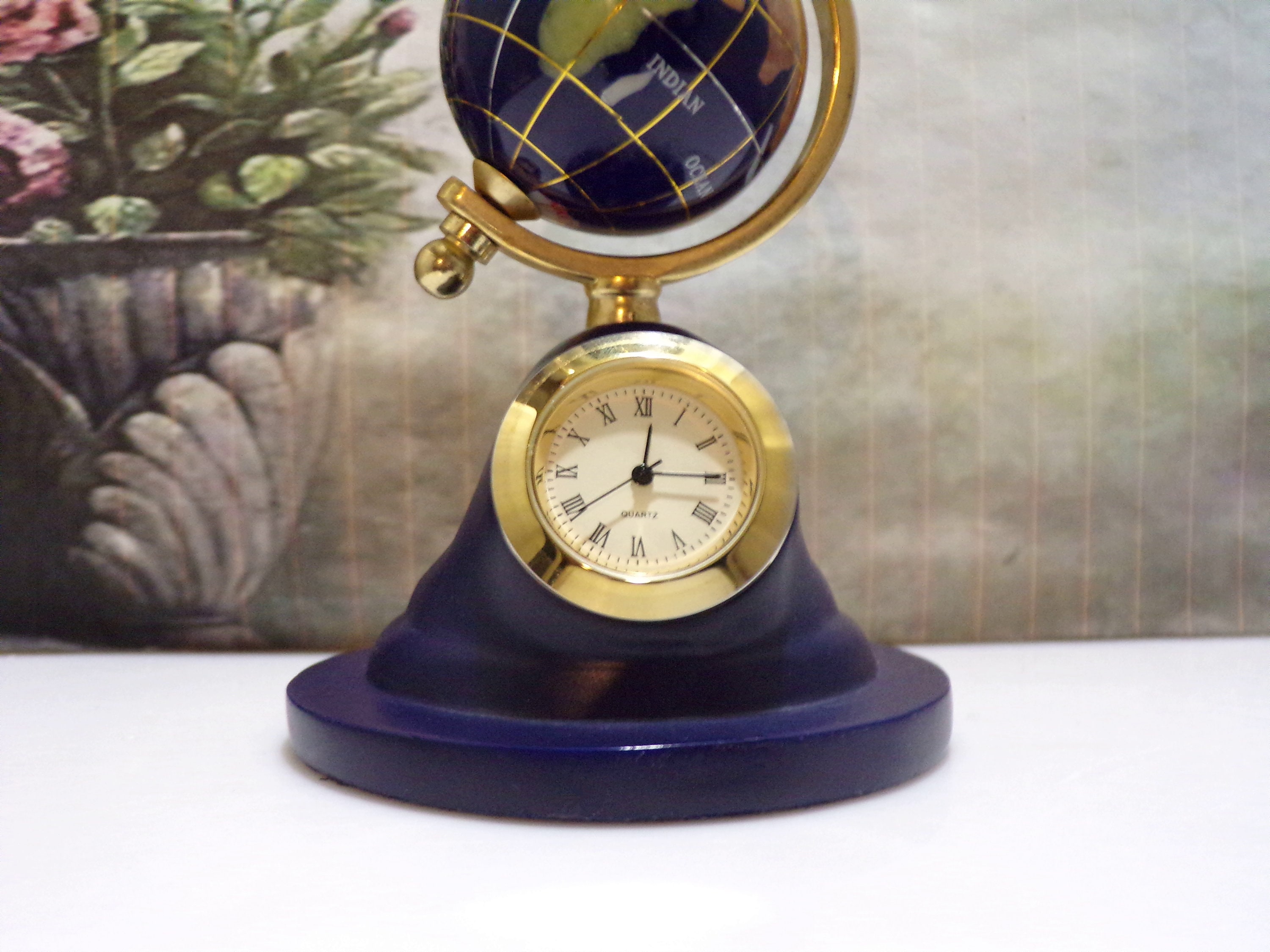This is a lovely Semiprecious Globe with a Quartz Clock Base. The size is perfect for a Desk Accessory and can also be used as a Paperweight. The globe turns and each continent and each ocean are identified on the globe. The clock is a Quartz clock that will consistently run until the battery runs out. Simply replace the battery and your clock is back in business. This item has a cobalt blue base with gold metal accents. The globe is made of semiprecious stones such as Lapis, Opal, Jade, Cobalt and Mother of Pearl. So Cute!