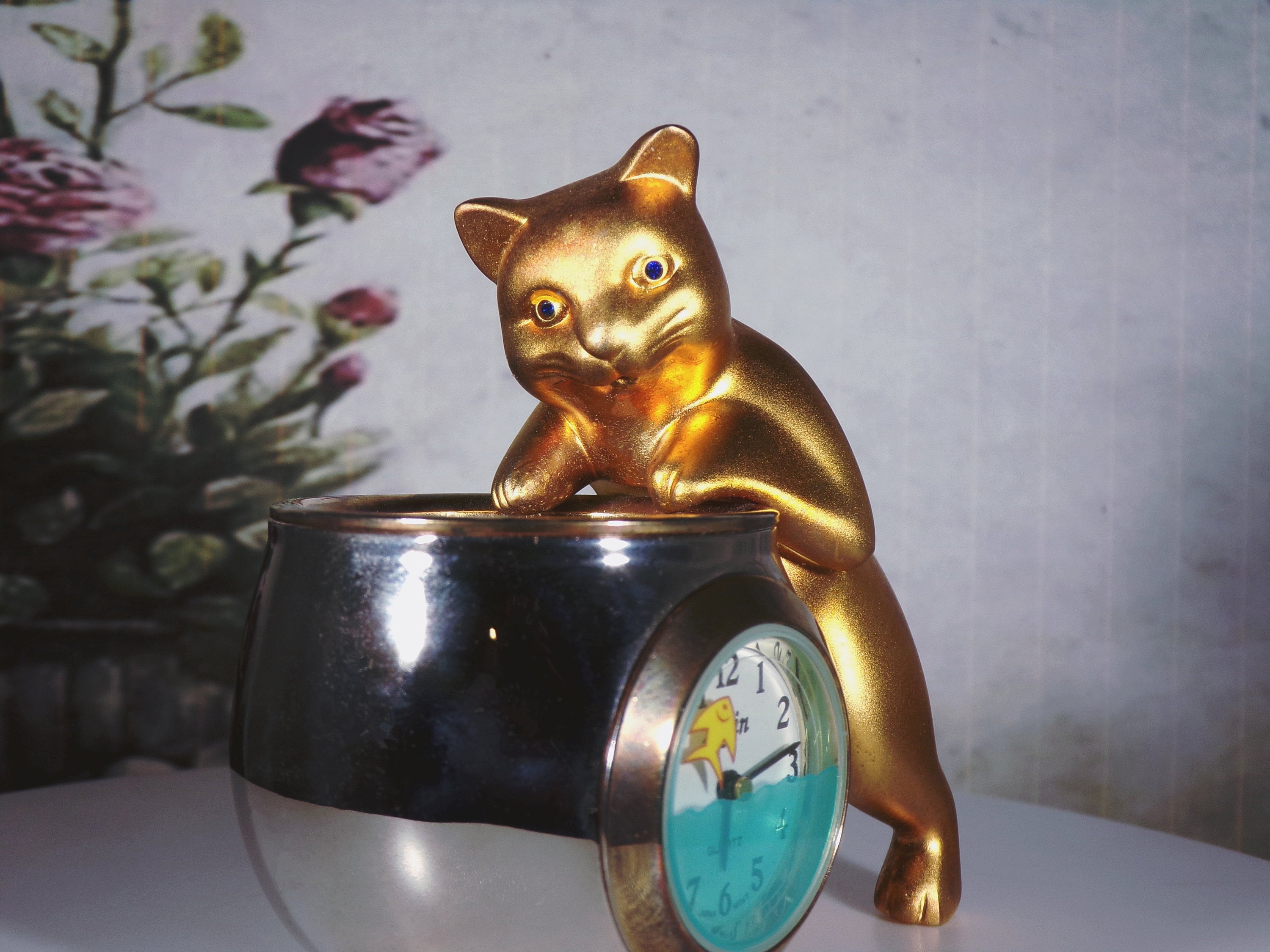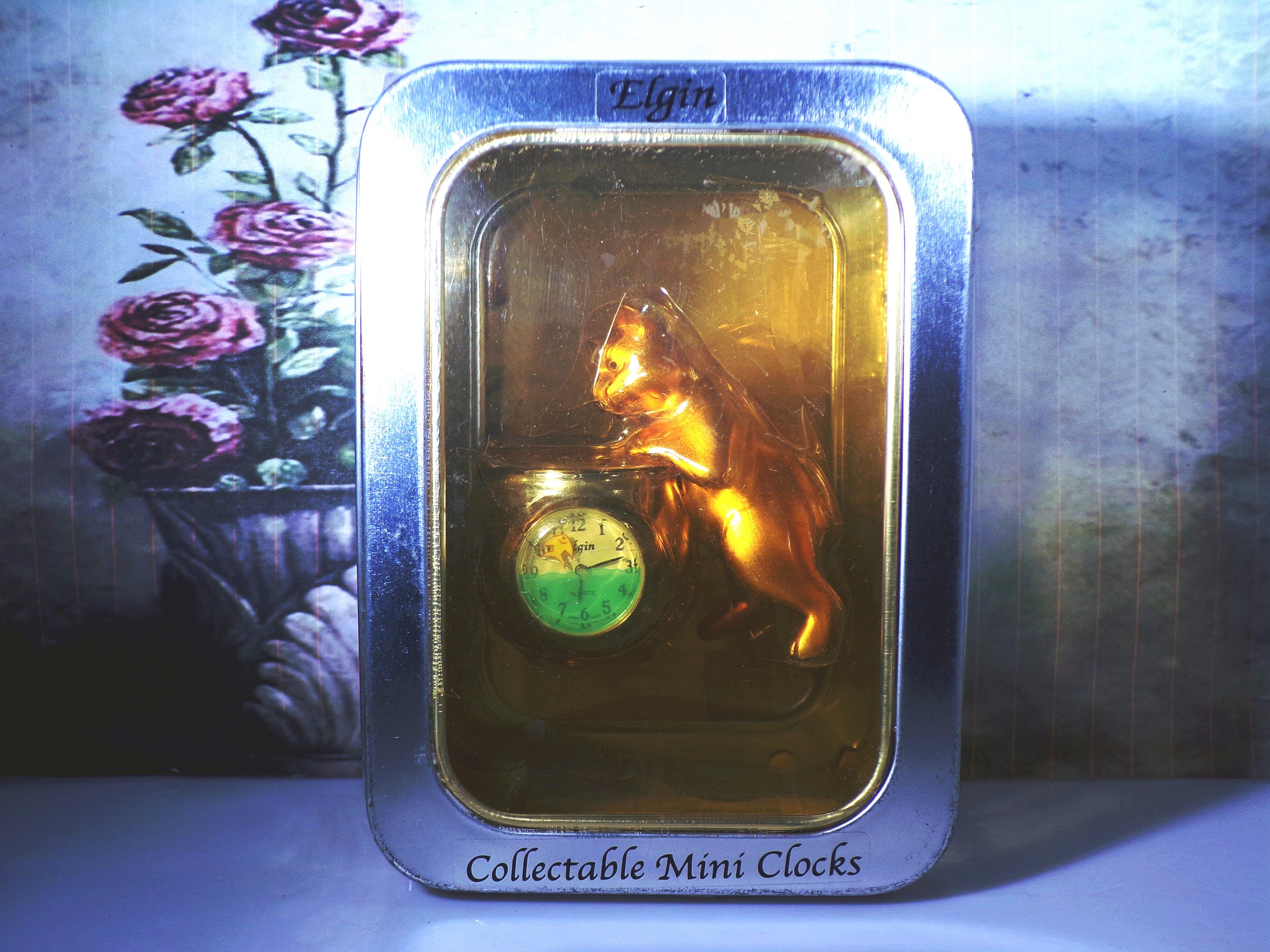 This is a fun miniature clock where the Matte Gold Cat is trying to get the little fish that is in the fishbowl. Fun for all ages and especially for a cat lover!!