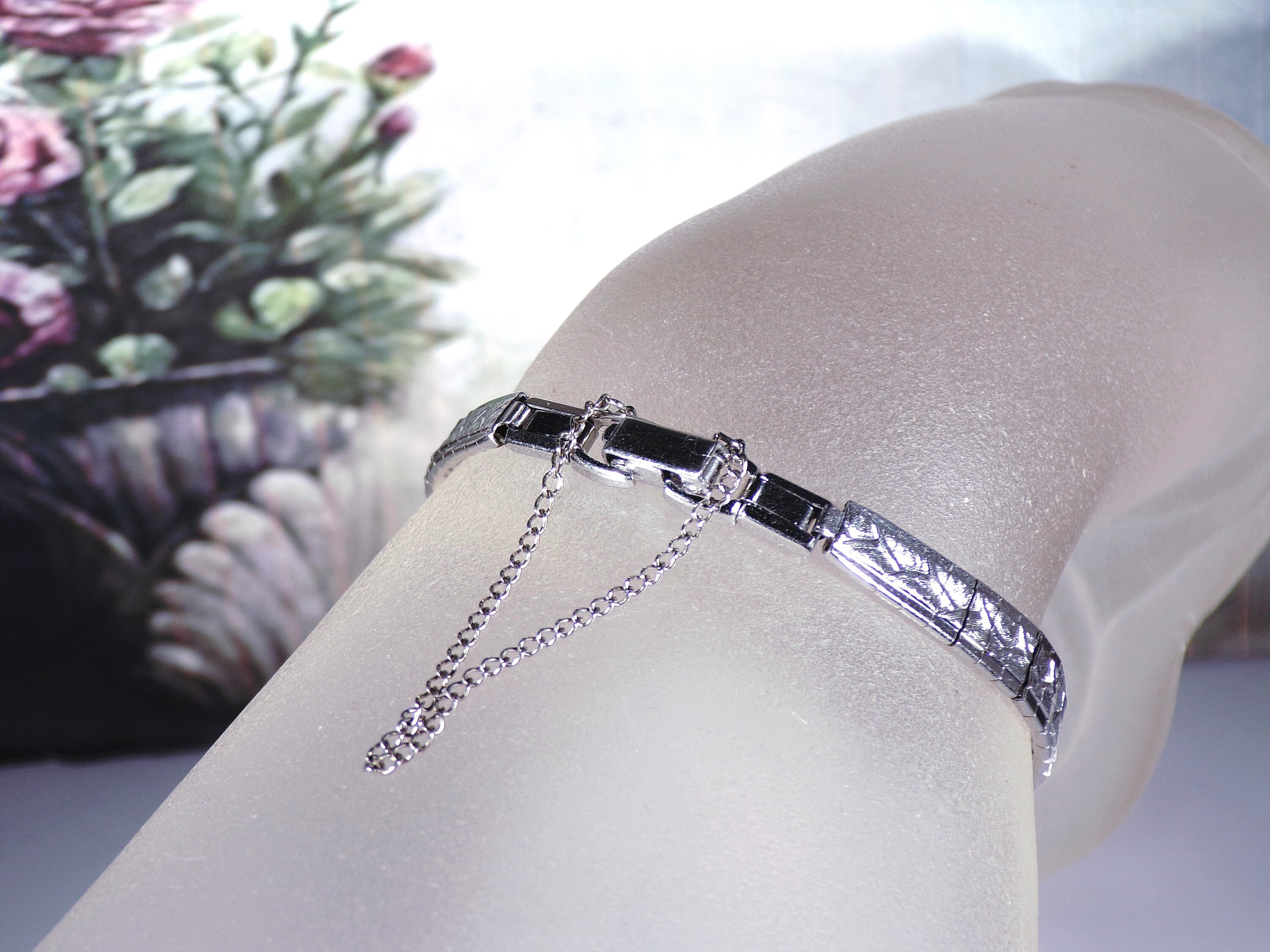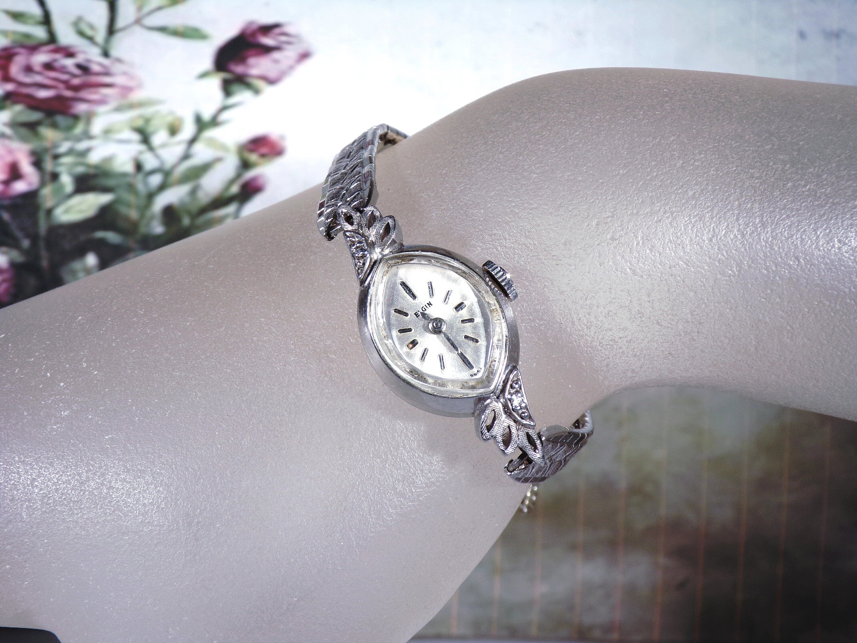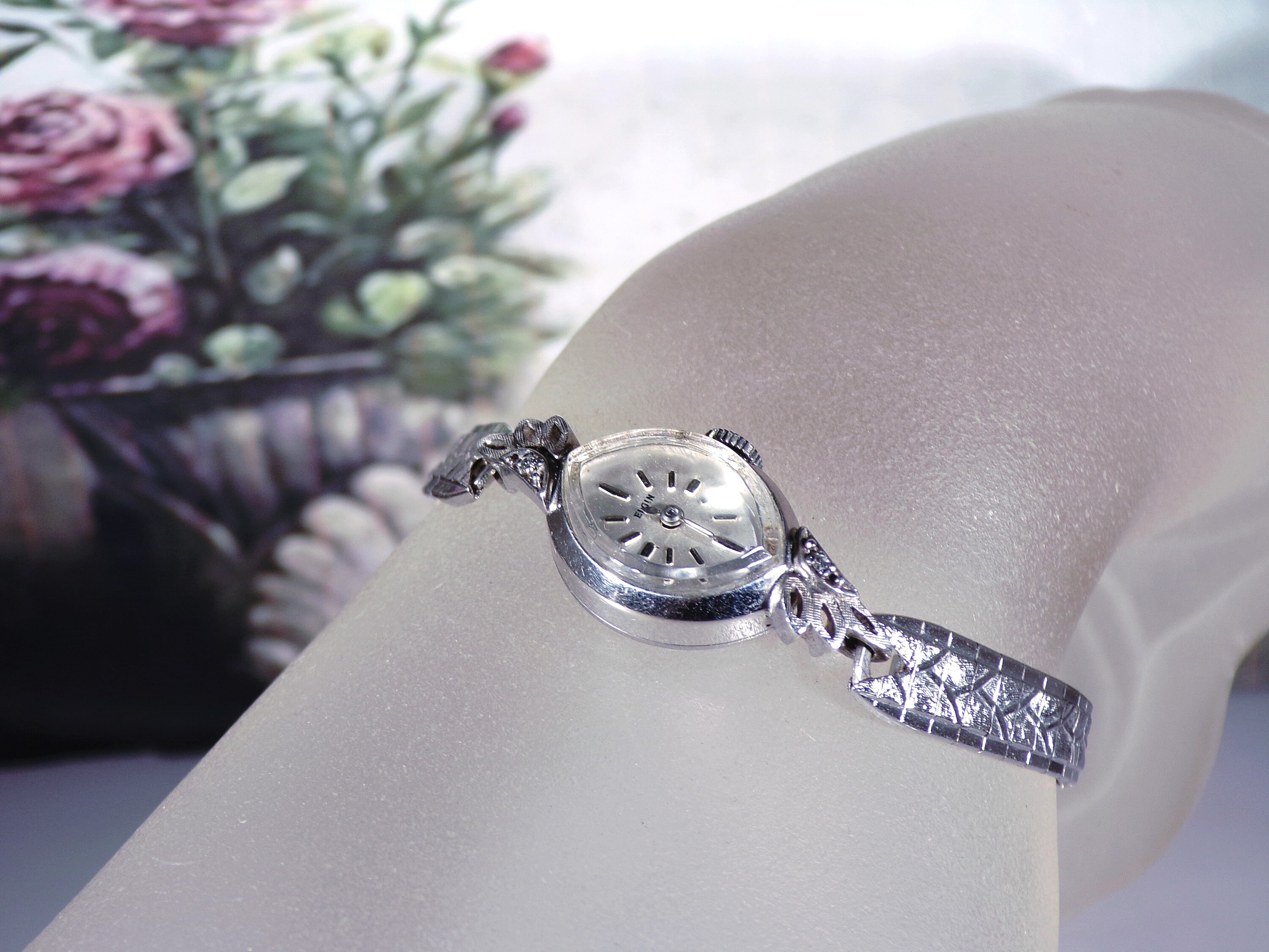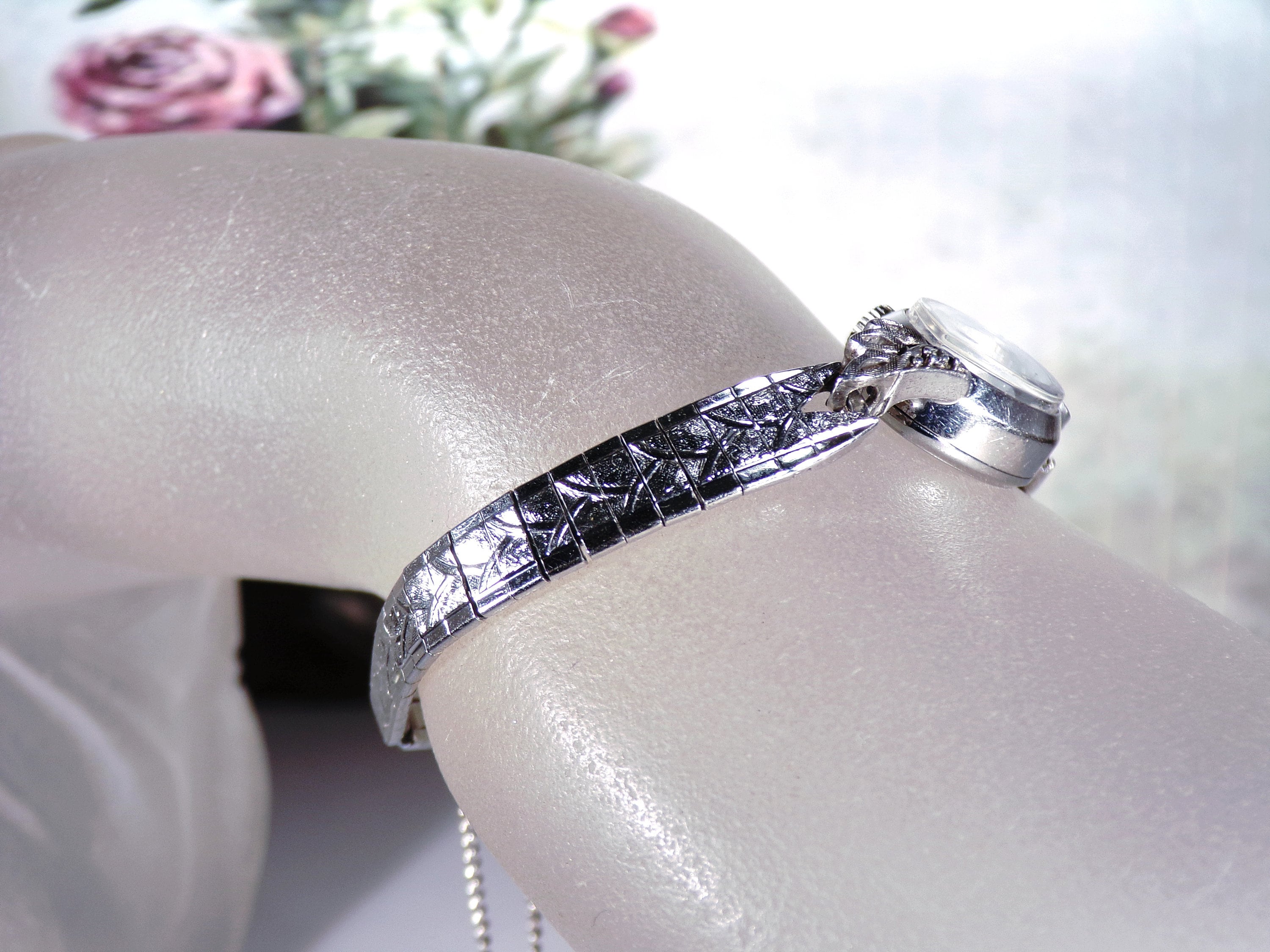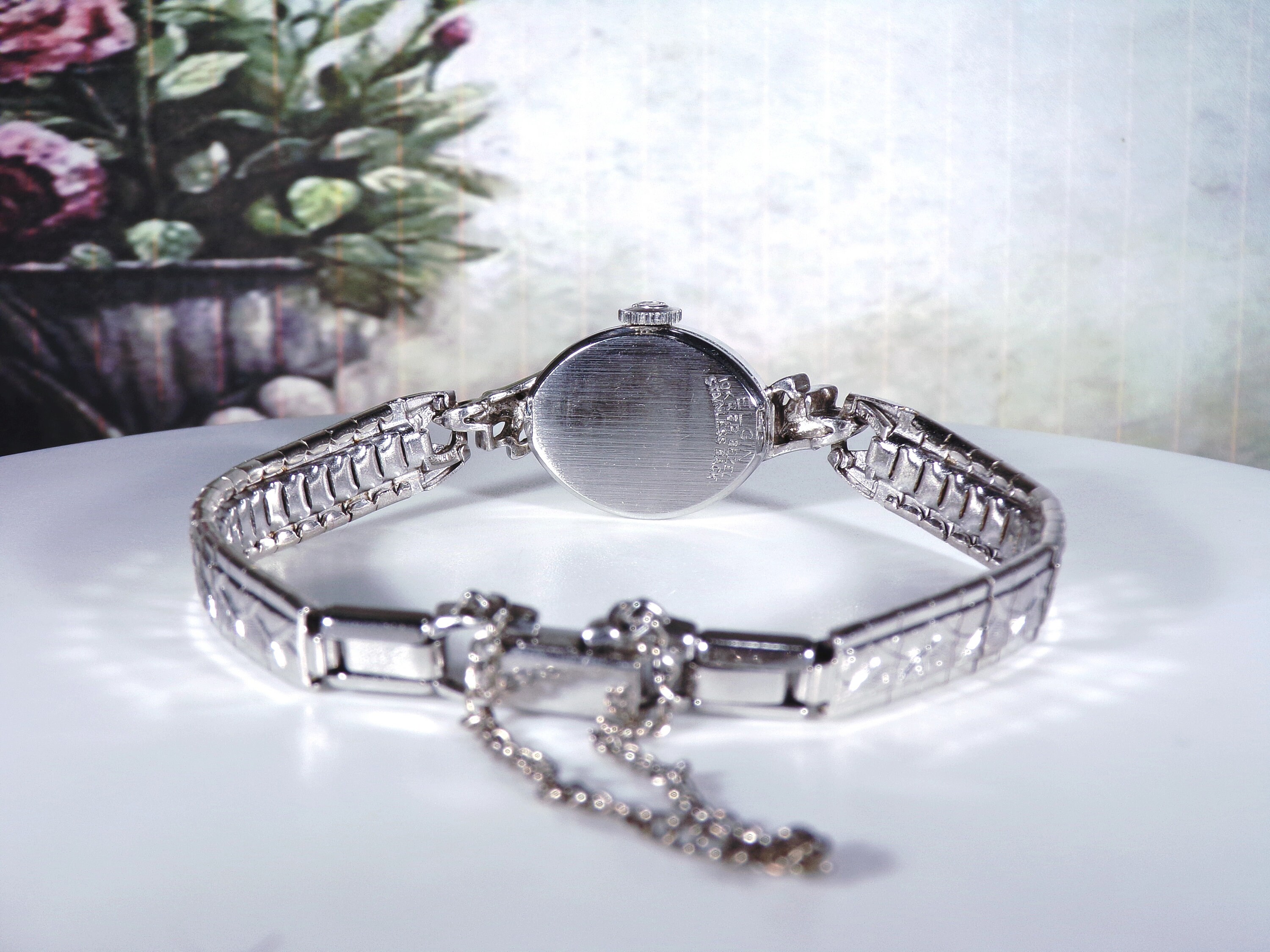 This is a beautiful Women’s 10K White Gold Wristwatch with a diamond at the top and bottom of the face of the watch. They are set in a pretty Art Deco setting. The band is a gorgeous Etched design band that also has an Art Deco Flair with a fold over clasp and nice safety chain. The band is a gold-filled band of 1/20 gold fill. The case of the watch is 10K Rolled White Gold with a Stainless-Steel back. The Case and the band are both marked as such. Just a beautiful Mechanical Wind-Up Watch that keeps great time!!