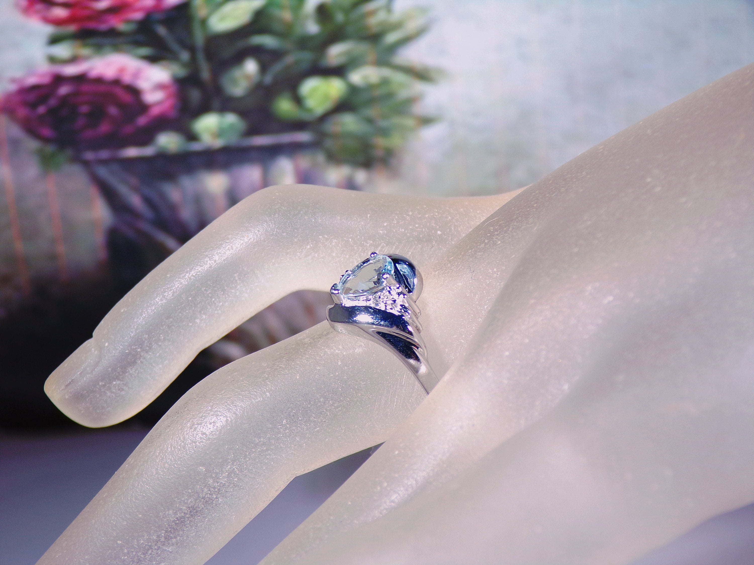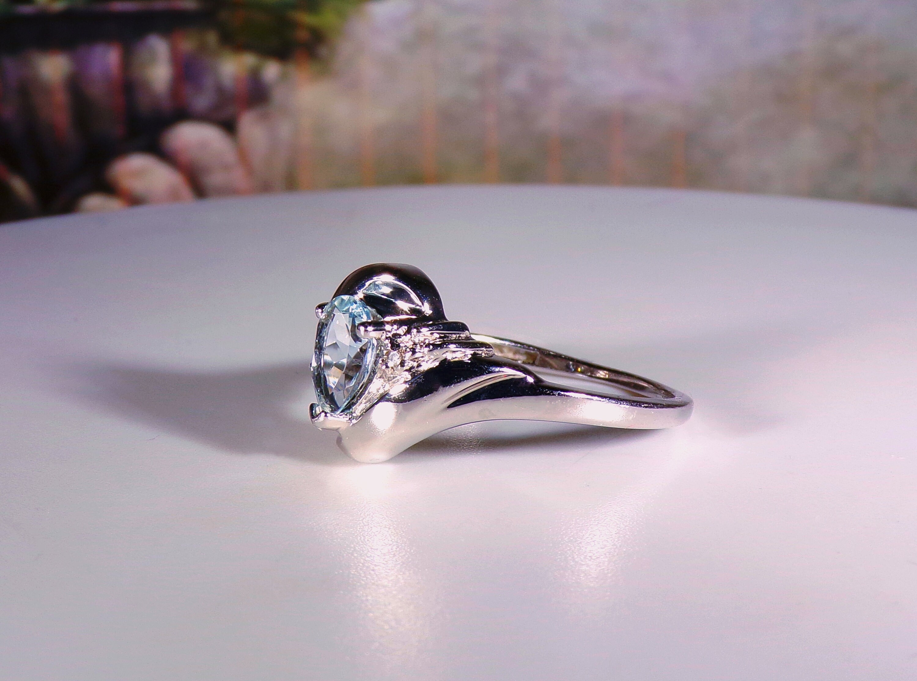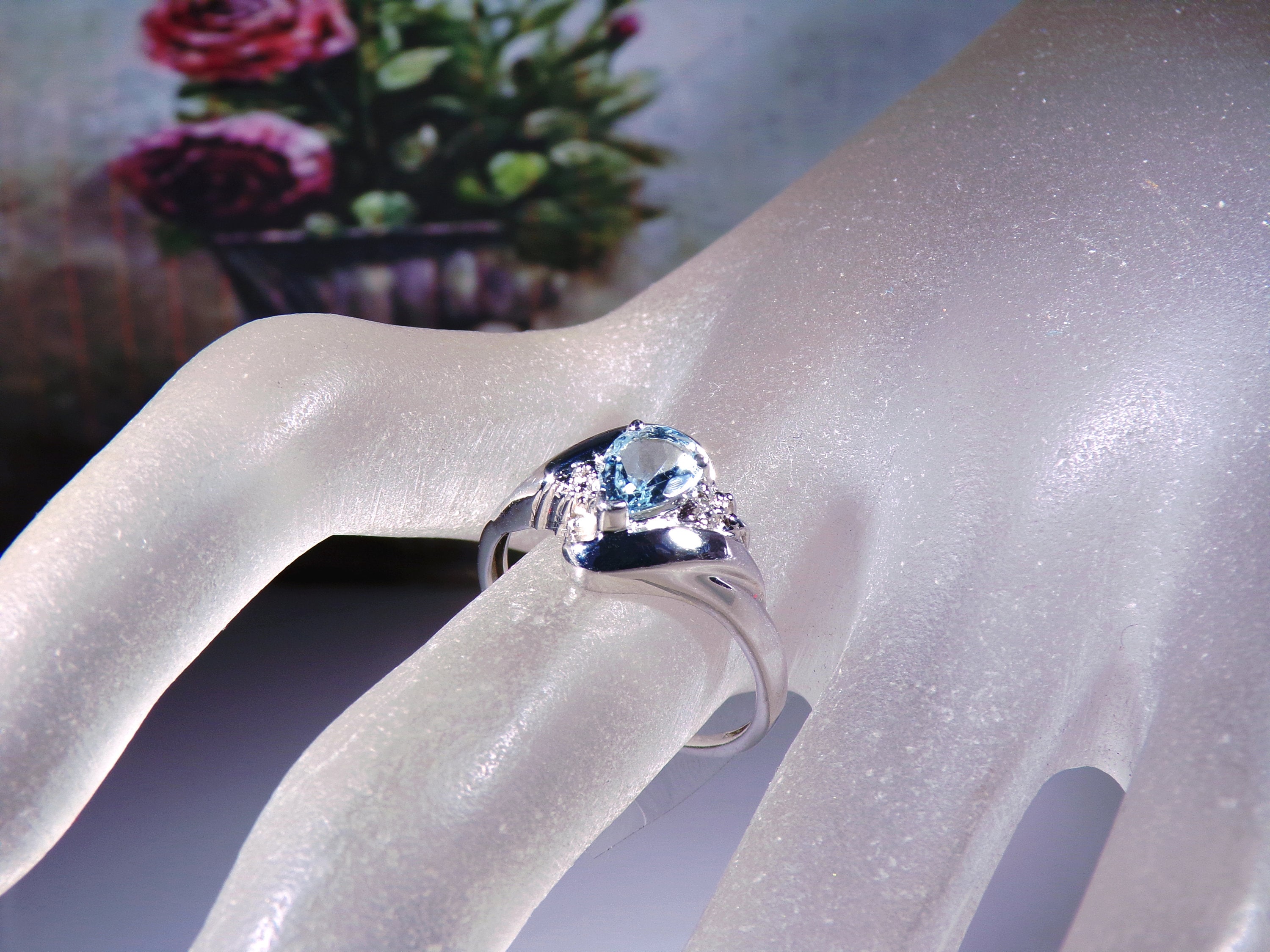 This is a gorgeous Right-Hand Ring that consists of 10K White Gold, A nice Pear Shaped Genuine Pale Blue Aquamarine Gem that measures 7mm by 5mm = .75 of a Carat. There is also a small genuine diamond that is set on each side of the center Aquamarine Gem. This is a beautiful ring that would be great for a March Birthday or an Aquamarine lover!