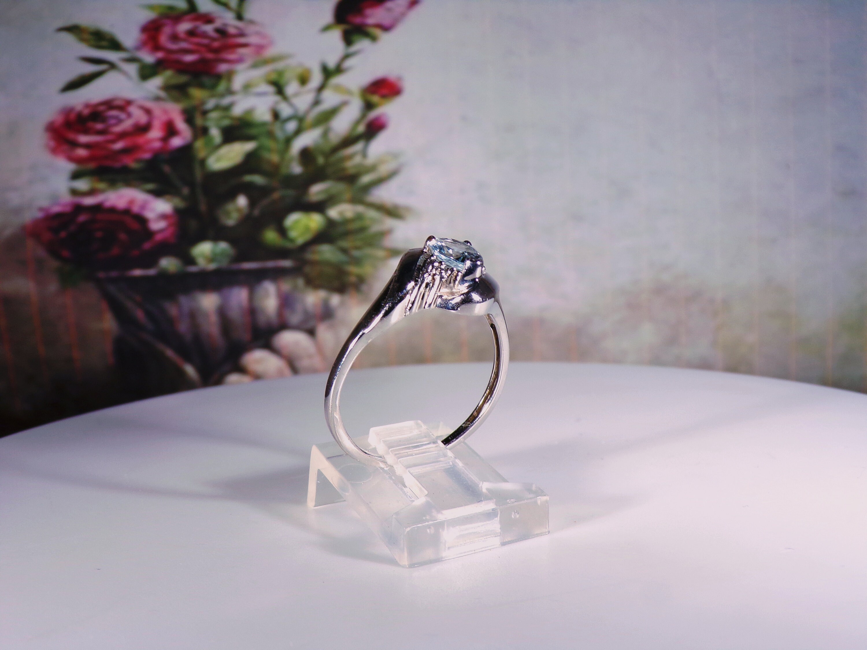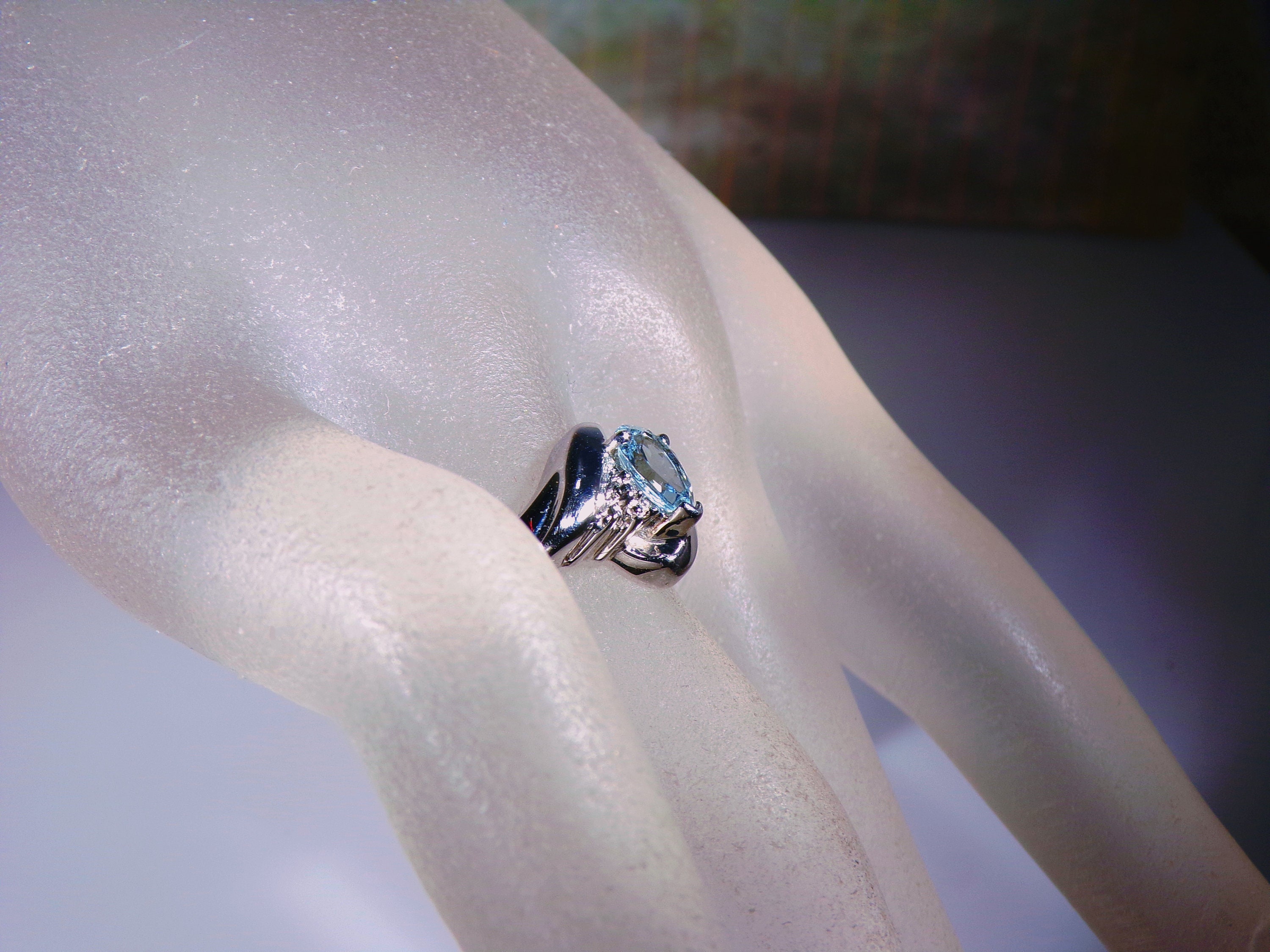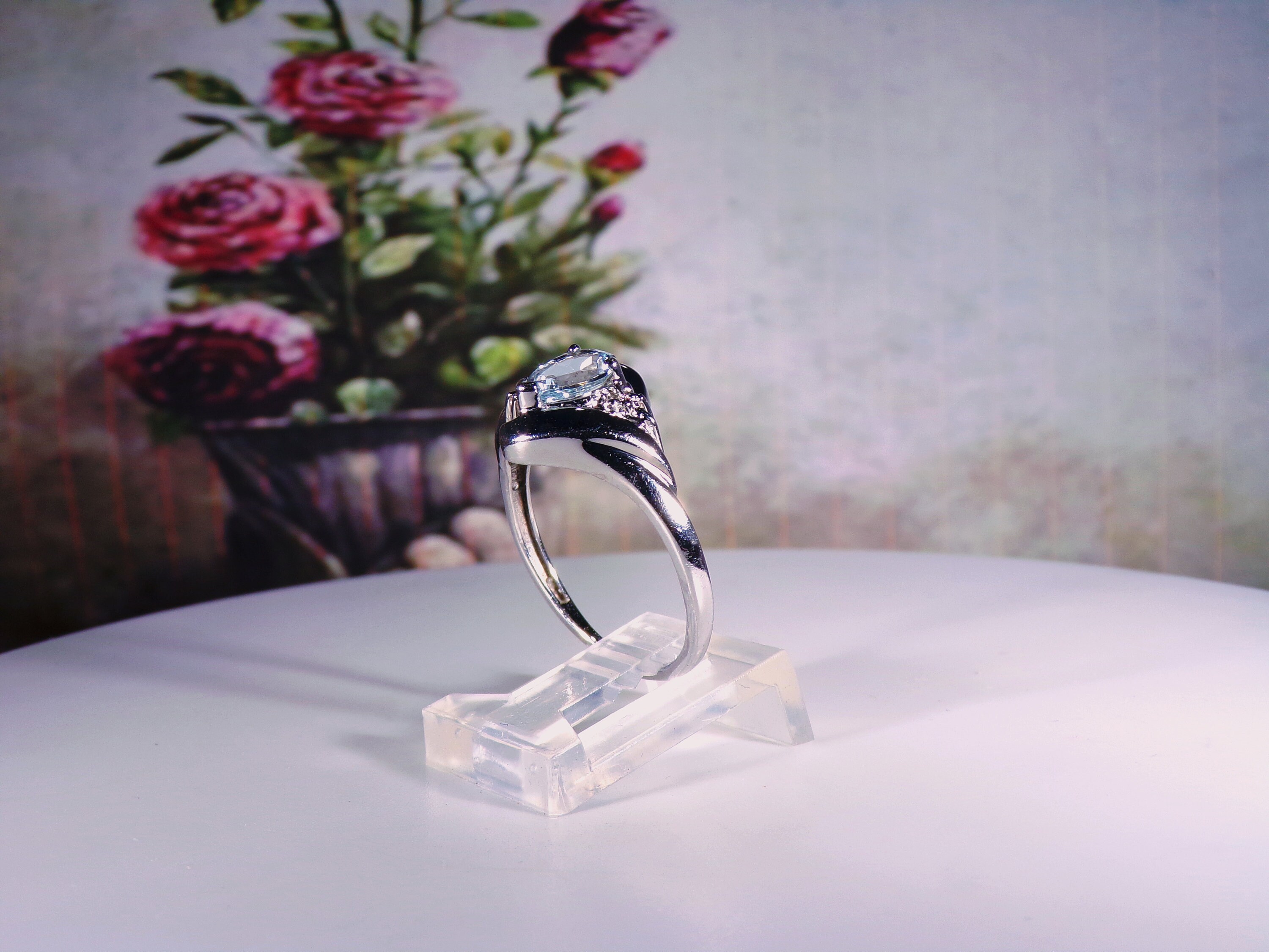 This is a gorgeous Right-Hand Ring that consists of 10K White Gold, A nice Pear Shaped Genuine Pale Blue Aquamarine Gem that measures 7mm by 5mm = .75 of a Carat. There is also a small genuine diamond that is set on each side of the center Aquamarine Gem. This is a beautiful ring that would be great for a March Birthday or an Aquamarine lover!