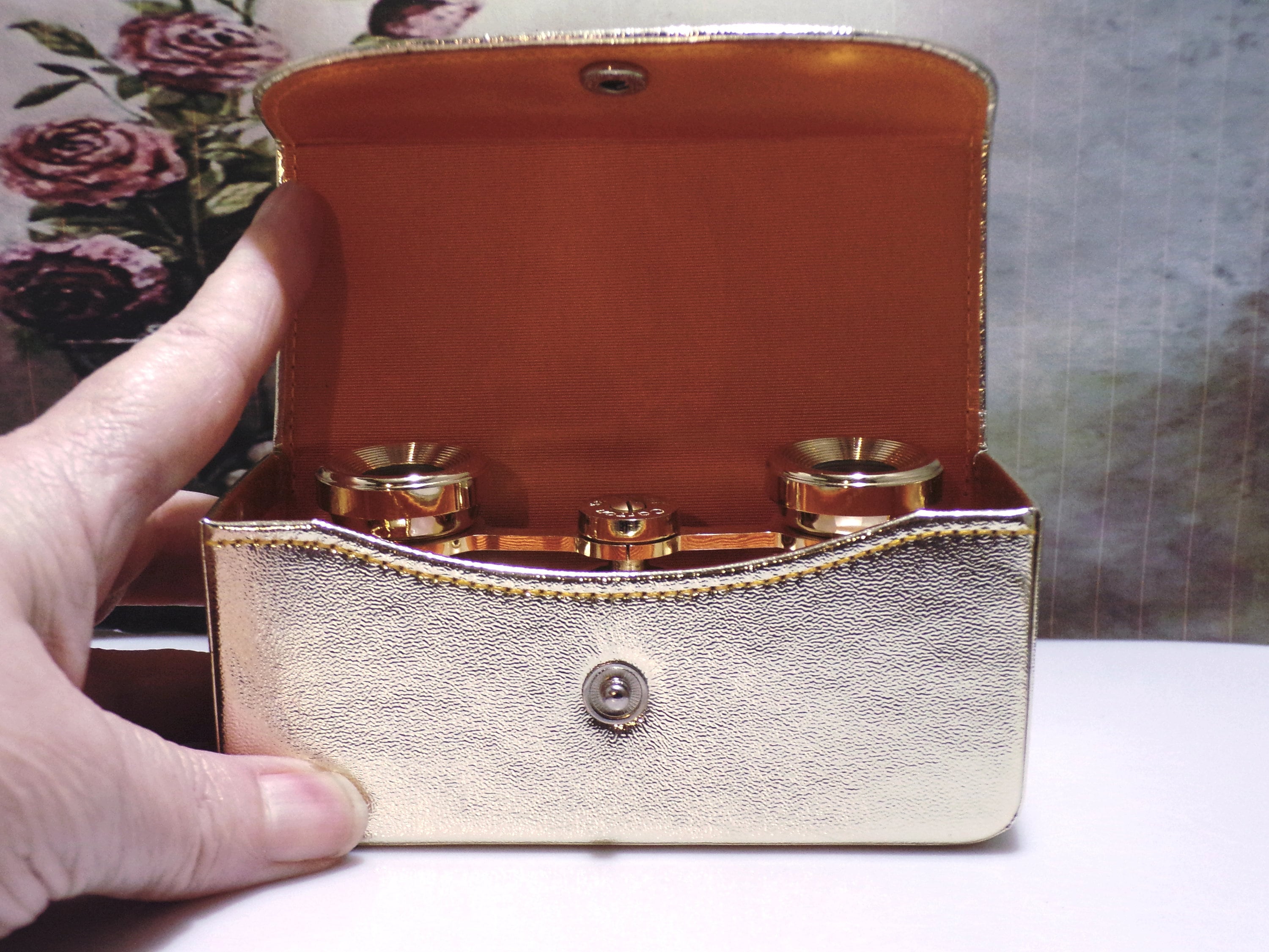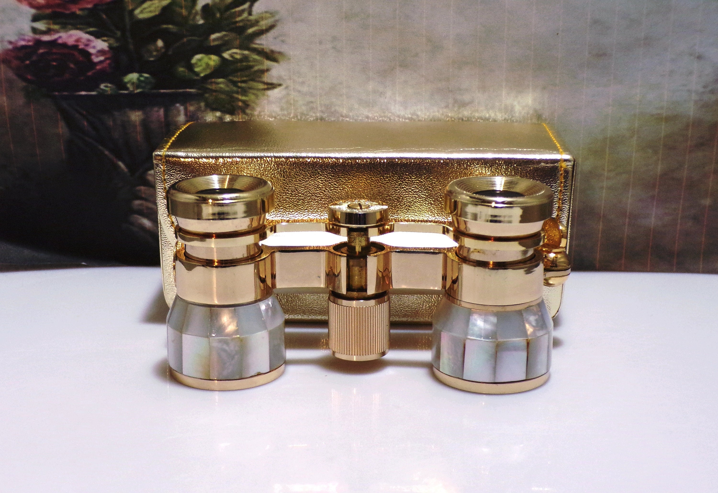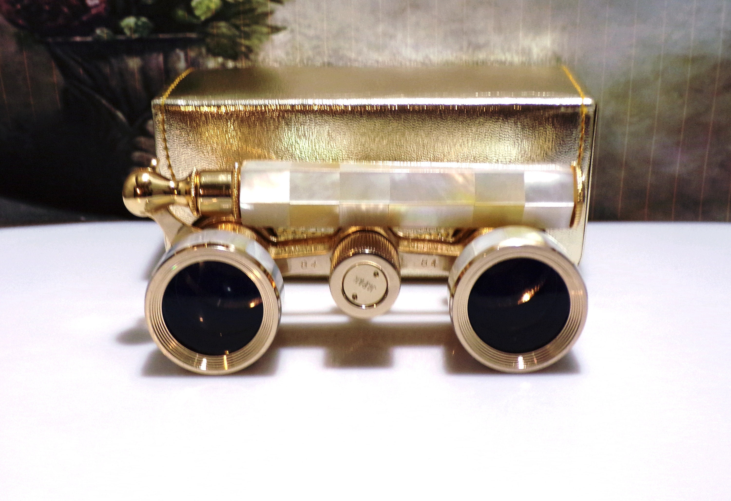 This is a stunning pair of opera glasses that are in “LIKE NEW” Condition. The glasses have slats of Mother of Pearl Inlays that goes around each scope with Gold Plated trim. The handle also has slats of Mother of Pearl and Gold-Plated trim that just makes these opera glasses a standout! The handle can be unlocked and moved as desired and then tightened again because it has a flat screw that should be able to be turned. These Opera Glasses also articulate so that they can fit any size face. Simply move them closer together or wider apart as needed. For your vision needs, they also expand and contract so that you can focus the glasses as needed. Just a beautiful and very elegant pair of Opera Glasses!!