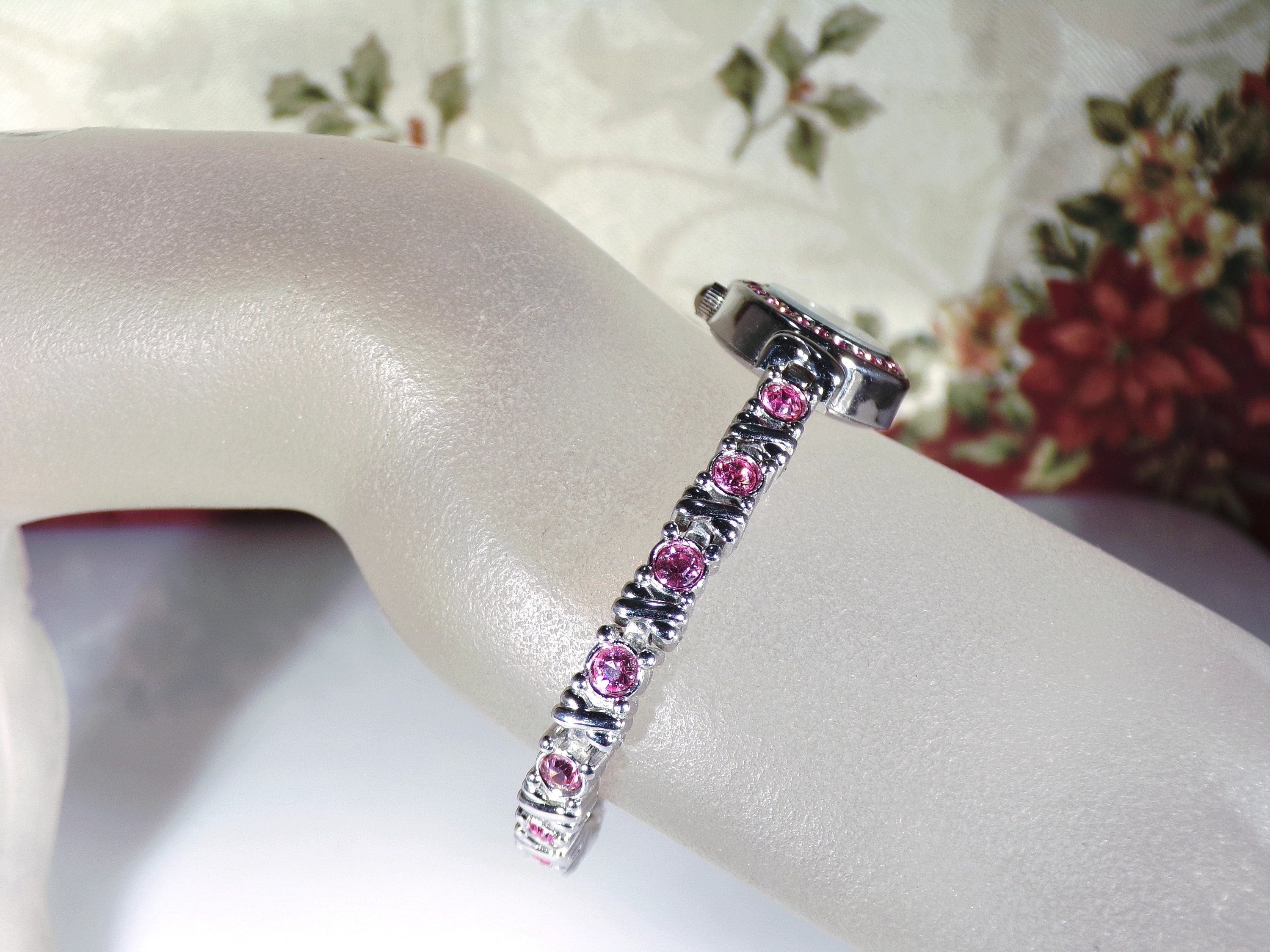 VAVANI Women’s Wrist Watch, Pink Rhinestone Watch with White Gold Plating, Quartz Watch, Analog Face, Vintage Wrist Watch