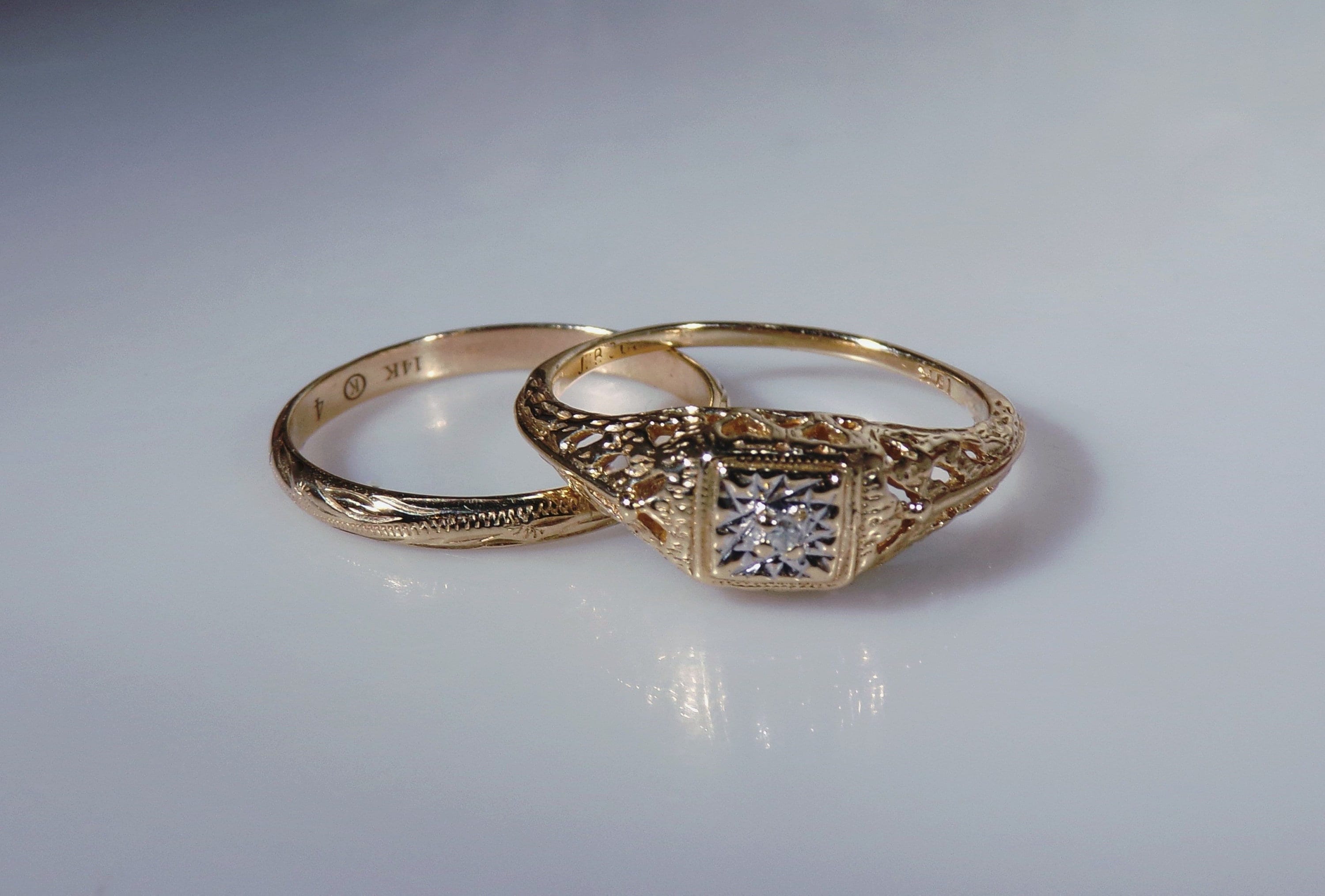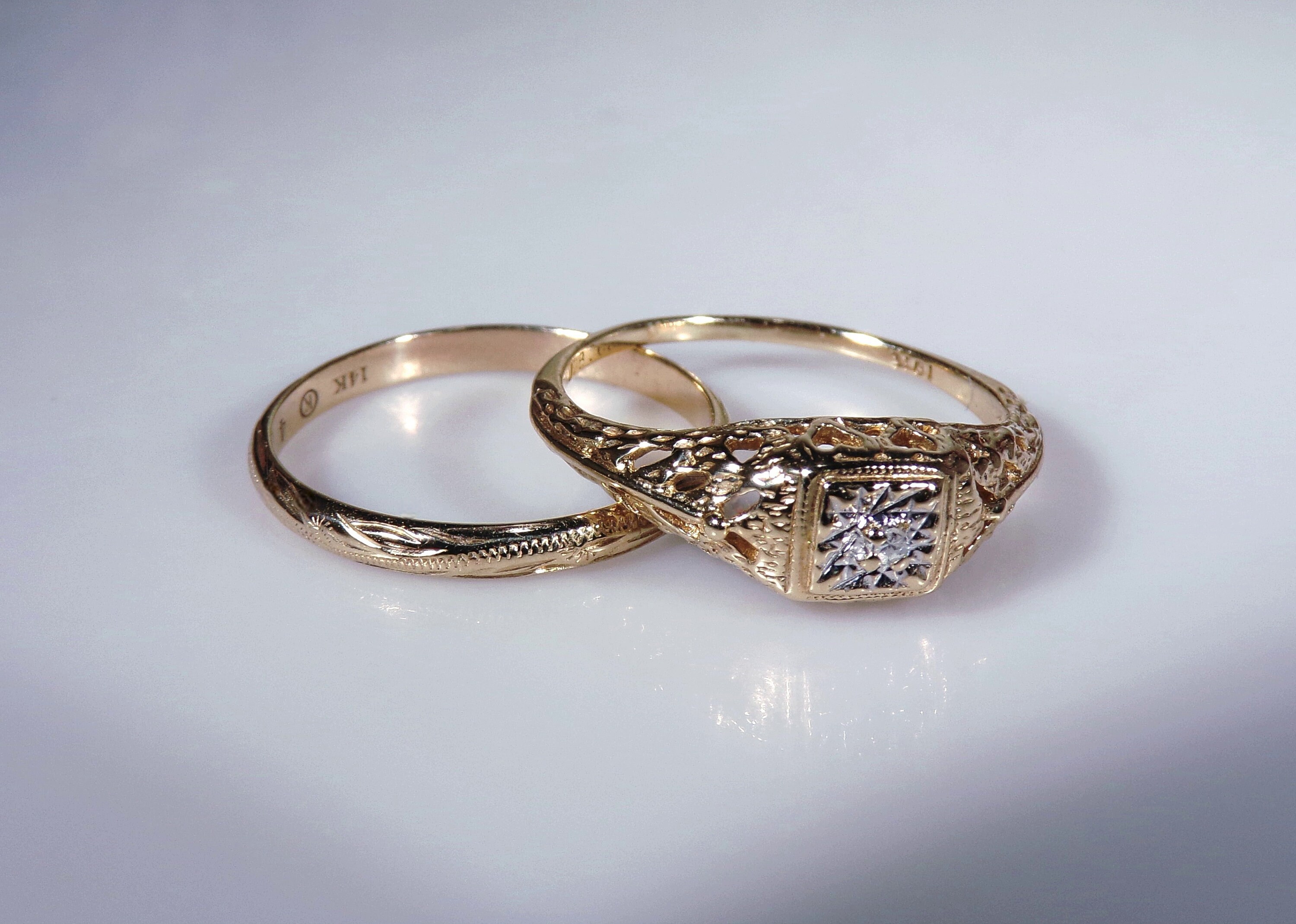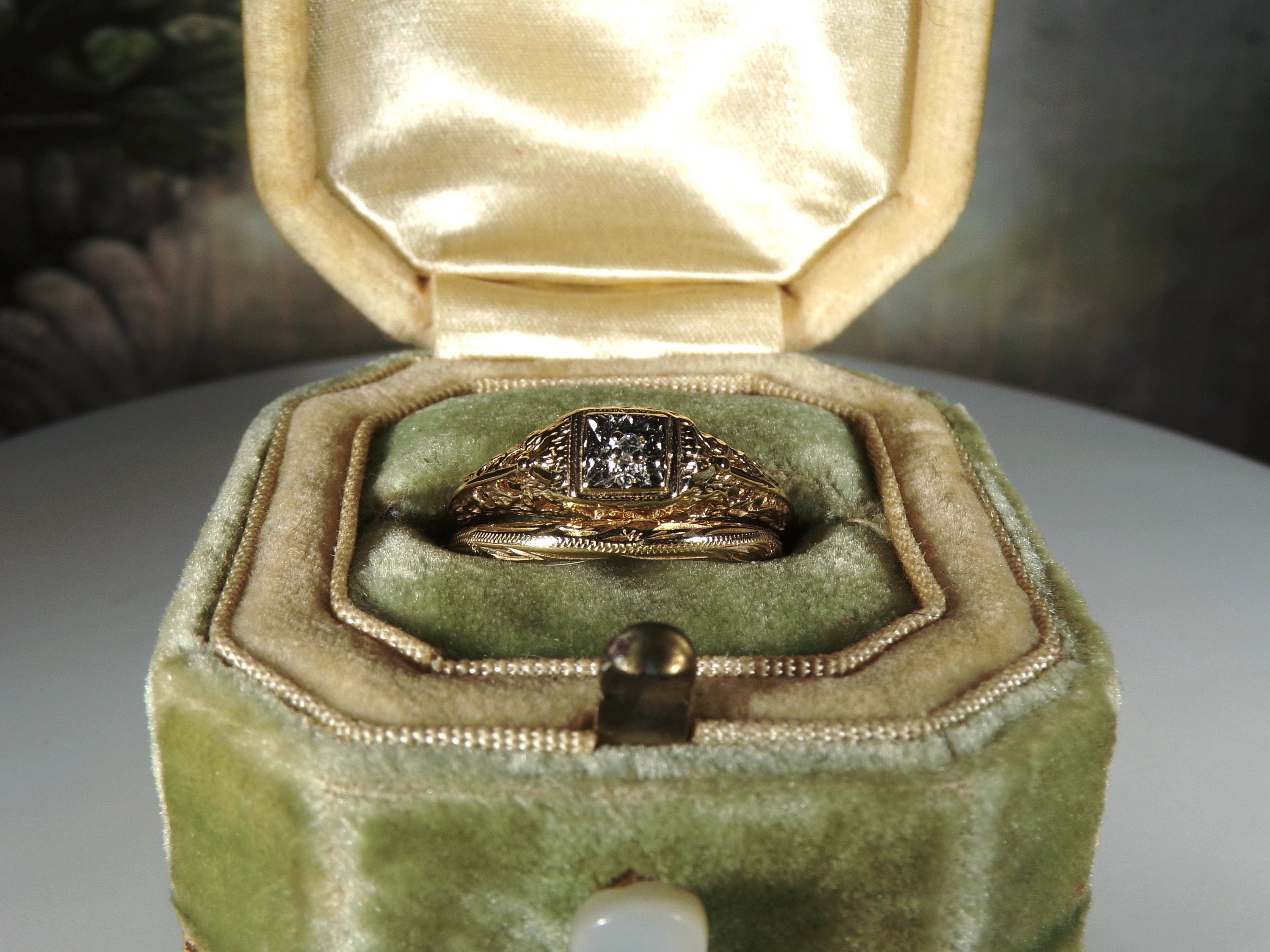 14K & 10K Art Nouveau Bridal Ring Set, Yellow Gold, Filigree Diamond Engagement Ring, Etched Wedding Band, Vintage Wedding Rings, Size 5.75, FREE SIZING!!