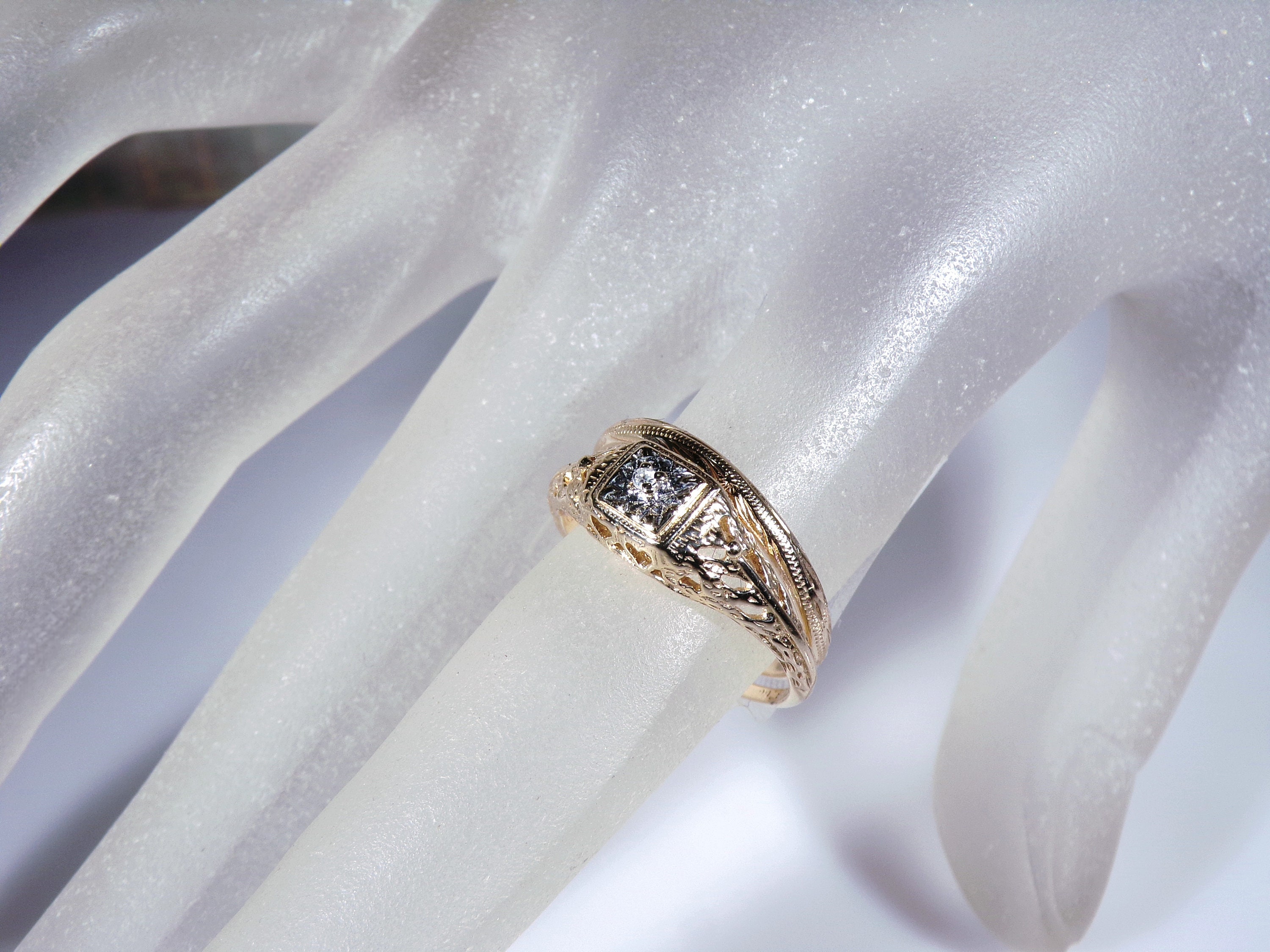 This is a beautiful Art Nouveau Bridal Ring Set that is made of 14K and 10K Yellow Gold. The mounting for the round diamond is White Gold. These two rings work beautifully together and have a very romantic air to them! The Engagement Ring has open metal work where you will find little heart cutouts throughout. Very sweet! And the Etched Wedding Band has a very delicate design of branches and very small leaves and other designs mixed in. This set is a very lovely bridal ring set that is sure to make you smile every day when you look at it!!