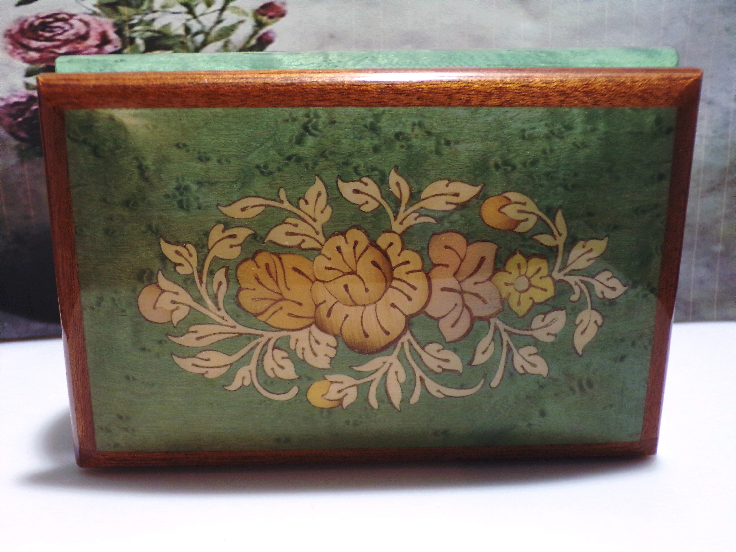 This is a beautiful handcrafted wooden musical jewelry box. This box is made from the finest Elm Burl Wood and the design on the cover is intricately inlaid wood to create the floral design. The background is a lovely sage green with the floral design having beige and peachy colors. Inside, the jewelry box is cut in half where one have has a space for small jewelry and the other side is the mechanism for the musical song that it plays when the lid is opened. The side for jewelry is covered in a velveteen fabric.