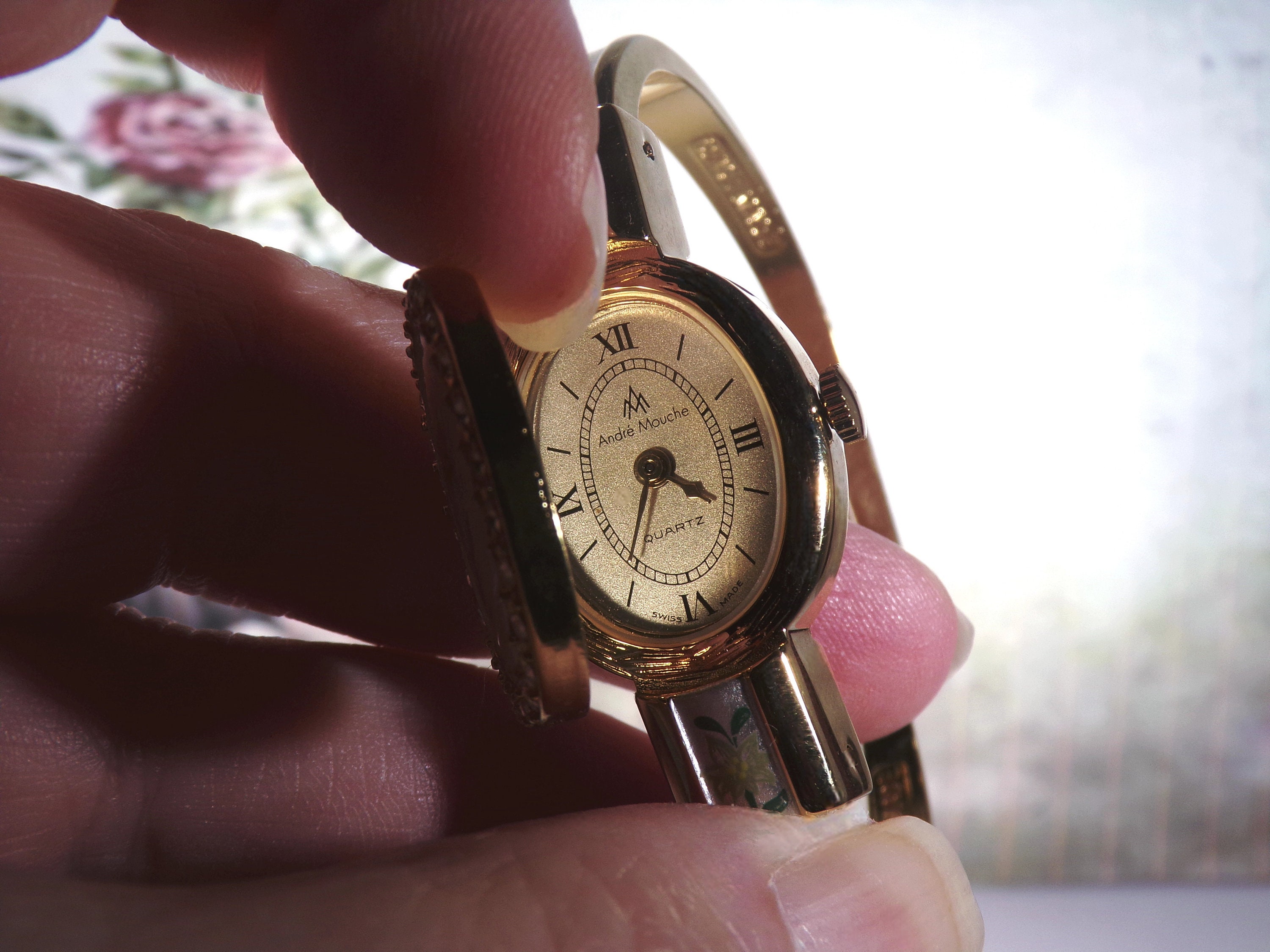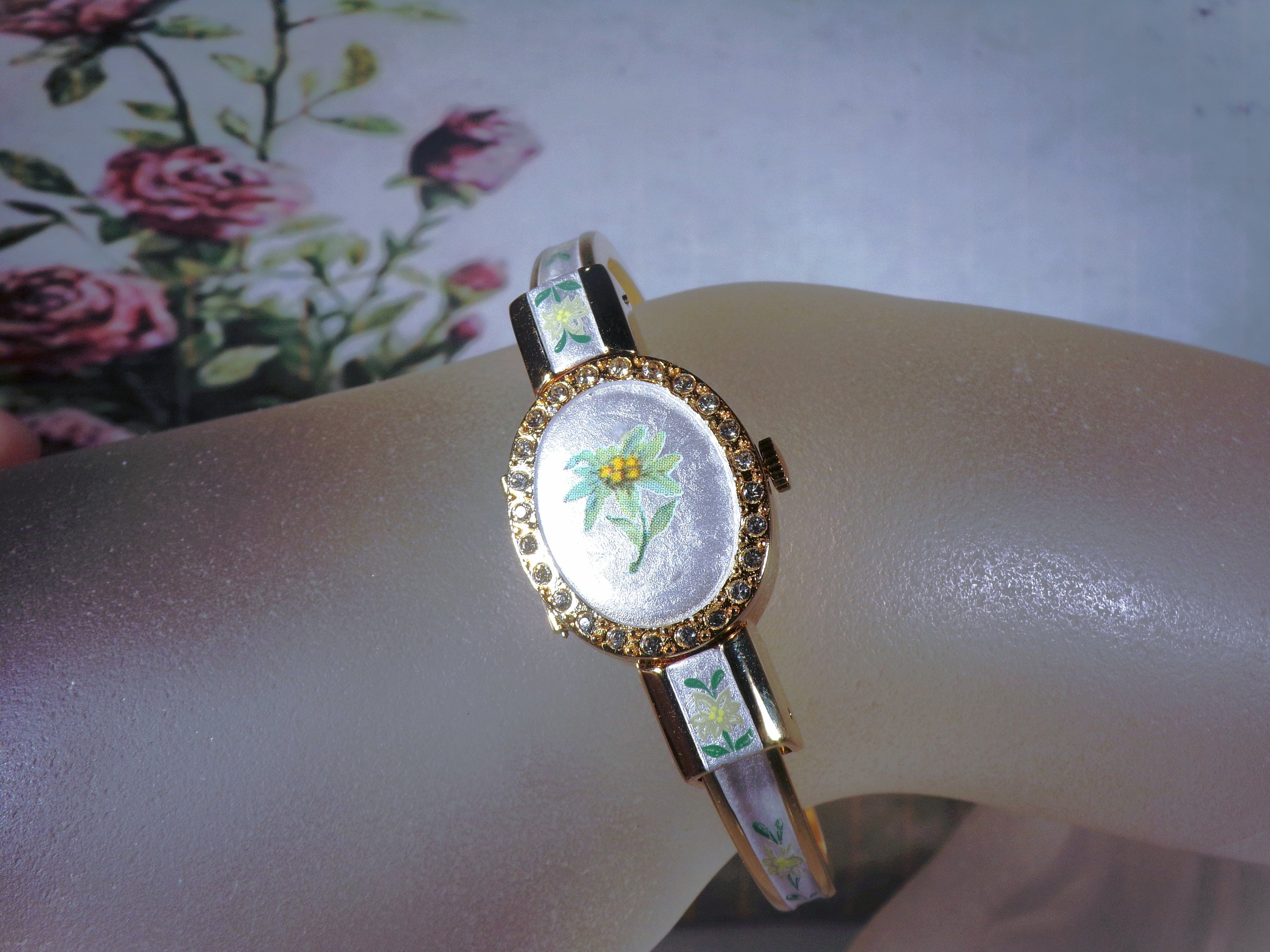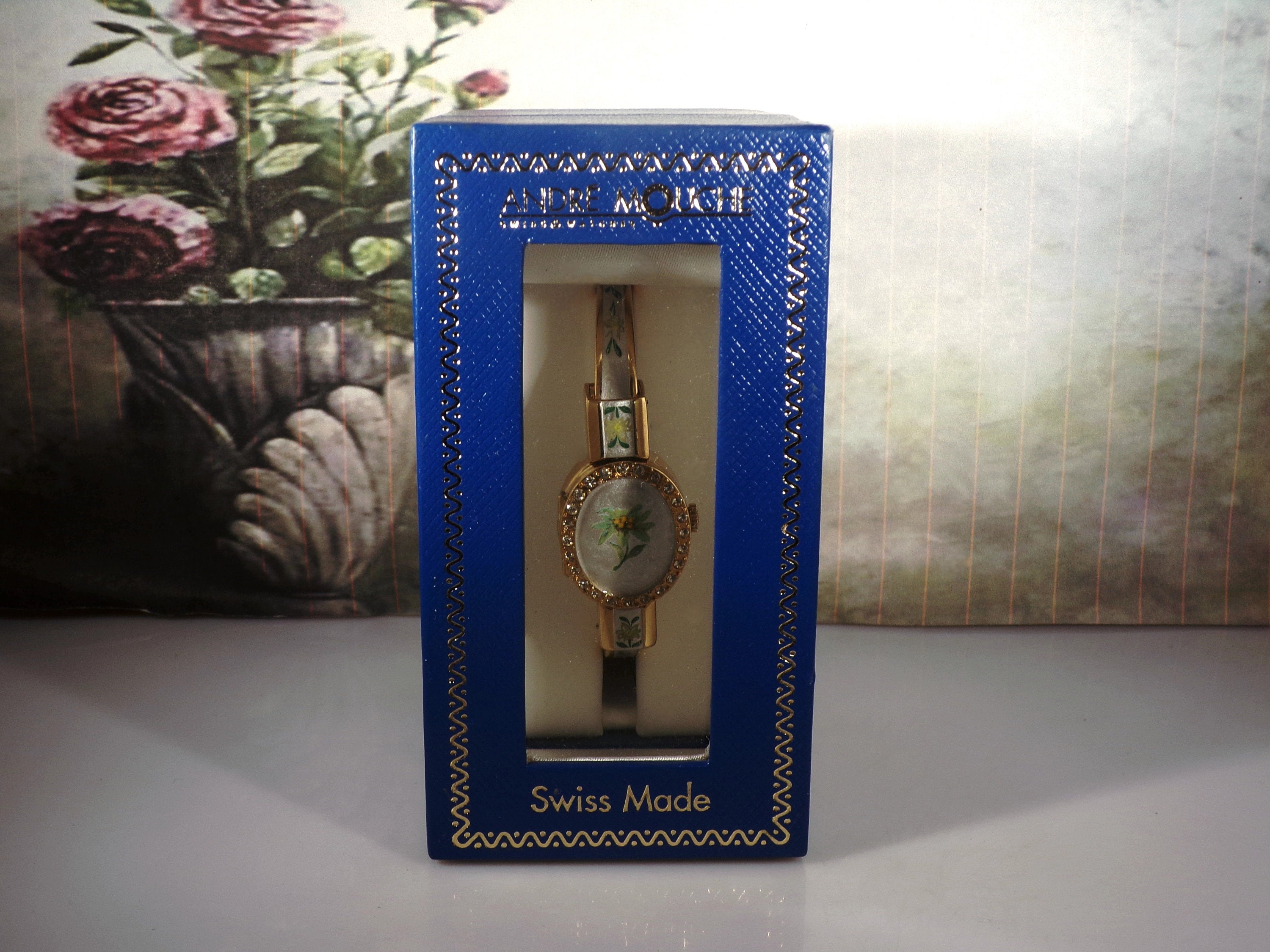 Swiss Made ANDRE MOUCHE Bangle Wrist Watch, Edelweiss Design with a Guilloche White Enamel Background, Hidden Watch w/ Spring Loaded Cover, Vintage Wristwatch