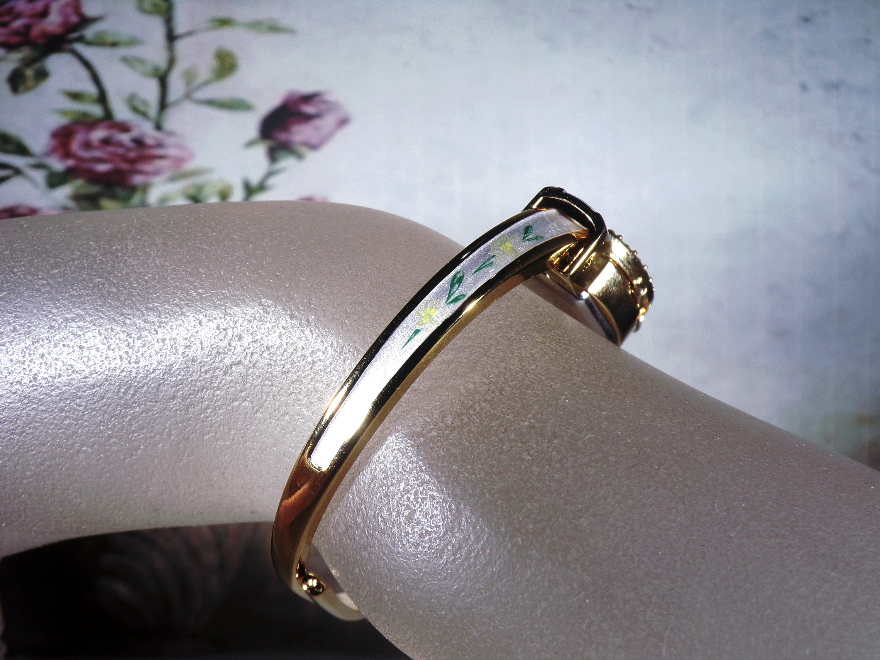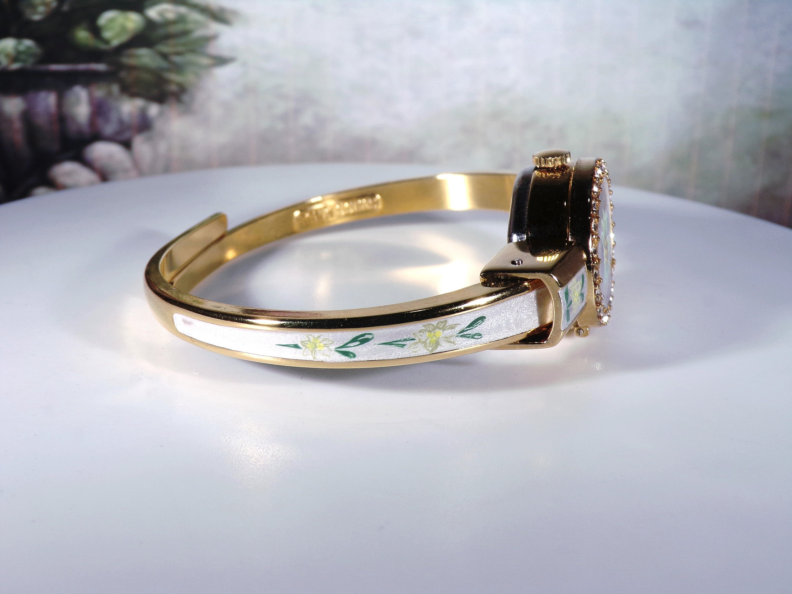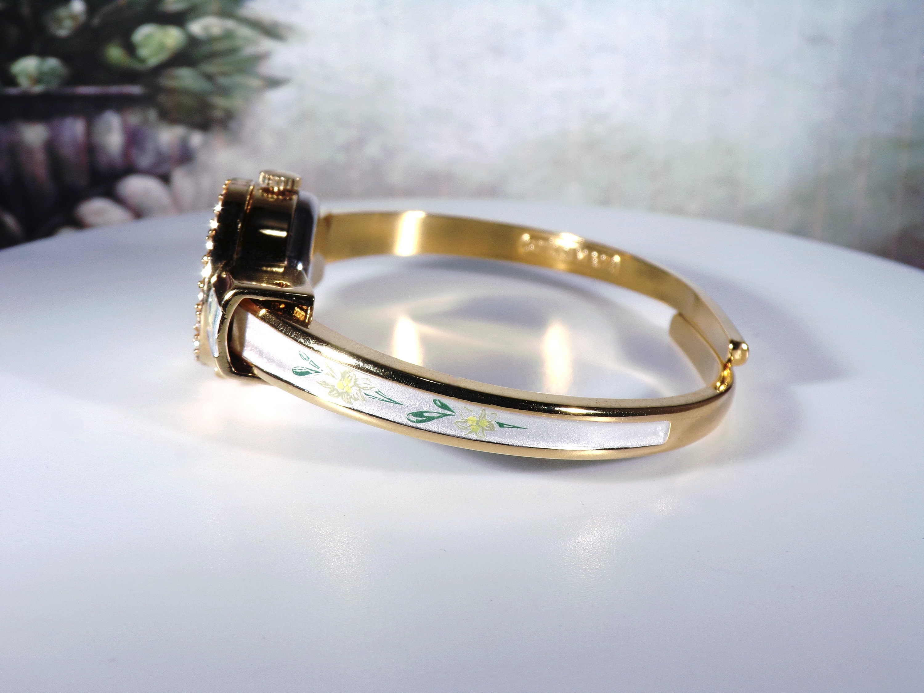 This is a beautiful Gold-Plated Spring-Loaded Bangle Wrist Watch that has White Guilloche Enameling with a lovely Greenish yellow Edelweiss Transfer Print on the cover of the face of the watch. There are also smaller Edelweiss prints that go down each side of the bangle. Around the face of the bangle, it is haloed with lovely clear round crystals. Very beautiful and very feminine!!