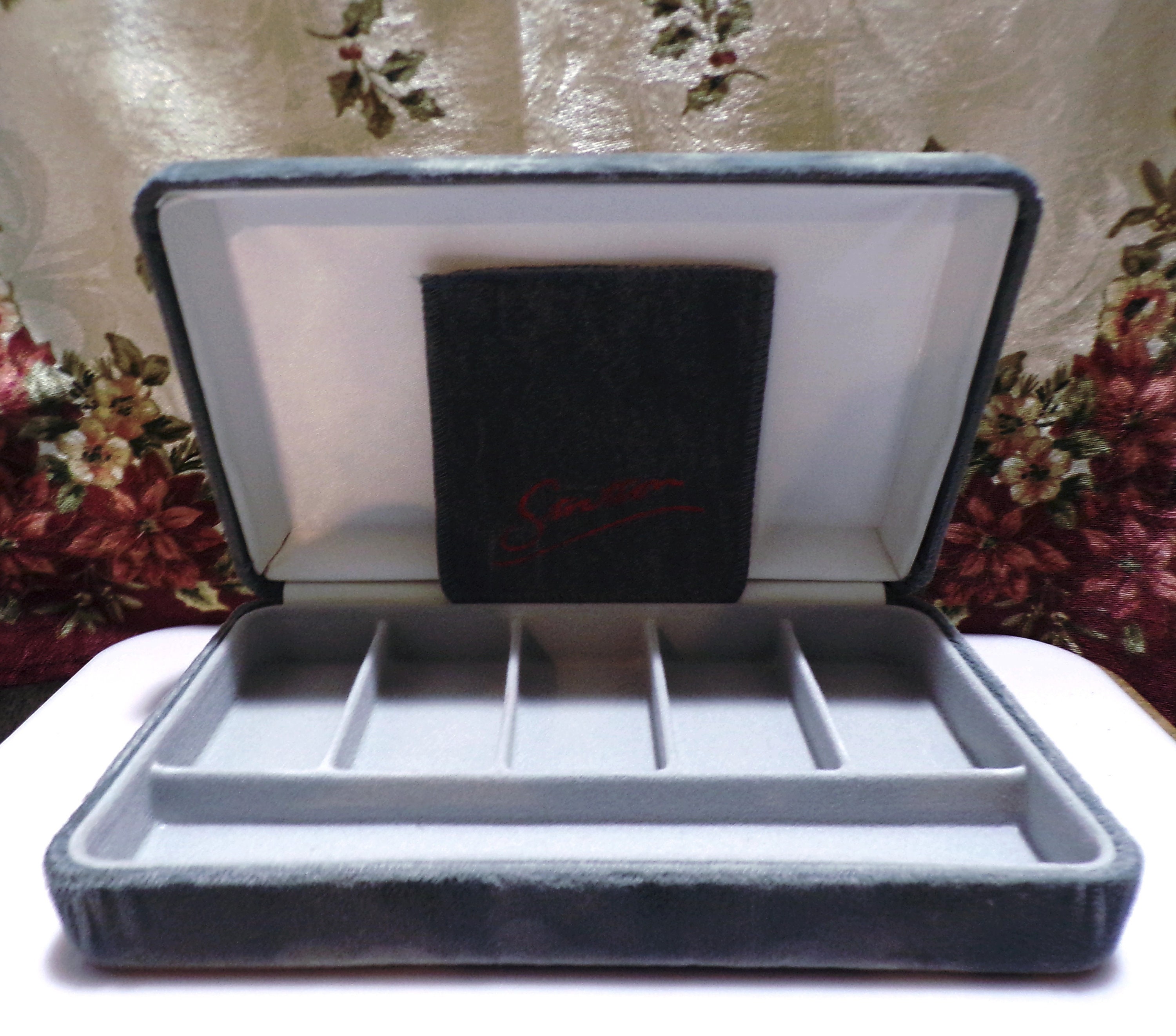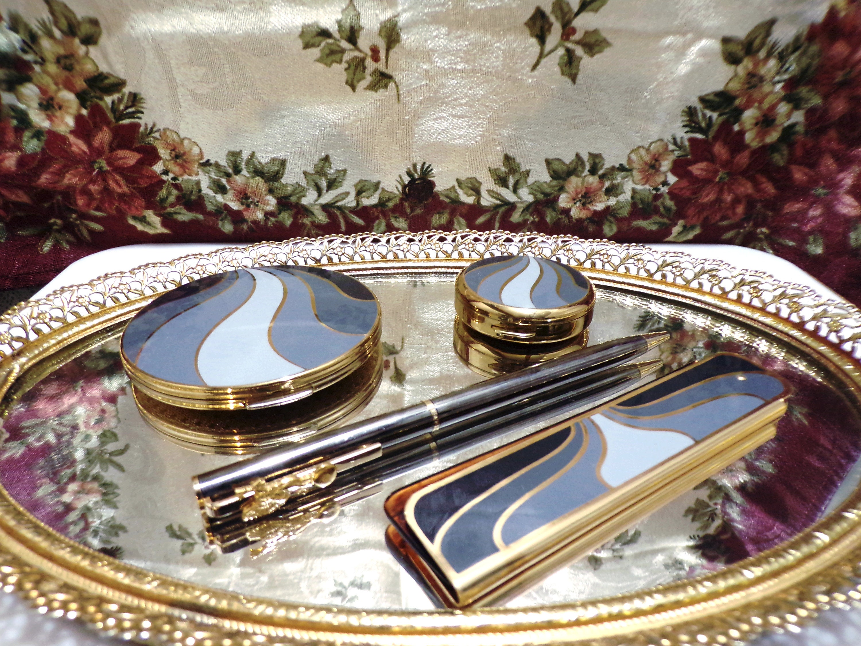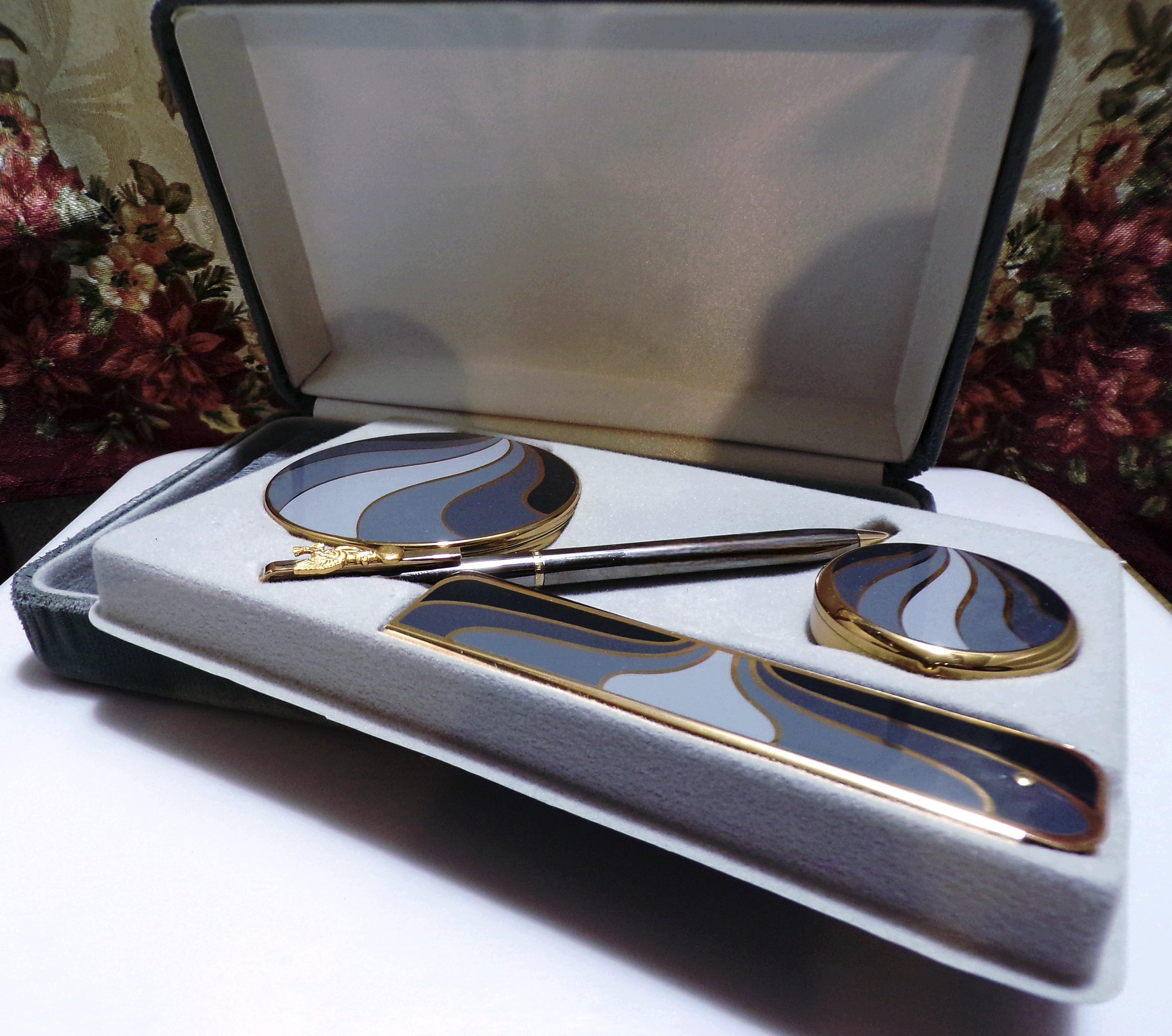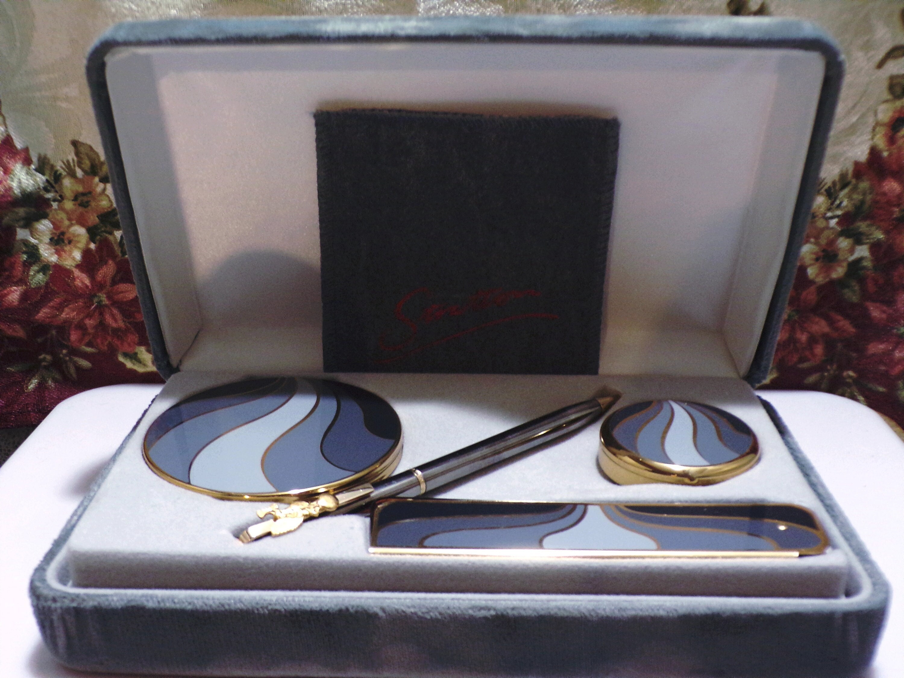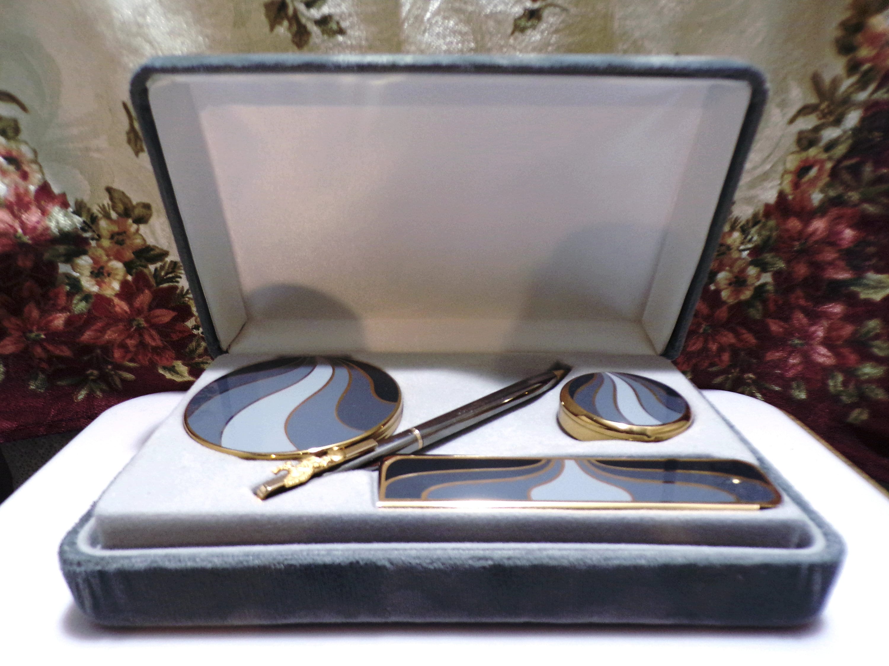 This is a beautiful 4-piece compact set with a Mod Cloisonne Enamel Design that is set within a Jewelry Box as its first layer. The set consists of a Double Mirror Compact; a Pill Box; a Folding Comb and a Writing Pen. This set is set within a very nice jewelry box; simply lift the insert to find the jewelry box that has organized spaces and slots to help keep your jewelry organized. There is also a nice cloth sleeve provided where you can slip the double compact mirror into and then place it in your purse so that it doesn't get damaged. The coloring of the set is variations of Gray and Blue that is done is a wave with gold cloisonne design work between each colored wave. Very elegant and very beautiful!