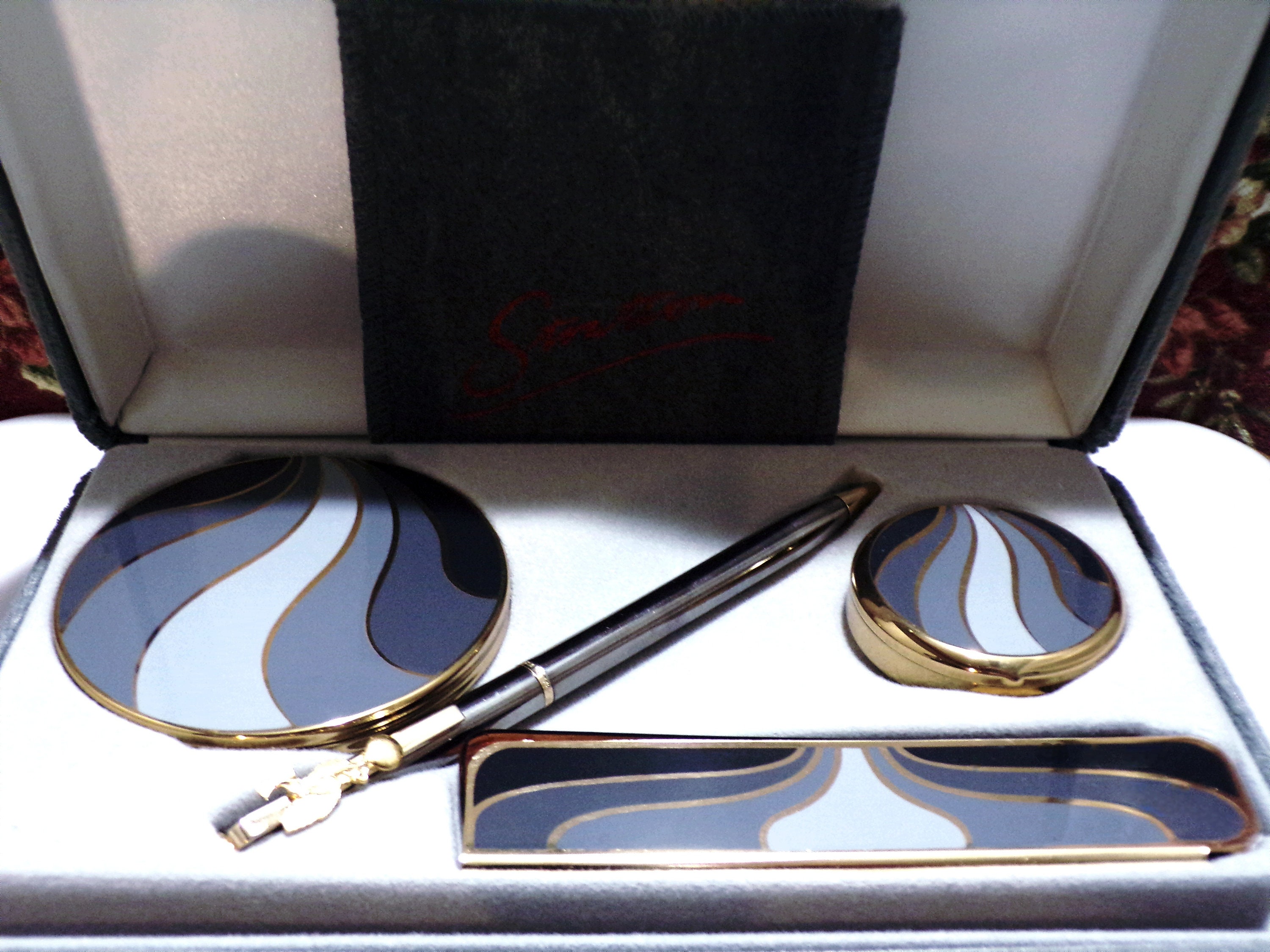 STRATTON Compact Set, 4 Piece Set with a Velveteen Jewelry Box, Double Mirror Compact, Pill Box, Folding Comb, Writing Pen, Vintage Compacts