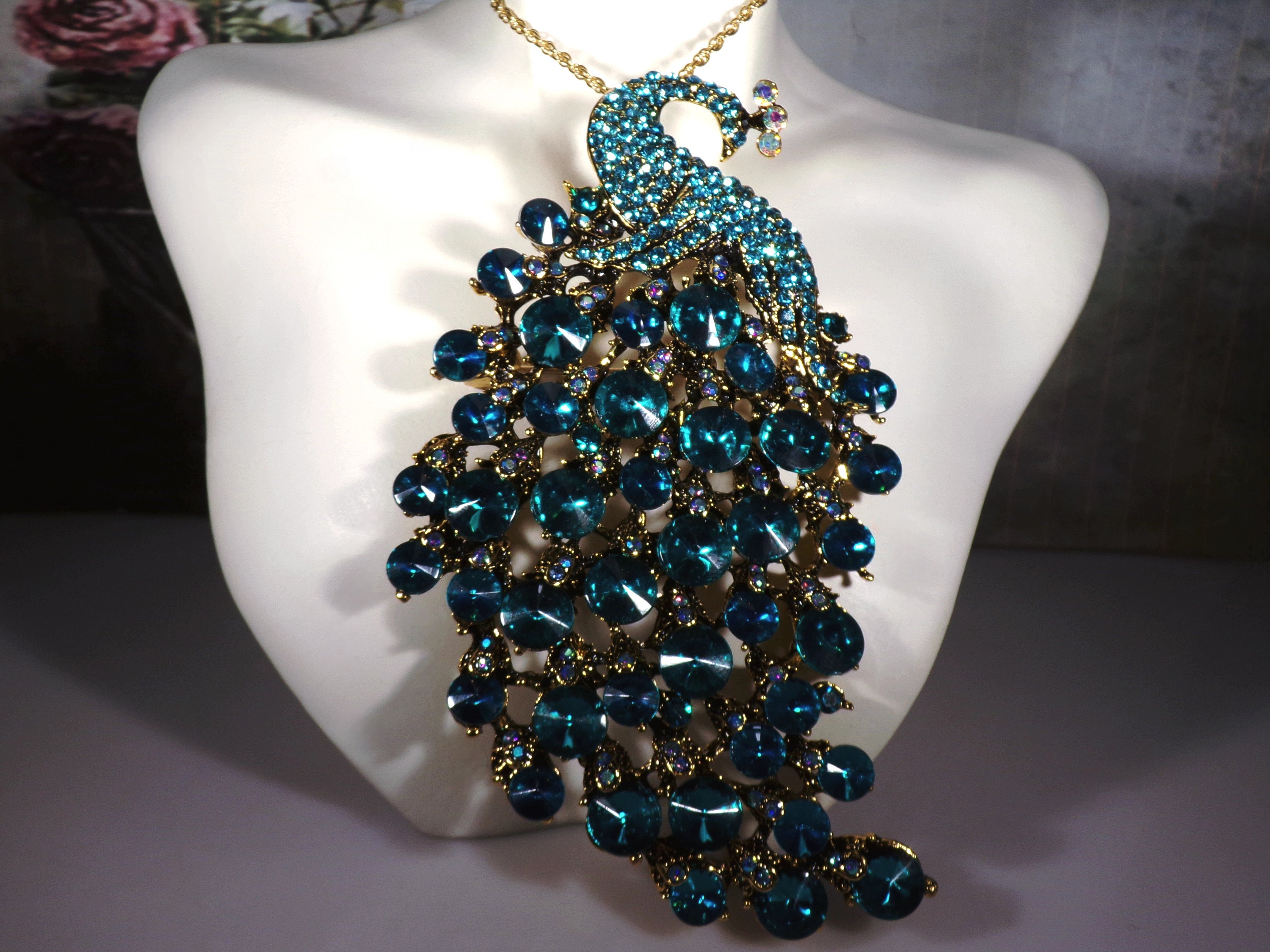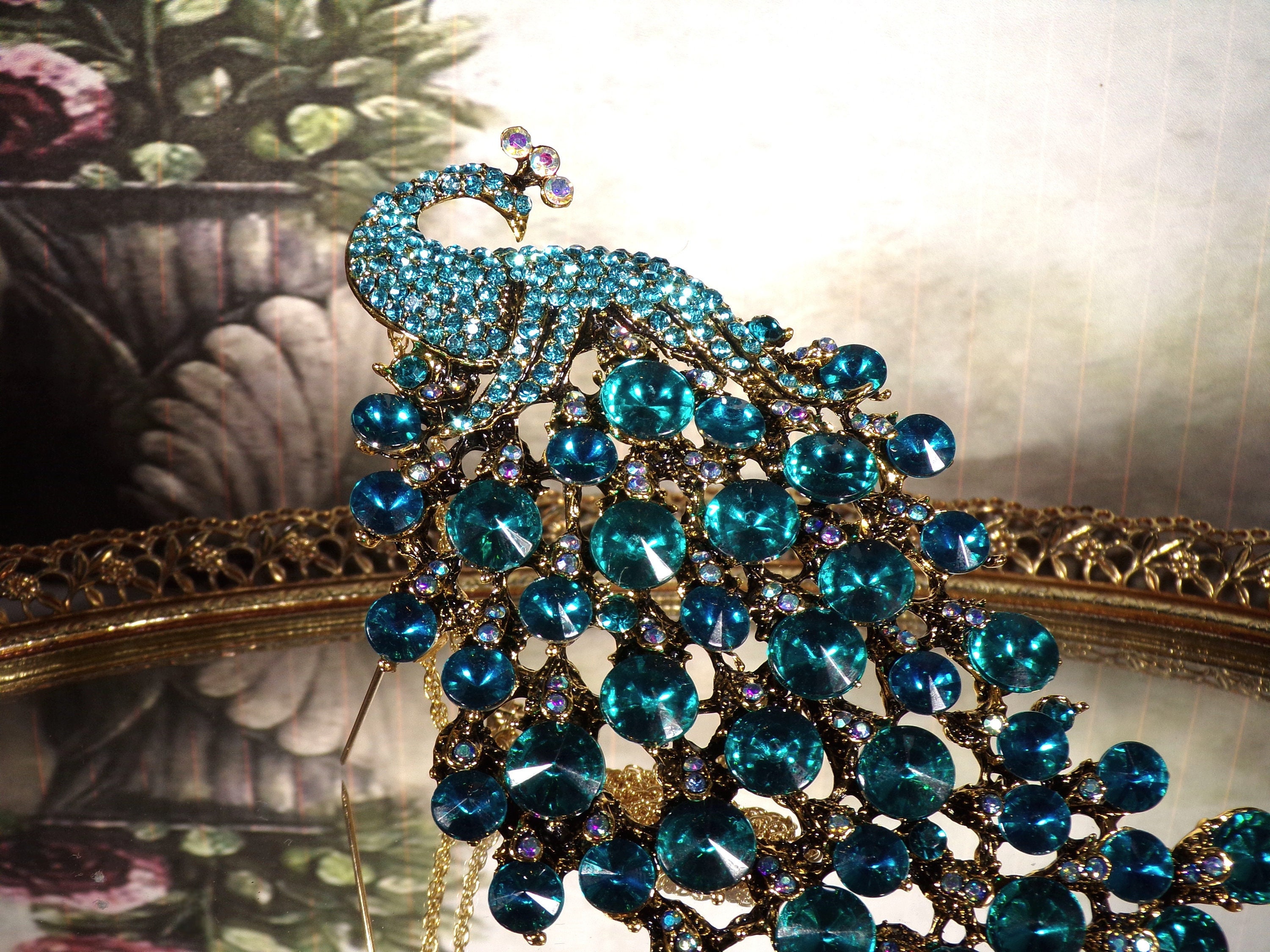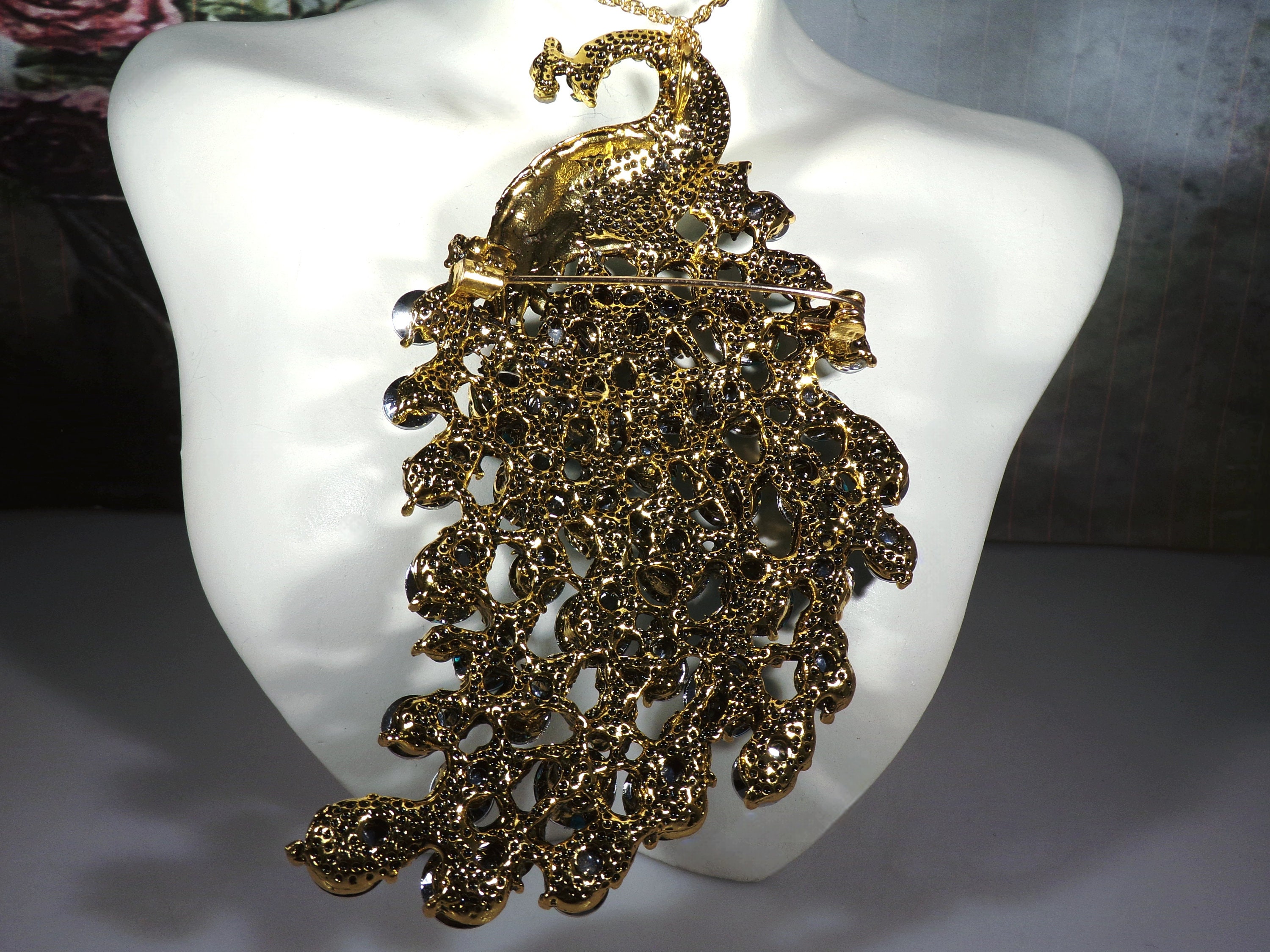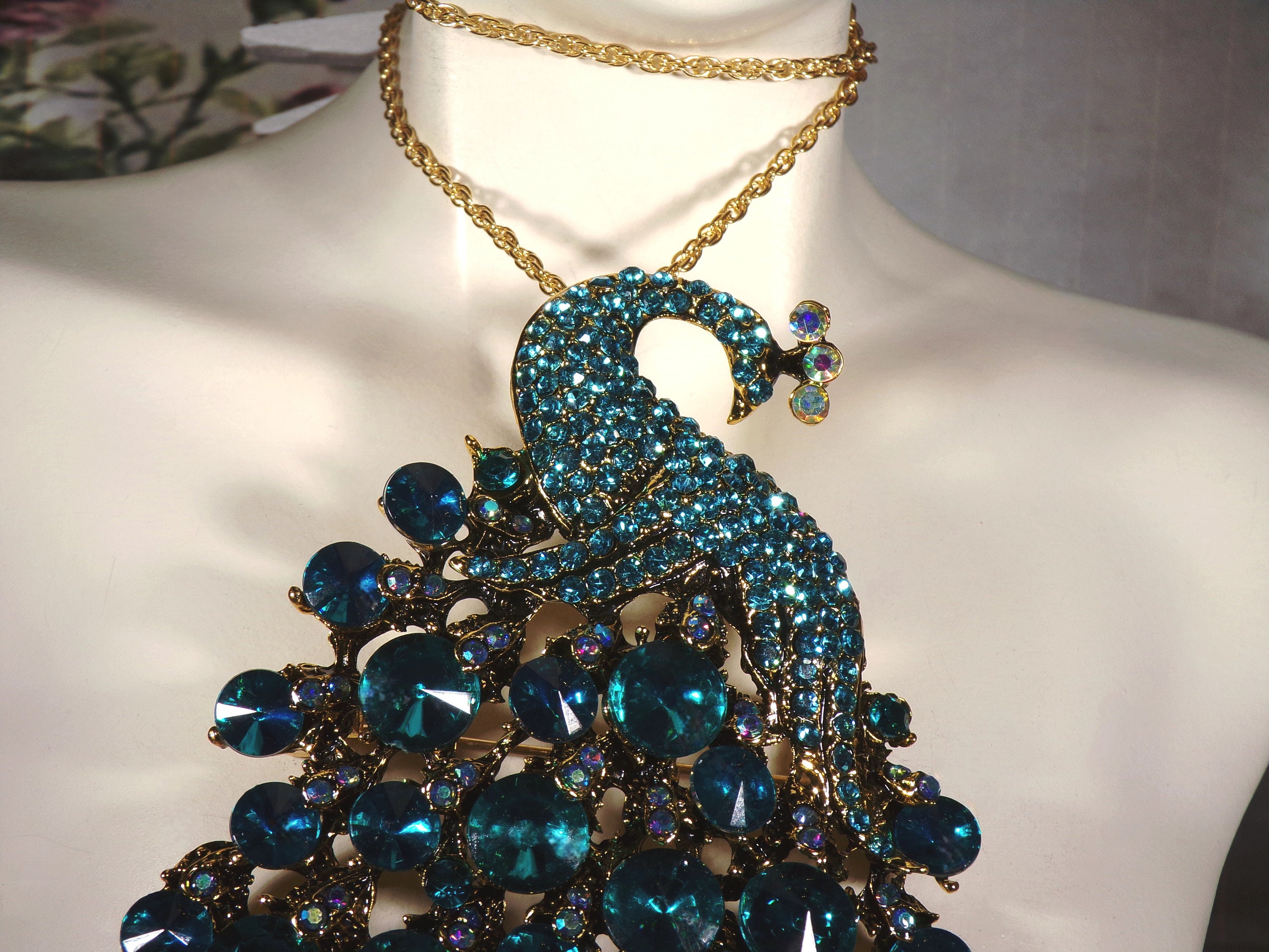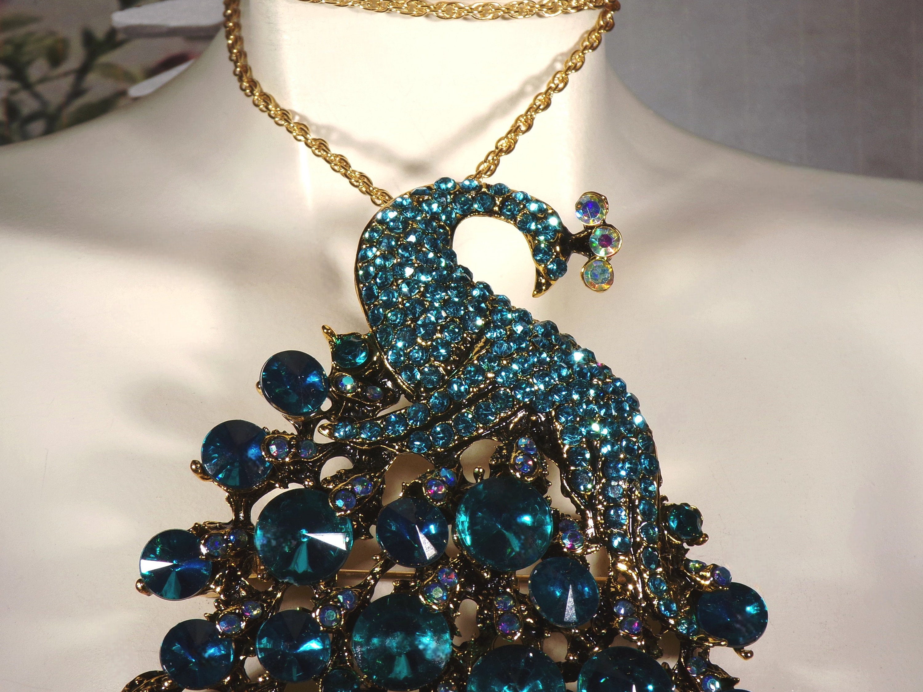 Large Vintage Bluish – Teal Peacock Convertible Brooch & Pendant, 20 Inch Cable Chain, Rivoli Rhinestones, 4 Inch Brooch
