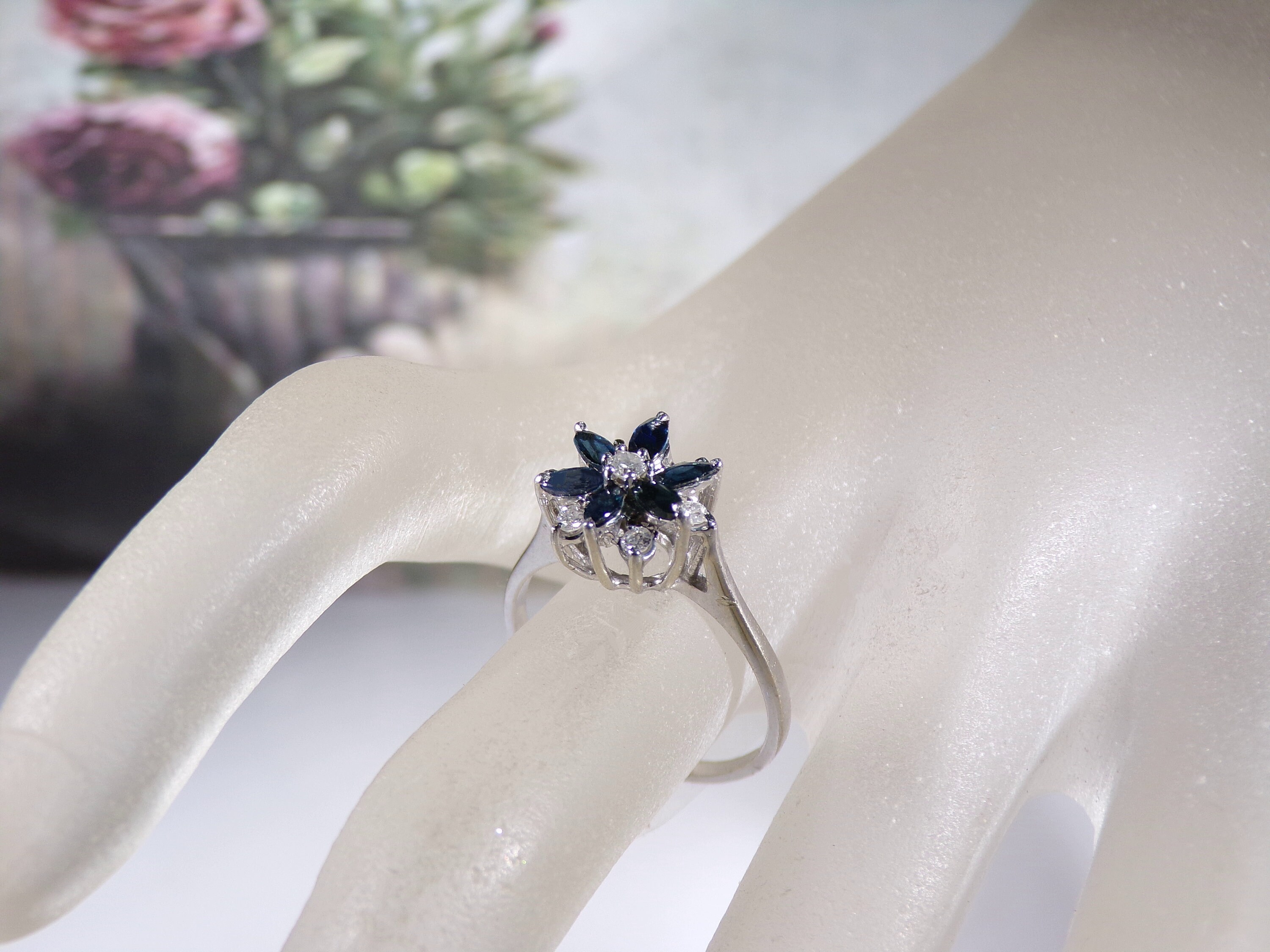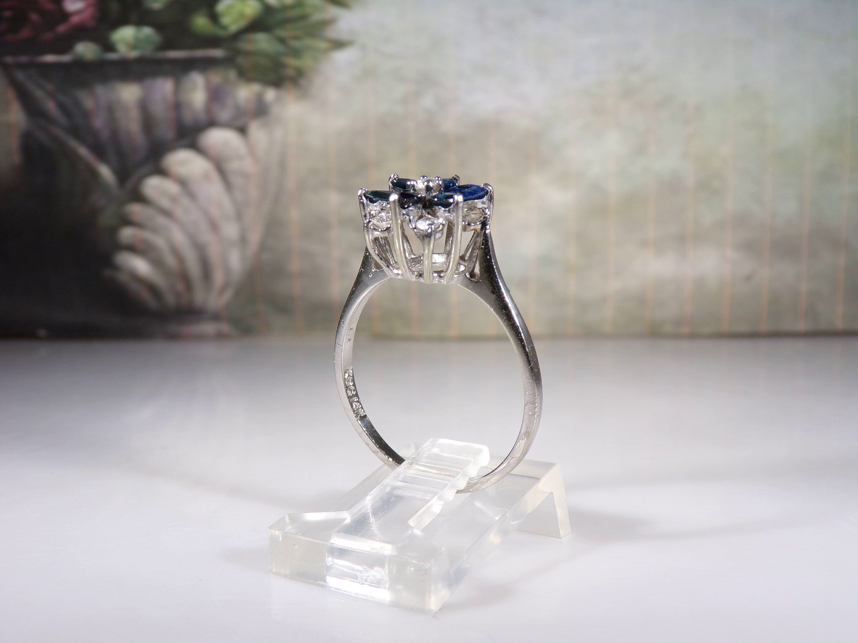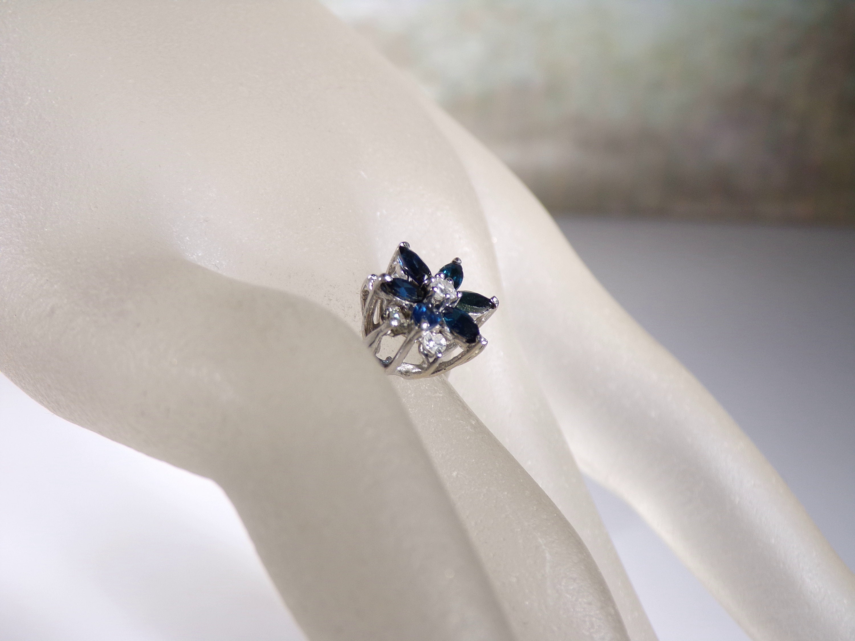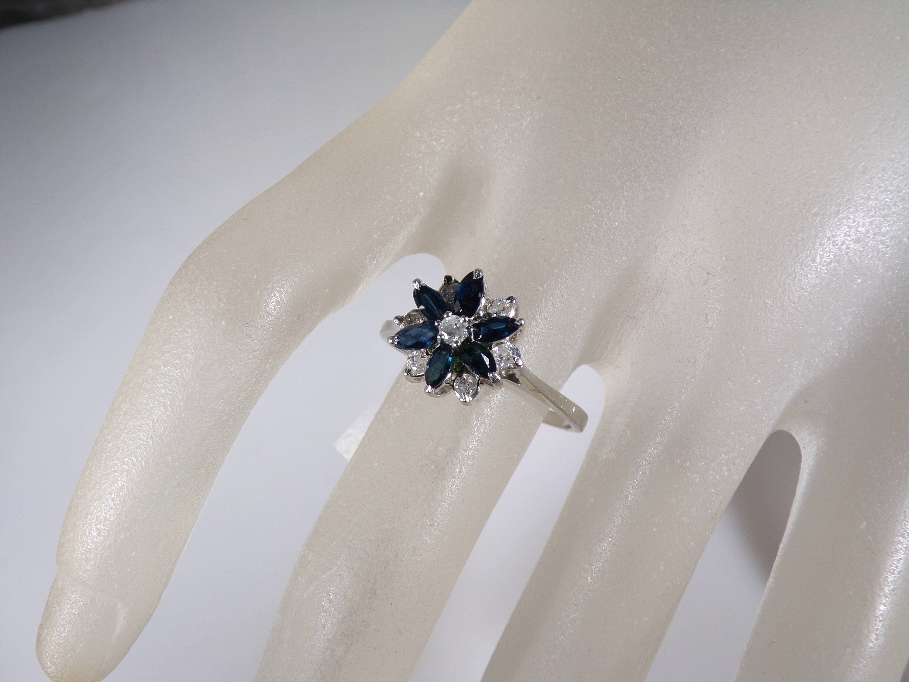 14K White Gold Blue Sapphire & Diamond Flower Design Ring, Genuine Marquise Sapphires and Round Diamonds, Vintage Ring, Size 8, FREE SIZING!