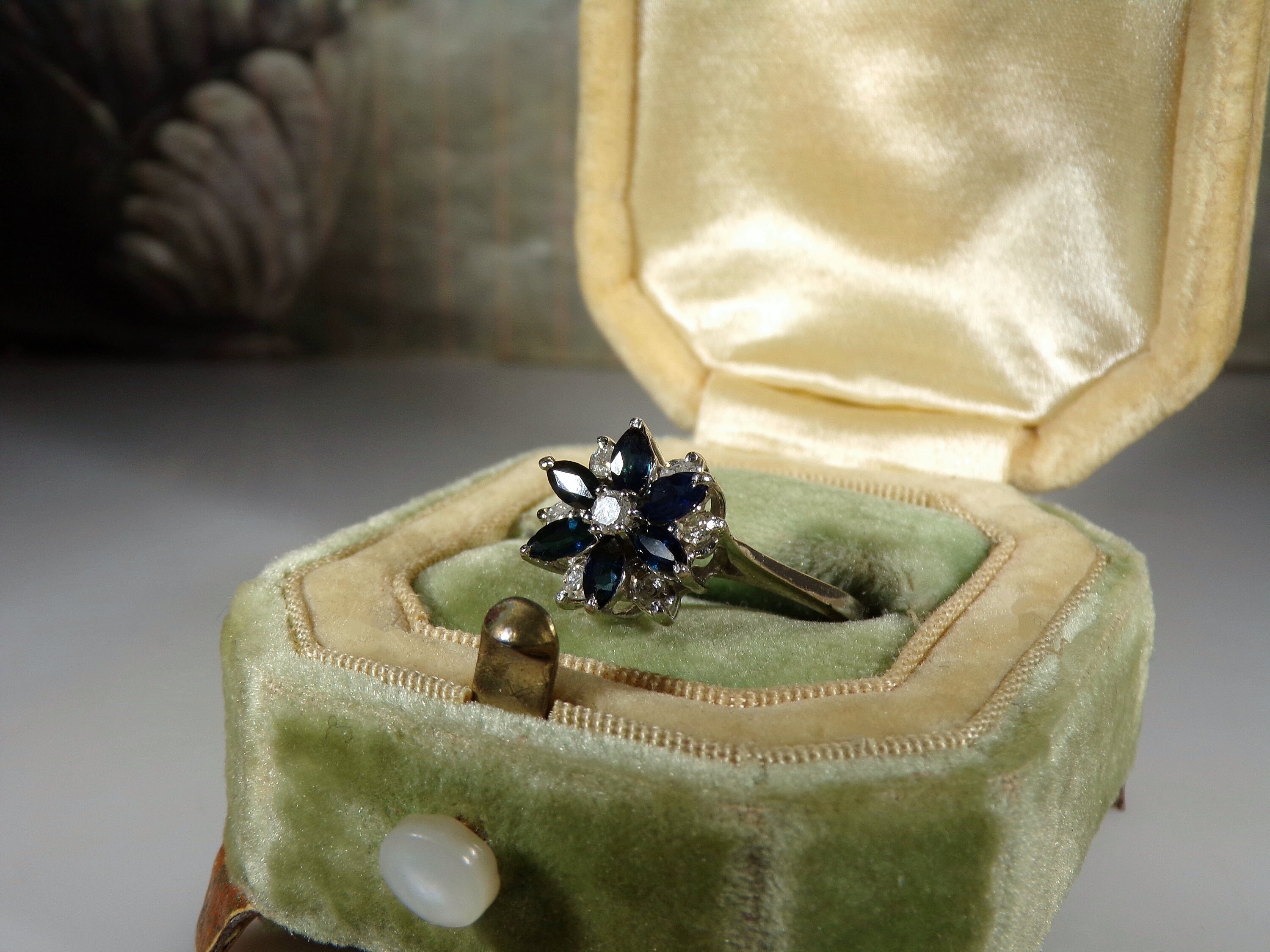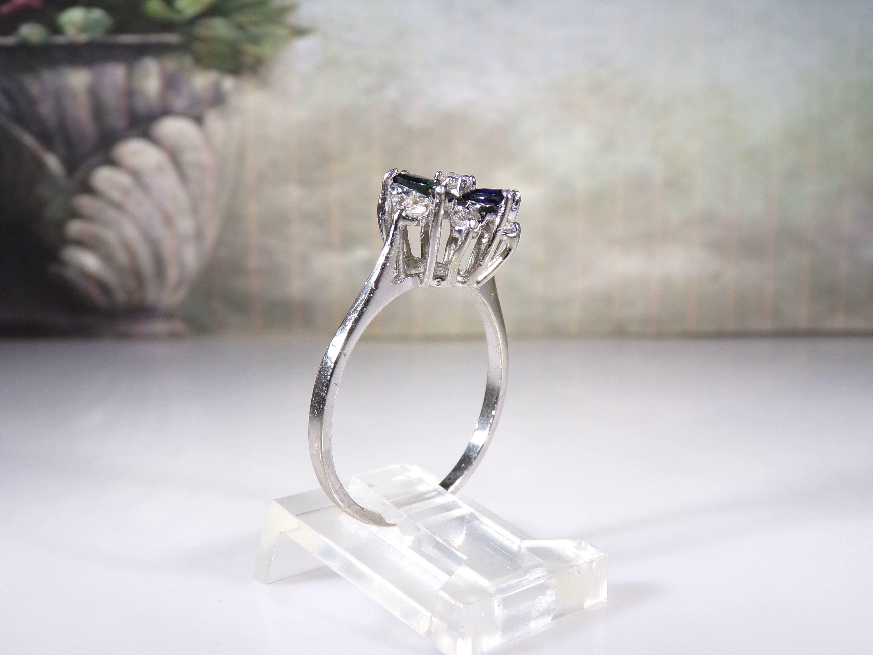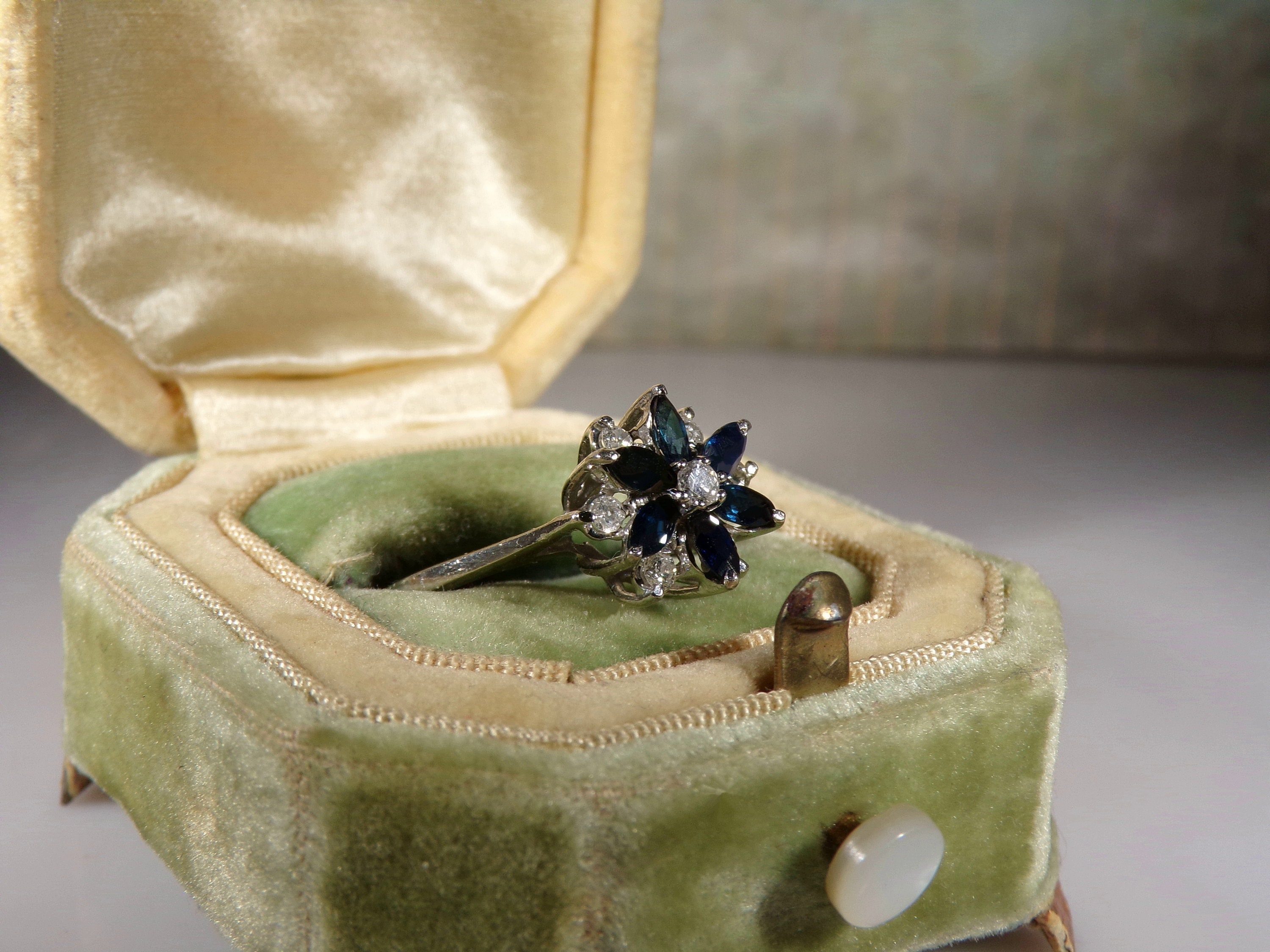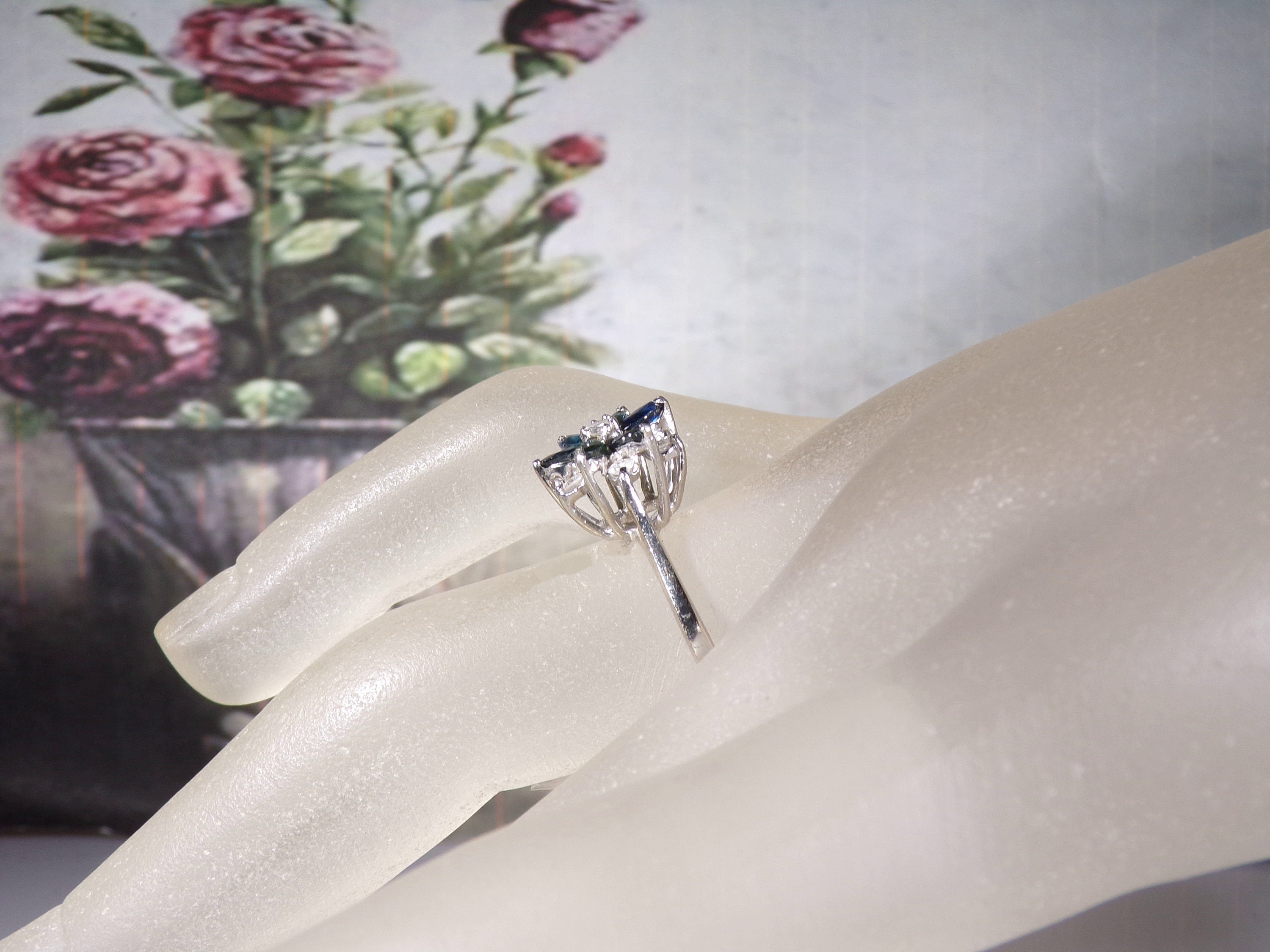 14K White Gold Blue Sapphire & Diamond Flower Design Ring, Genuine Marquise Sapphires and Round Diamonds, Vintage Ring, Size 8, FREE SIZING!