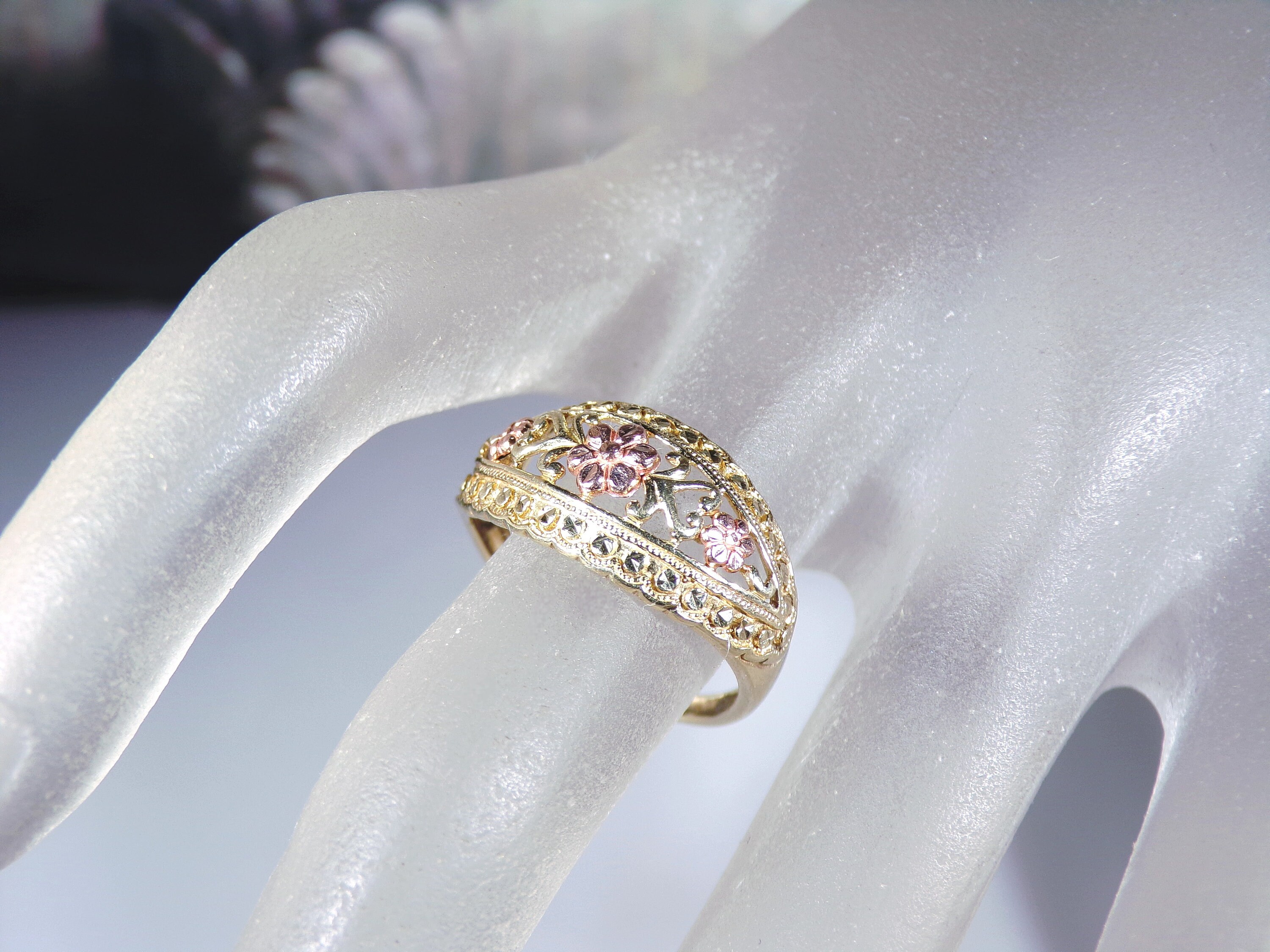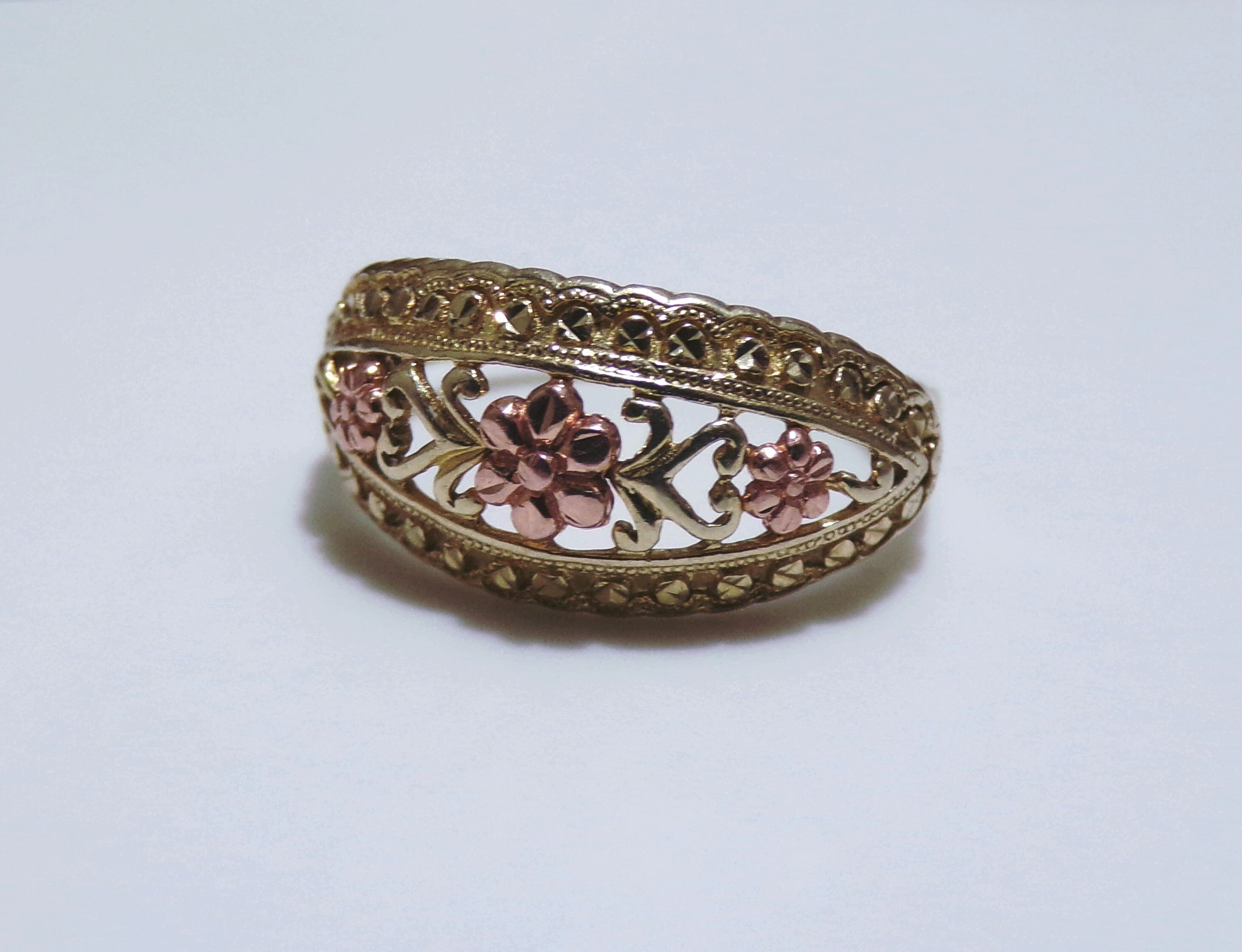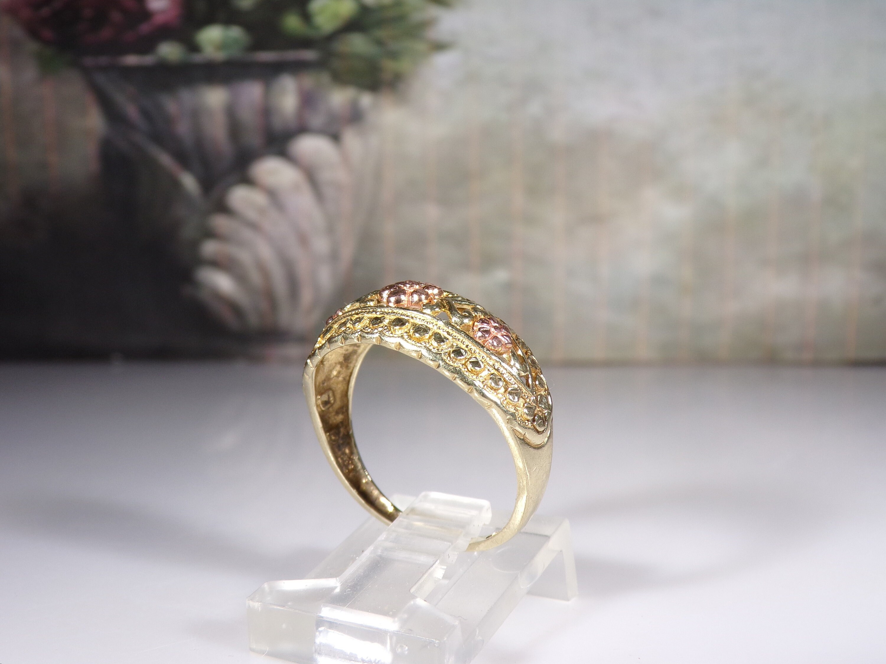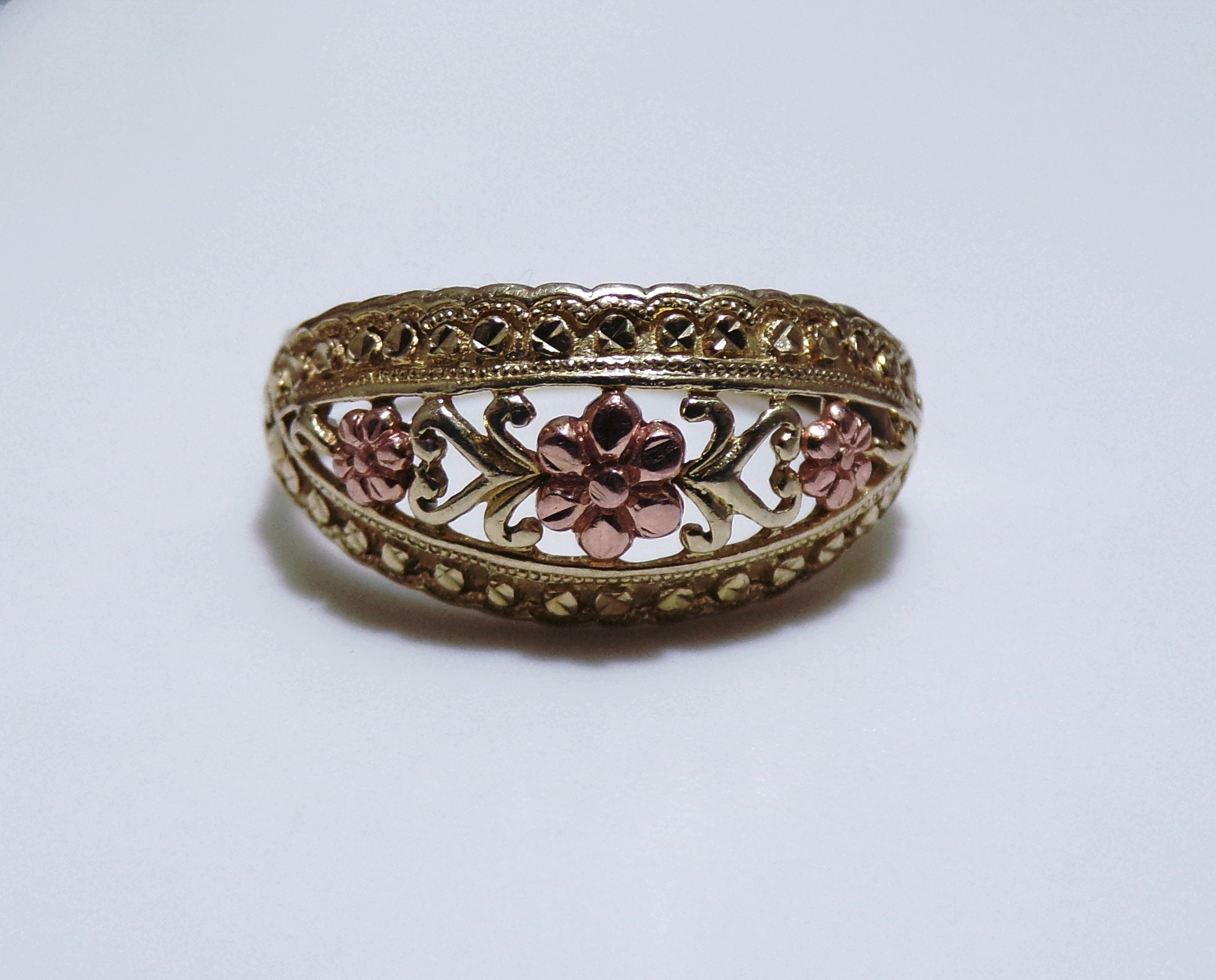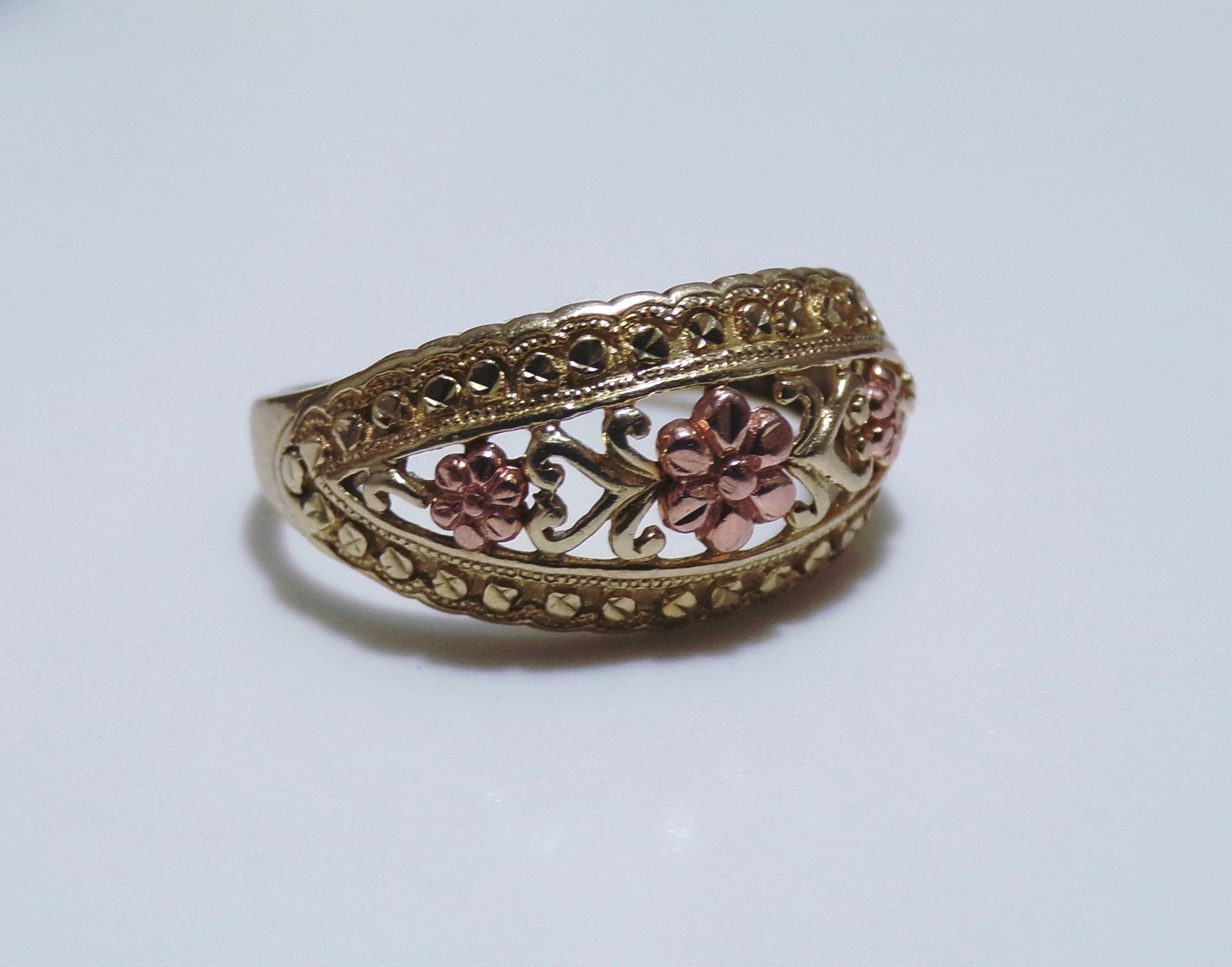 10K Yellow and Rose Gold Floral Dome Band Ring, Artisan Made, Rose Gold Flower Ring, Yellow Gold Band Ring, Dome Ring, Size 7, Vintage Ring, FREE SIZING!!