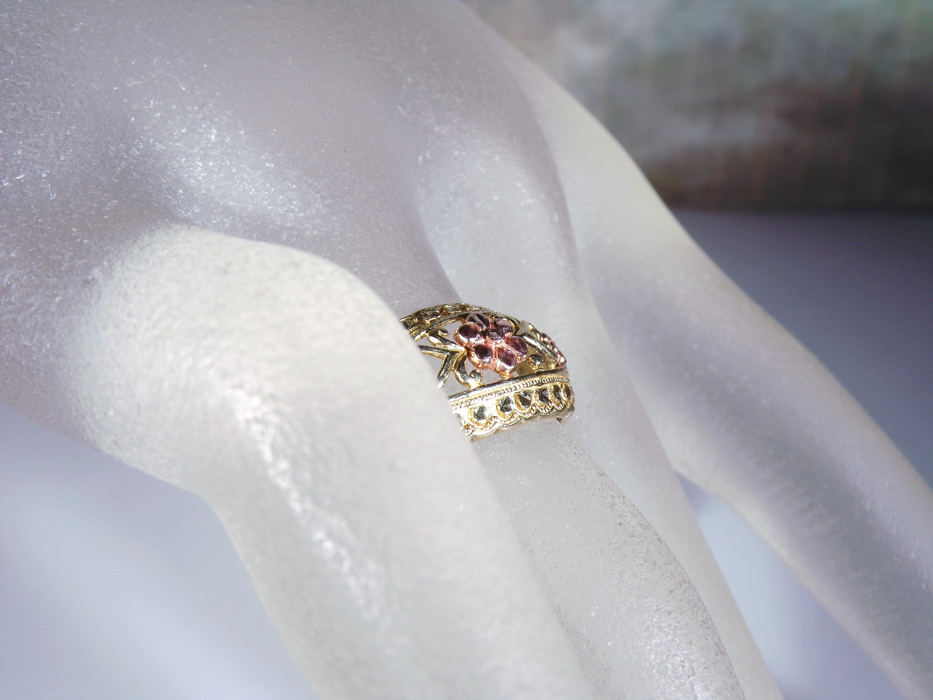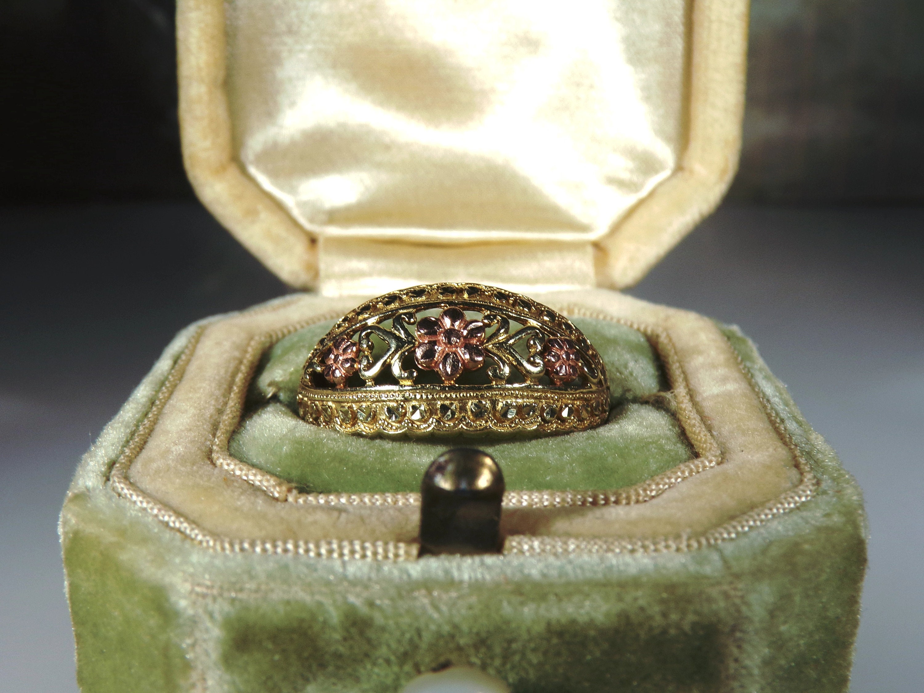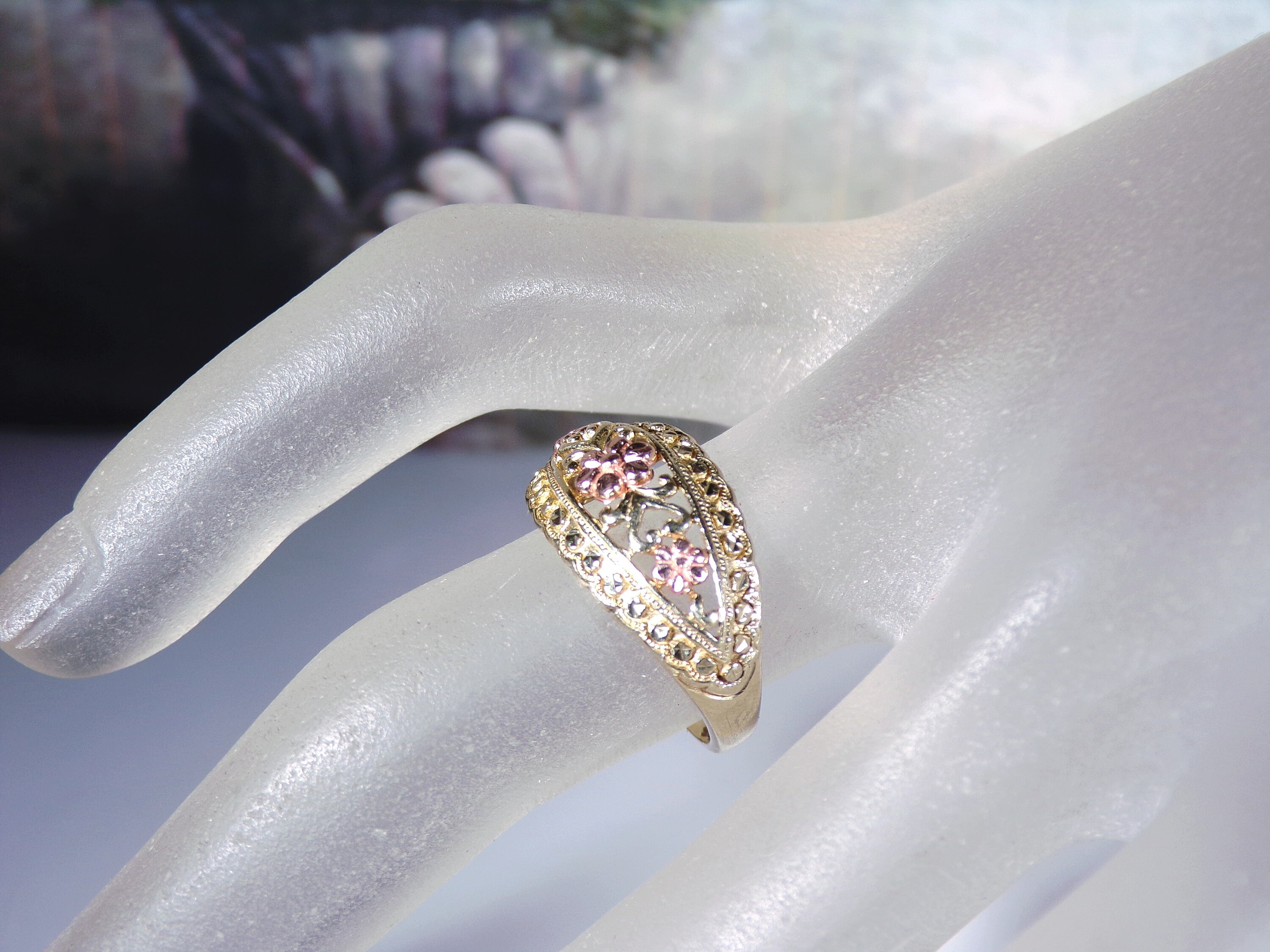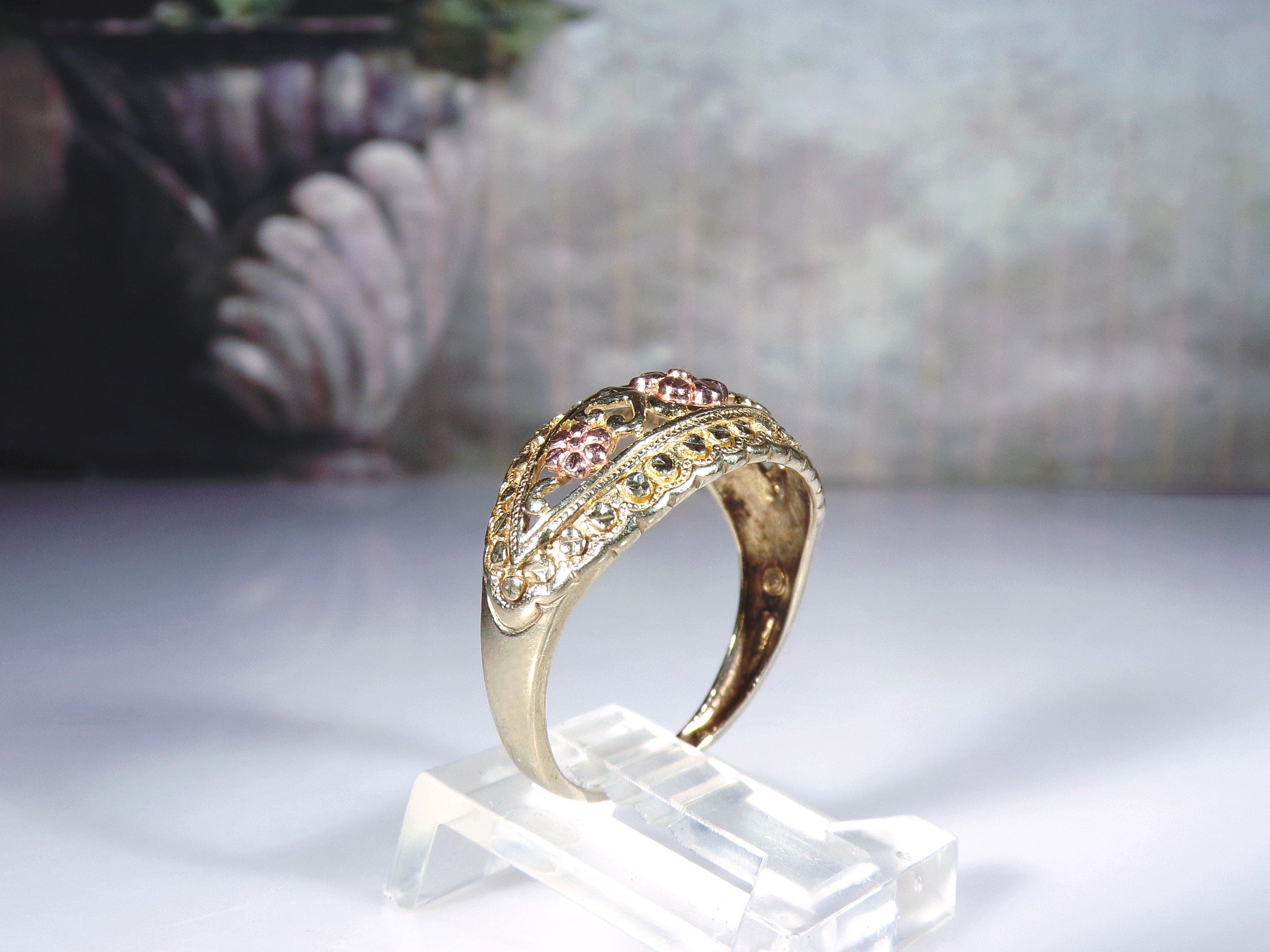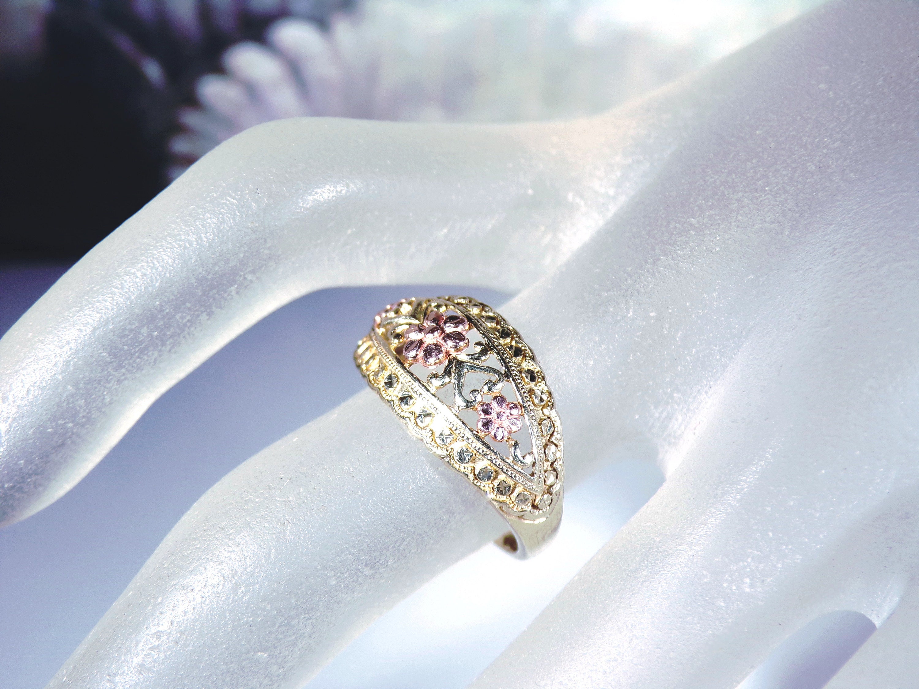 10K Yellow and Rose Gold Floral Dome Band Ring, Artisan Made, Rose Gold Flower Ring, Yellow Gold Band Ring, Dome Ring, Size 7, Vintage Ring, FREE SIZING!!