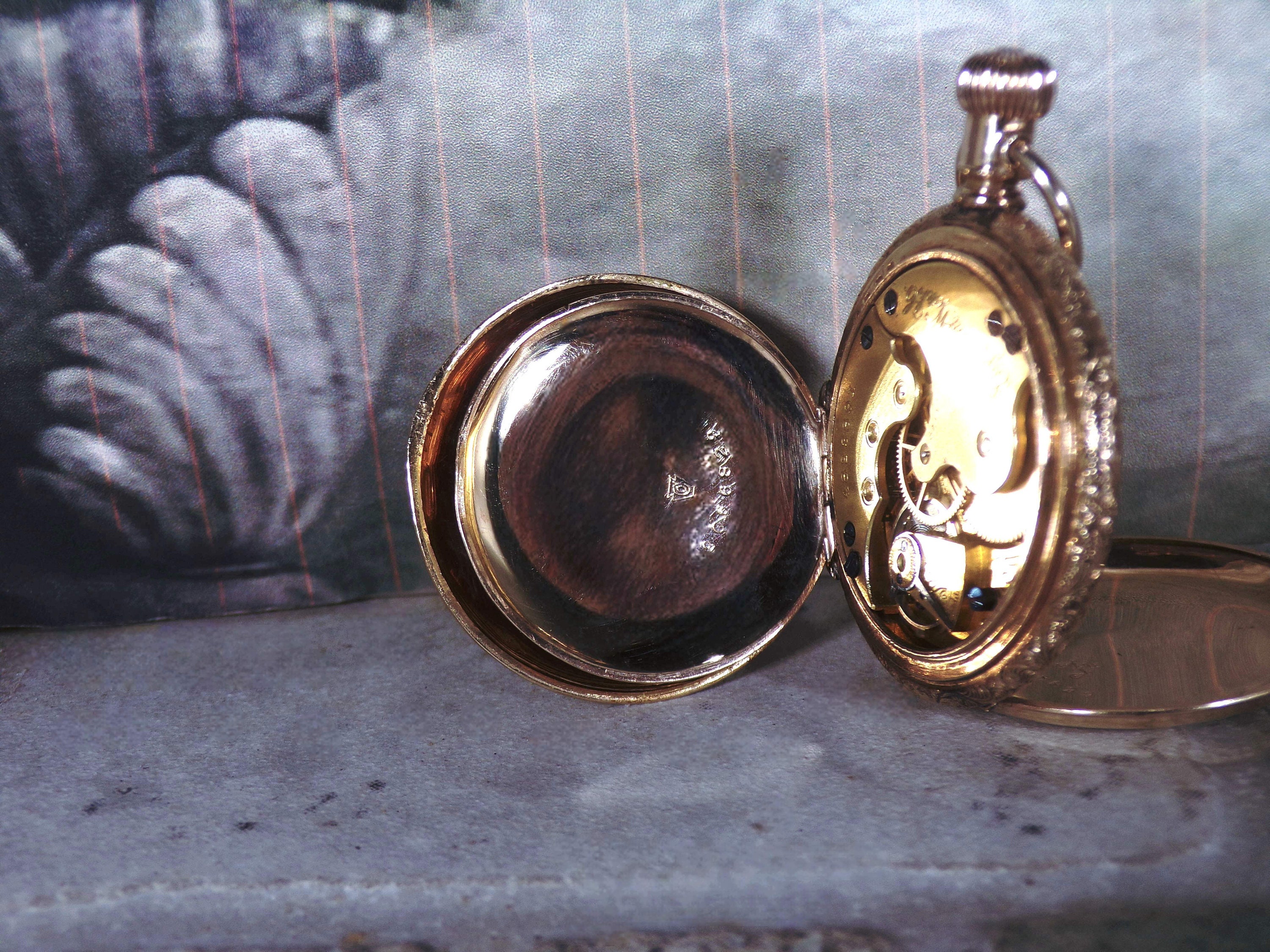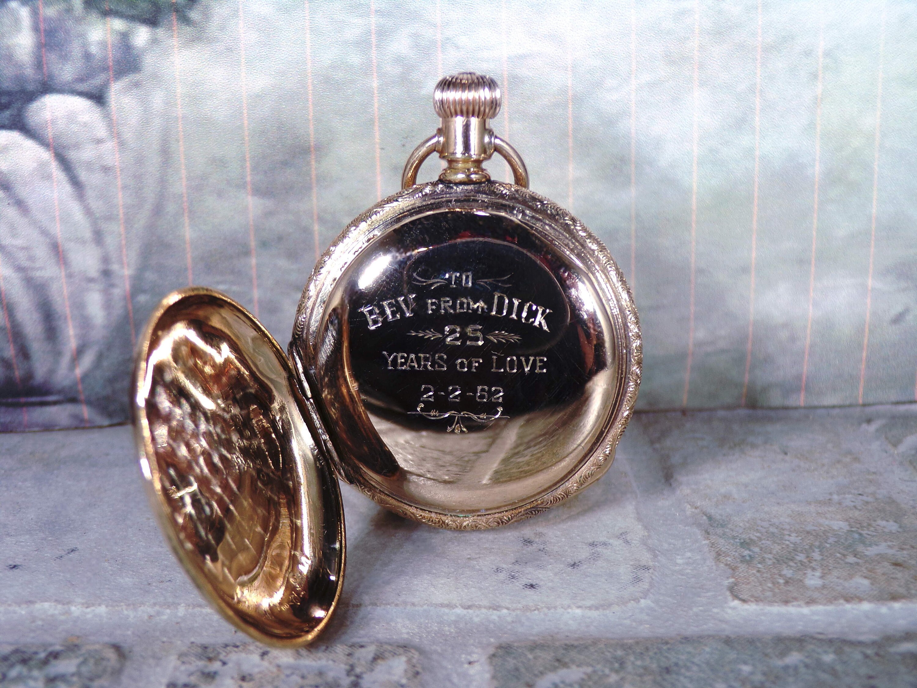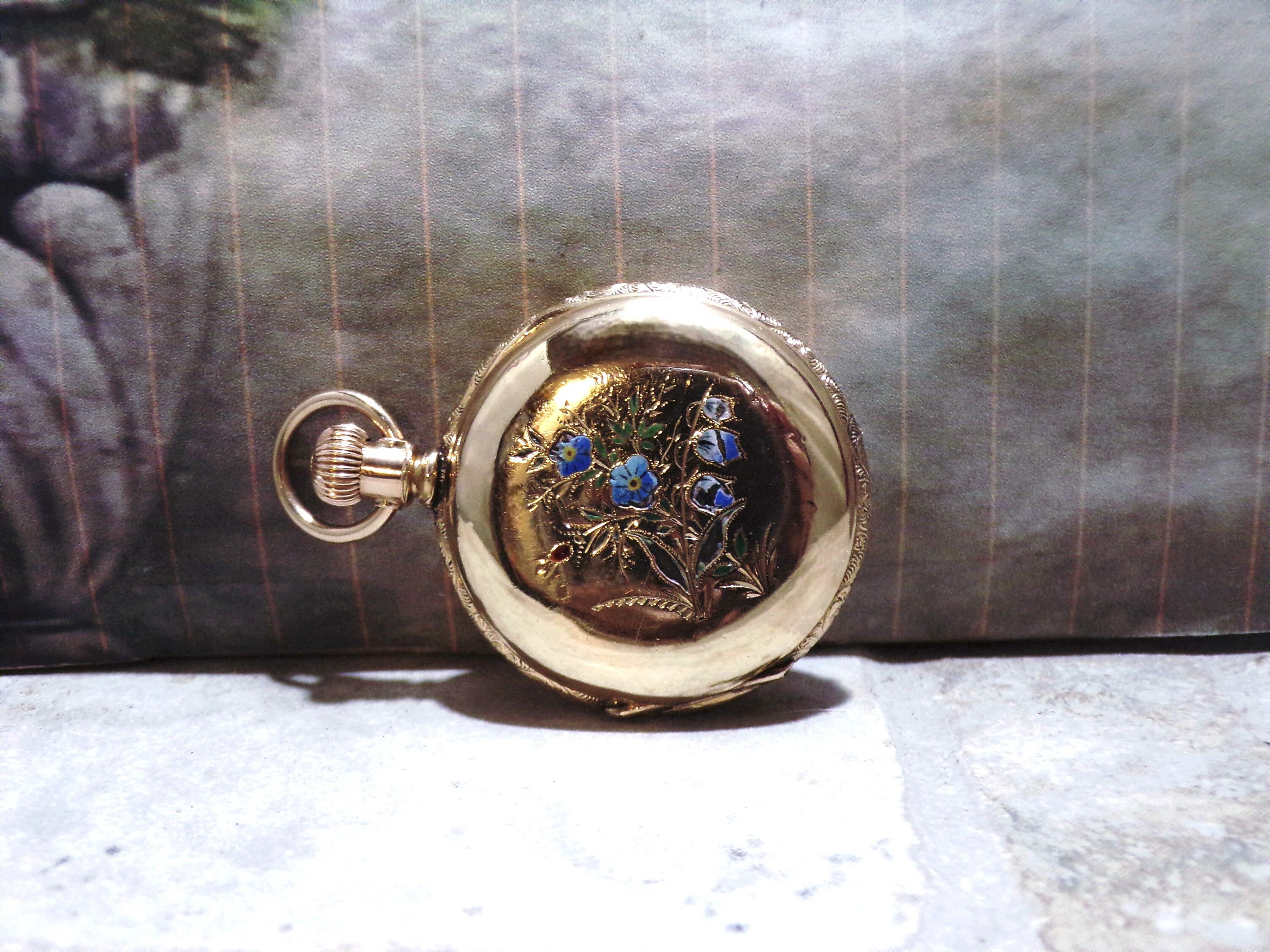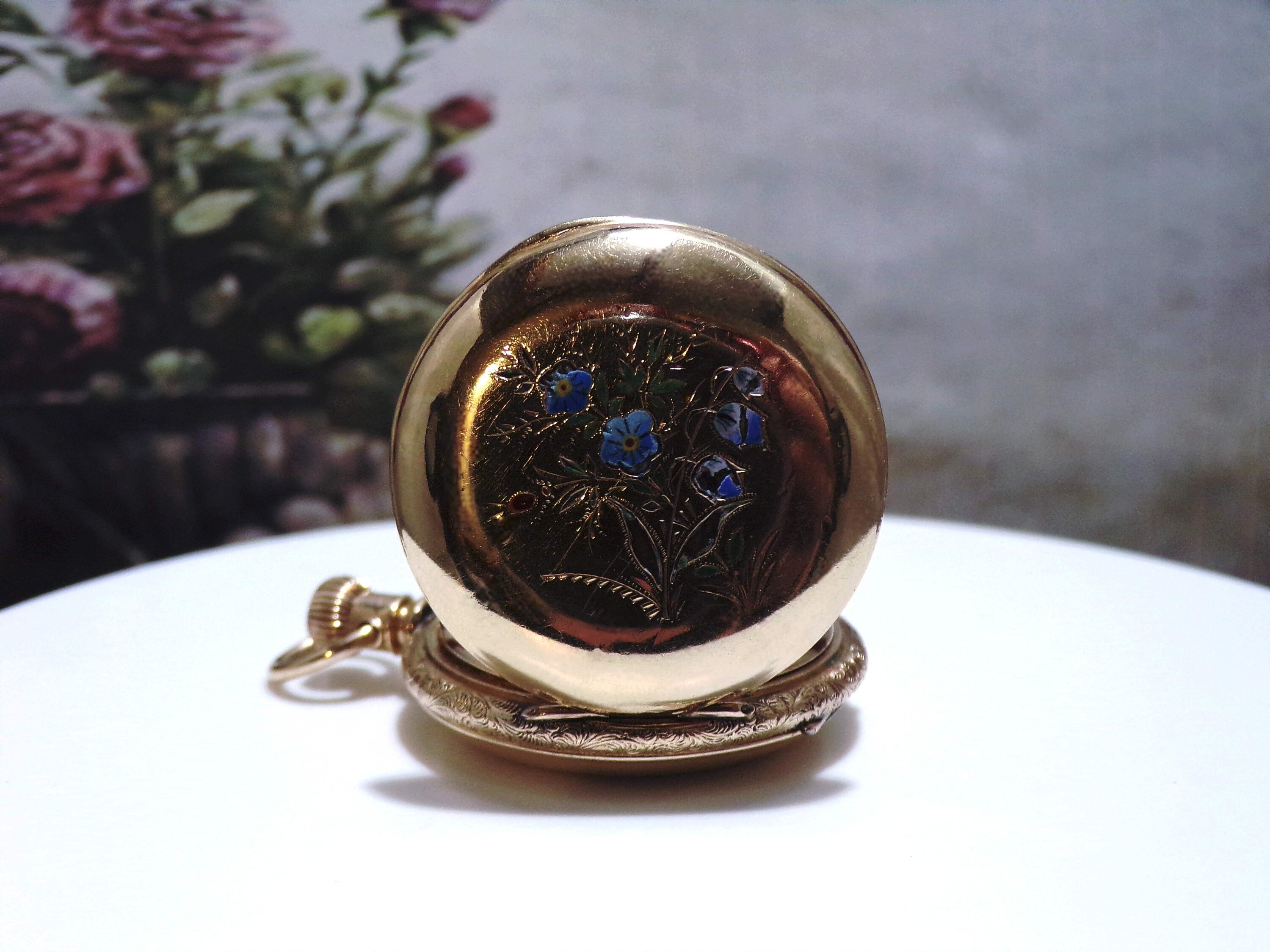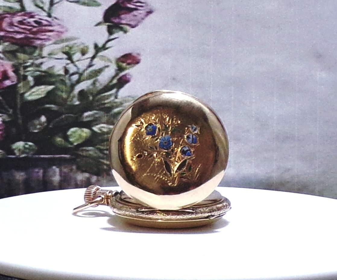This watch is Engraved inside the Hunter Case as well as the back of the Hunter Case. On the front of the case is a lovely Enamel Forget-Me-Not Blue Flowers with Green Leaves. There is also a Paste Ruby Gem inserted as well. Please note that there is some breakage of the enamel of the flowers and a few leaves. But it still presents beautifully and is very feminine and delicate.