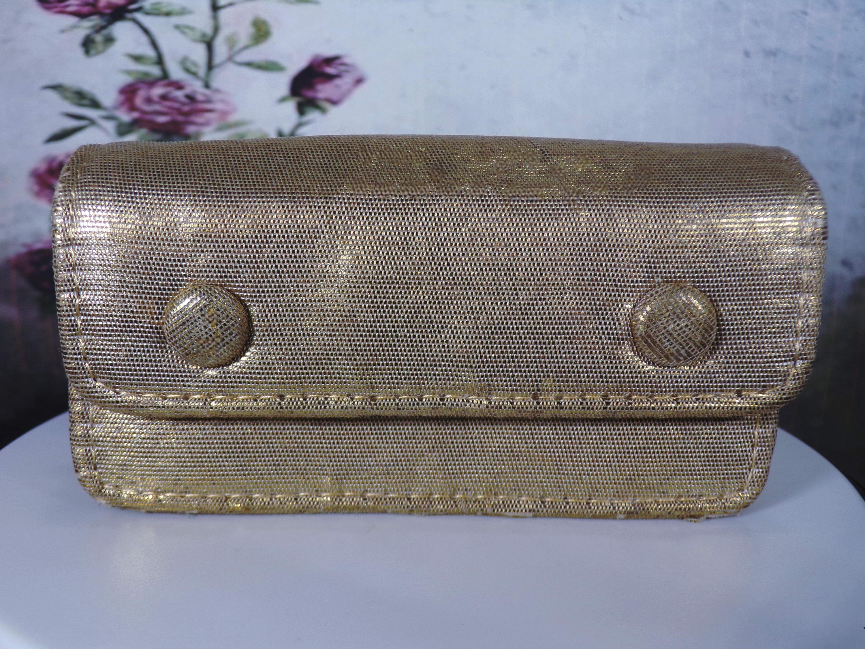 • Condition is Vintage Very Good – gold brass is very shiny clean; the embroidered section is very slightly dark in some places very common with aged items – lenses are clear and move up and down smoothly; really excellent condition; the case has no rips or tears but does show some very minor signs of age, otherwise nicely intact.