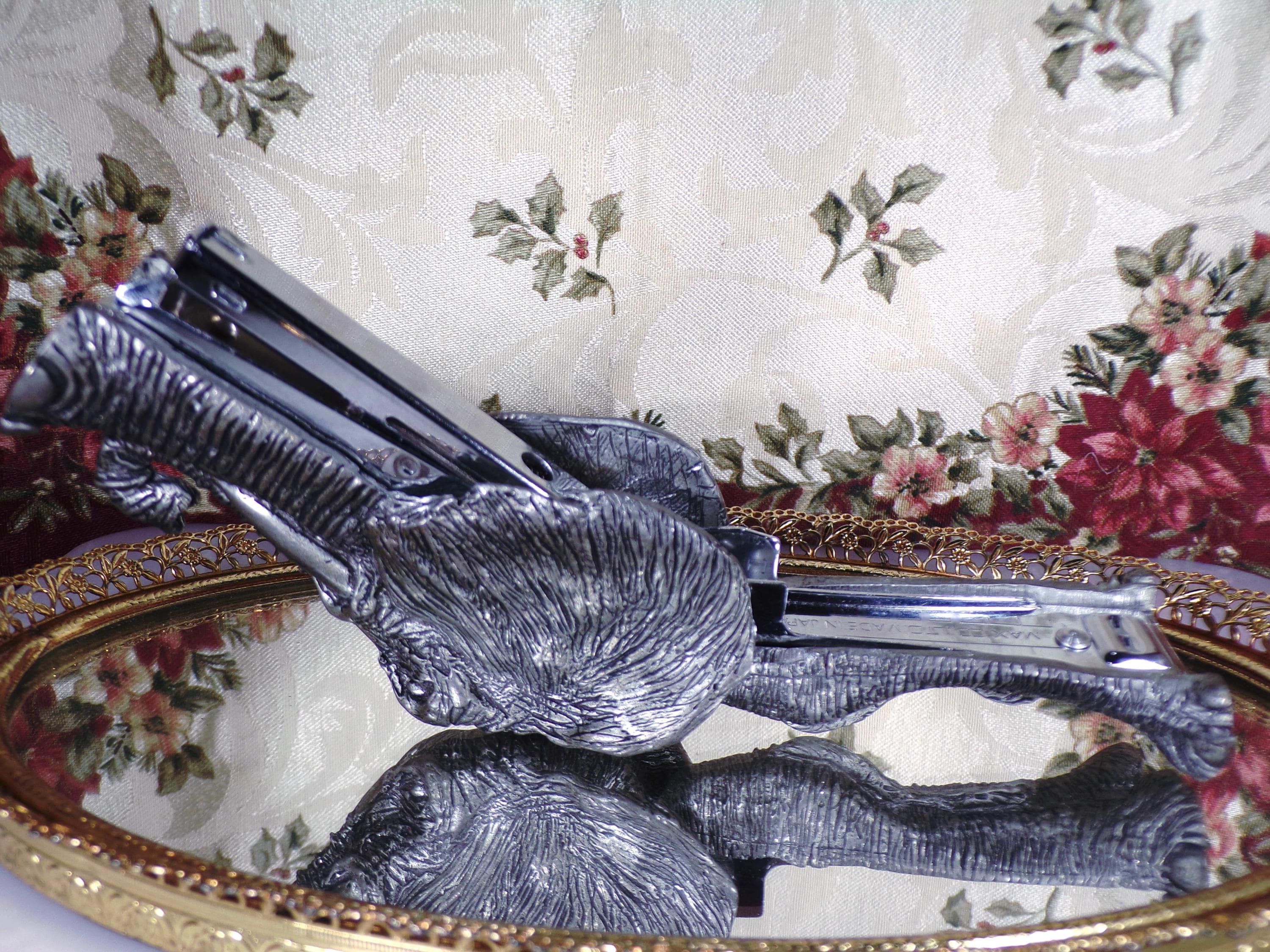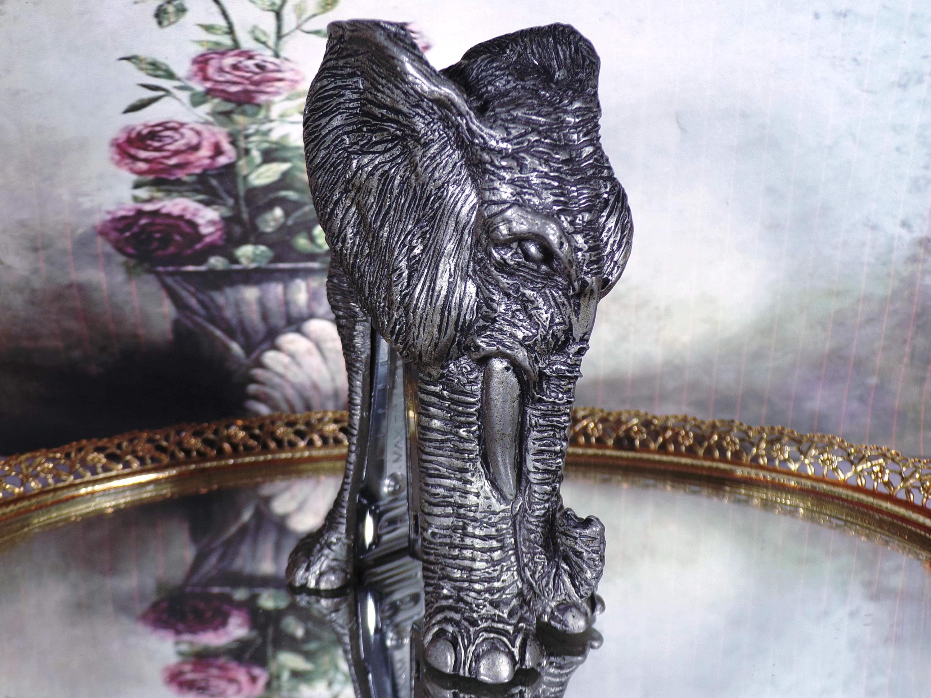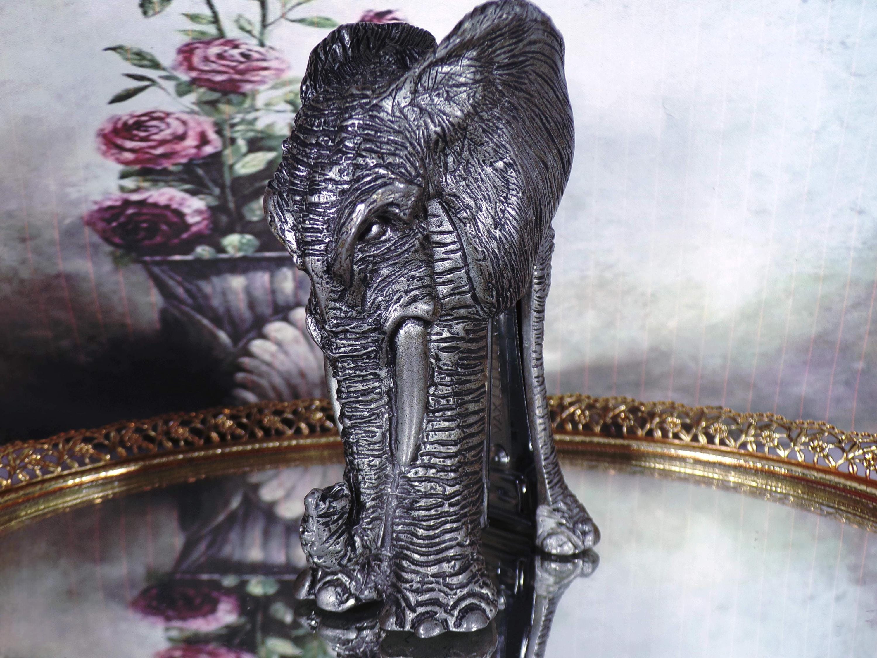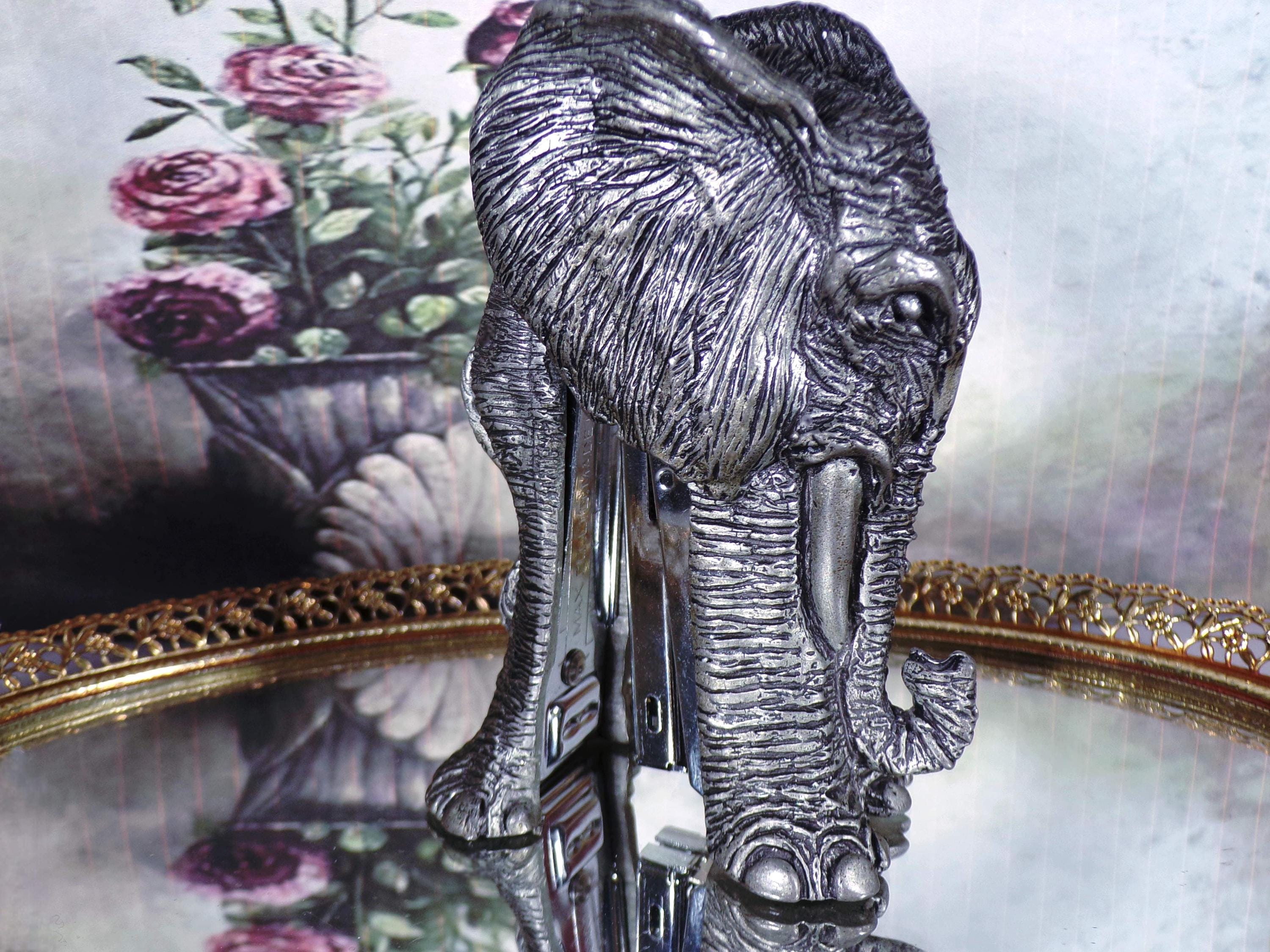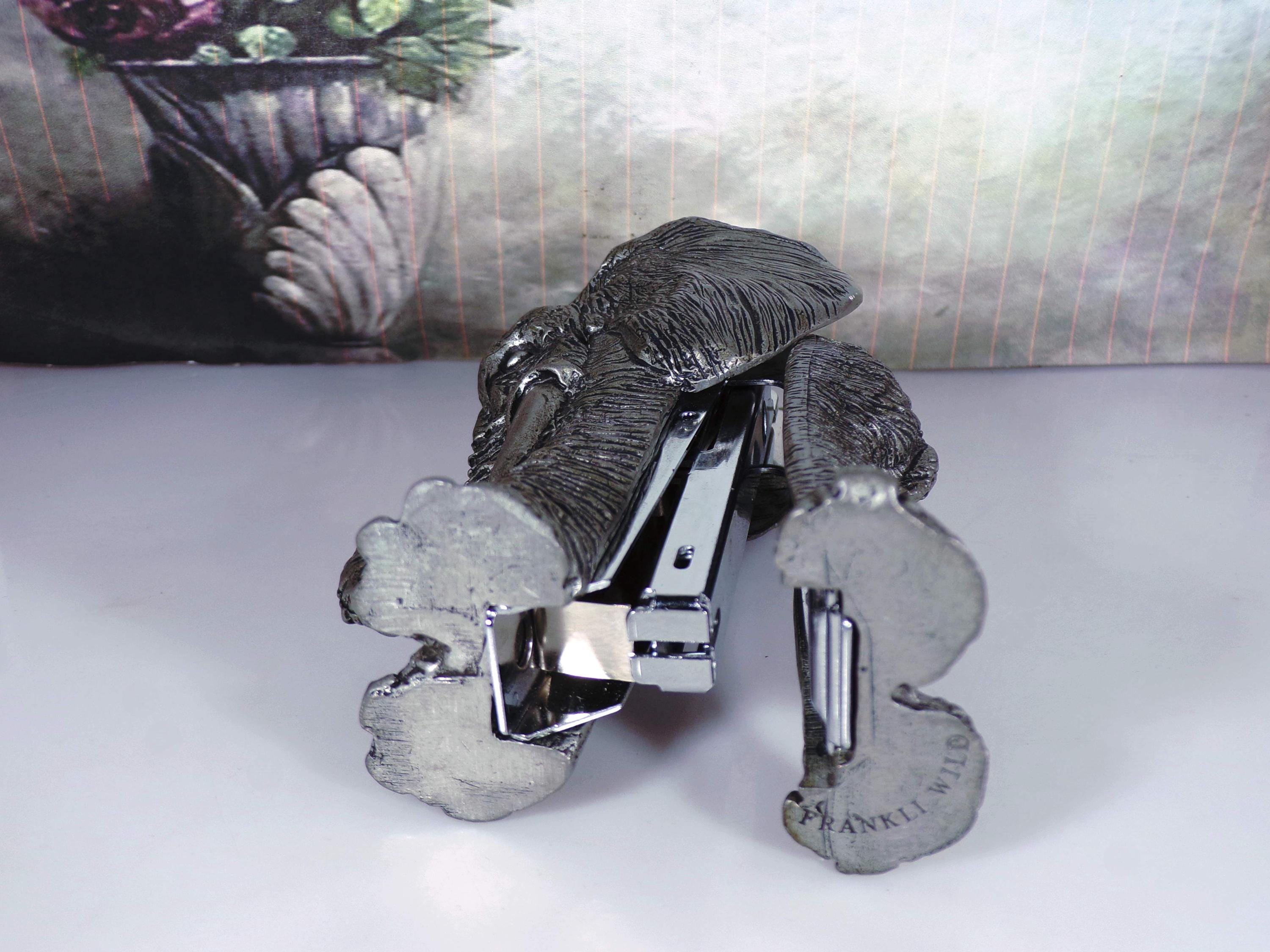 This is an amazing, sculpted Gray Pewter Elephant that has a stapler embedded inside of it. The stapler works great and no one will know where your stapler is on your desk, because the elephant just looks like a very nice sculpture that has great detail. Awesome!