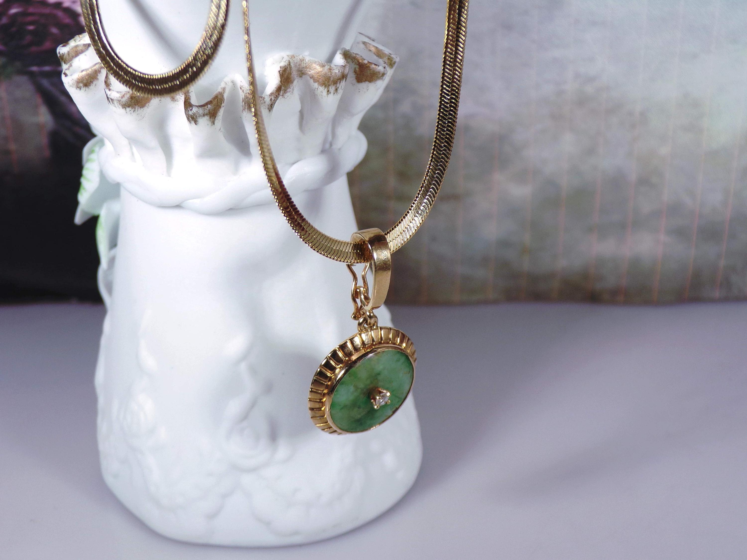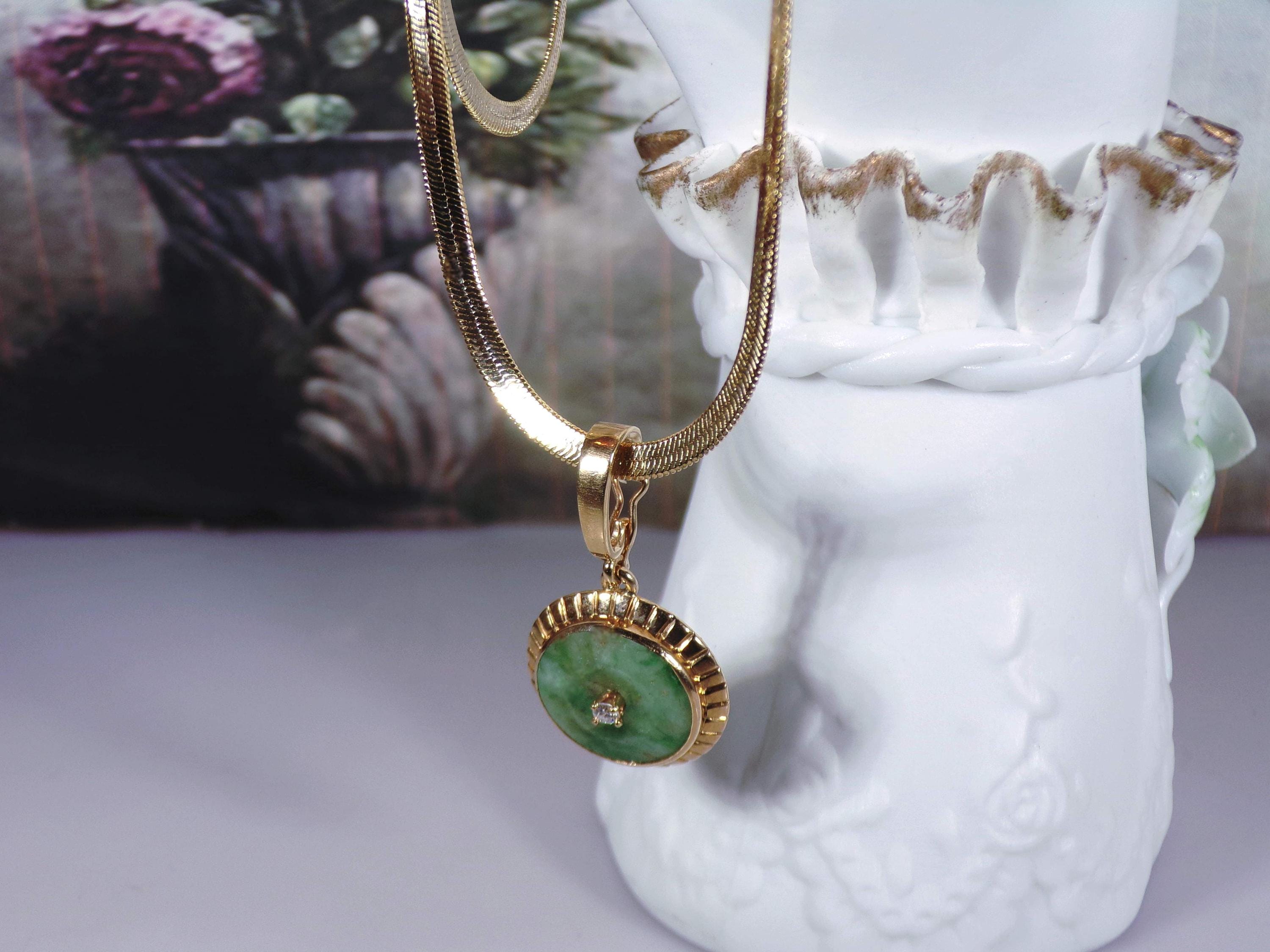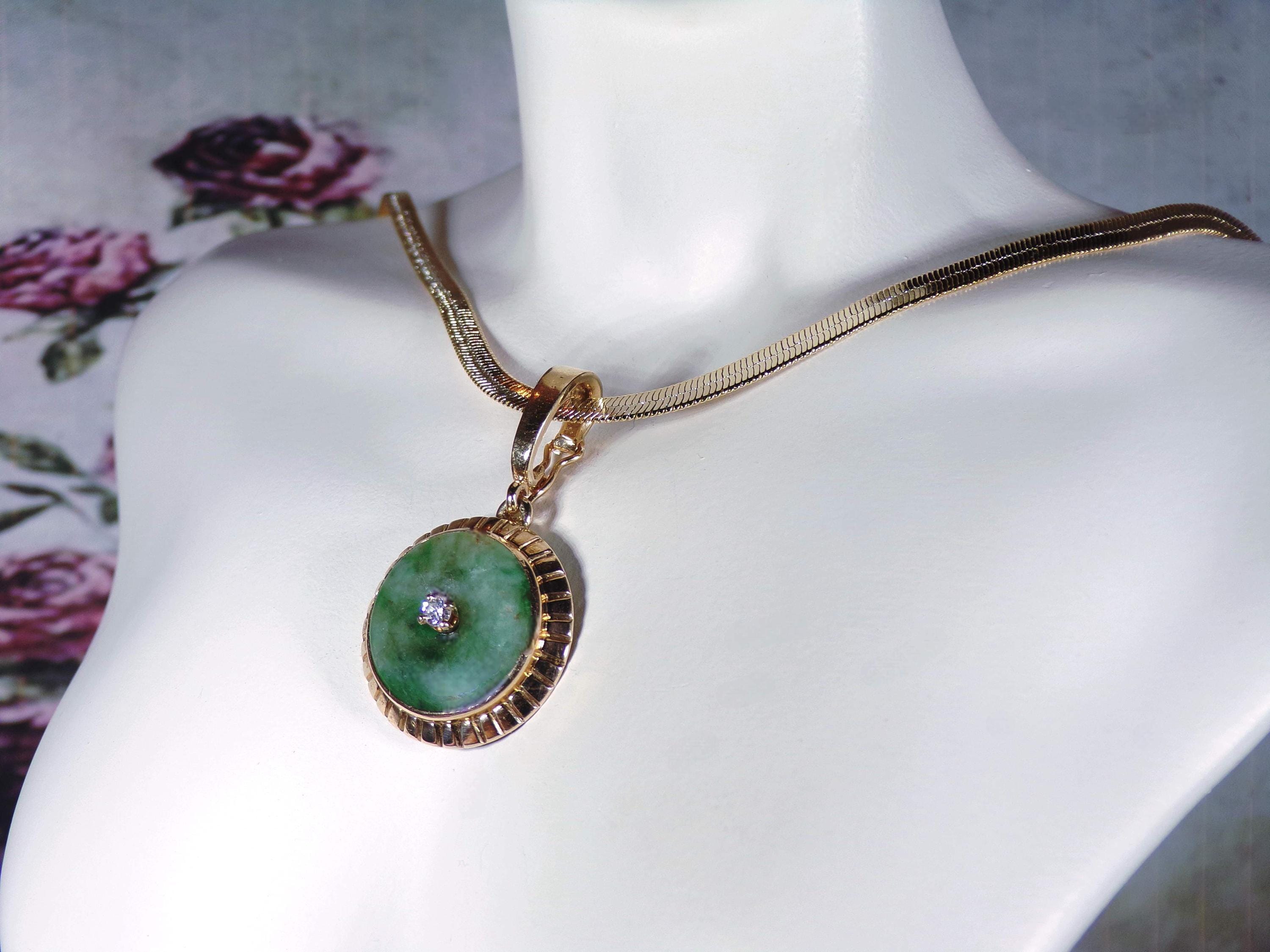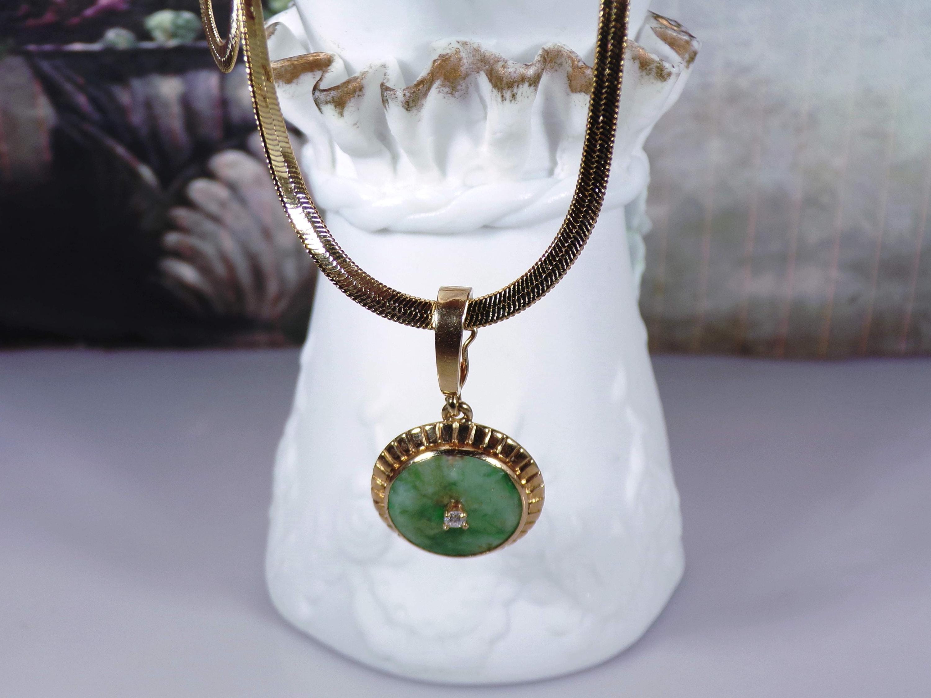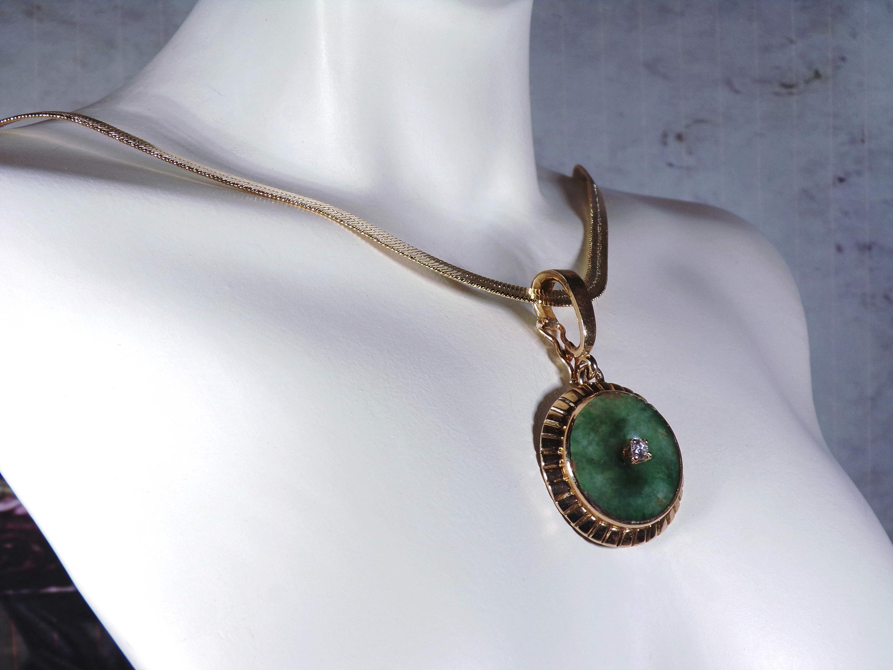 Jade and Diamond Pendant – 14K Yellow Gold Green Jade and Diamond Pendant – Genuine Gemstones – Gold Plated Omega Chain - Vintage Pendant