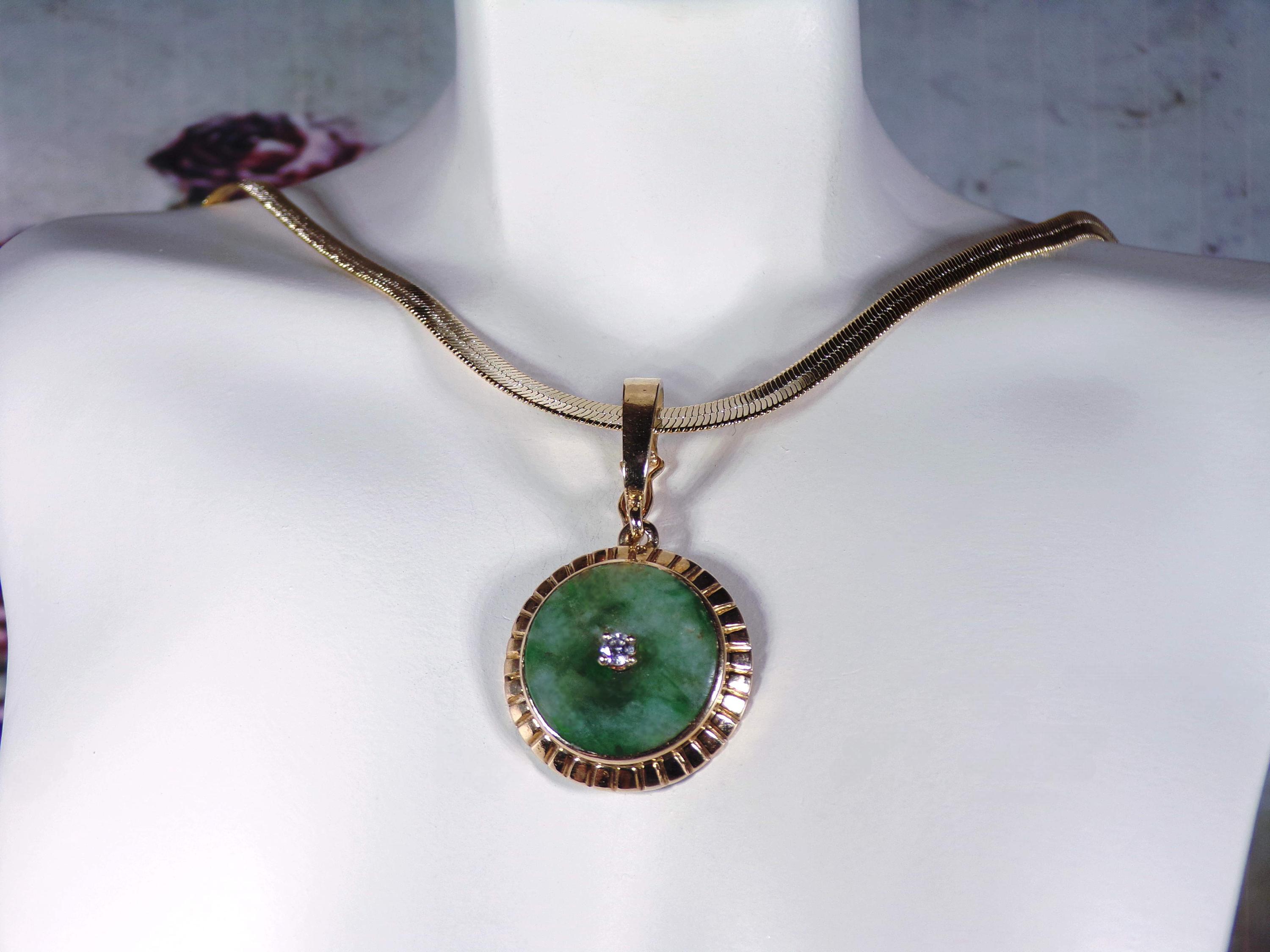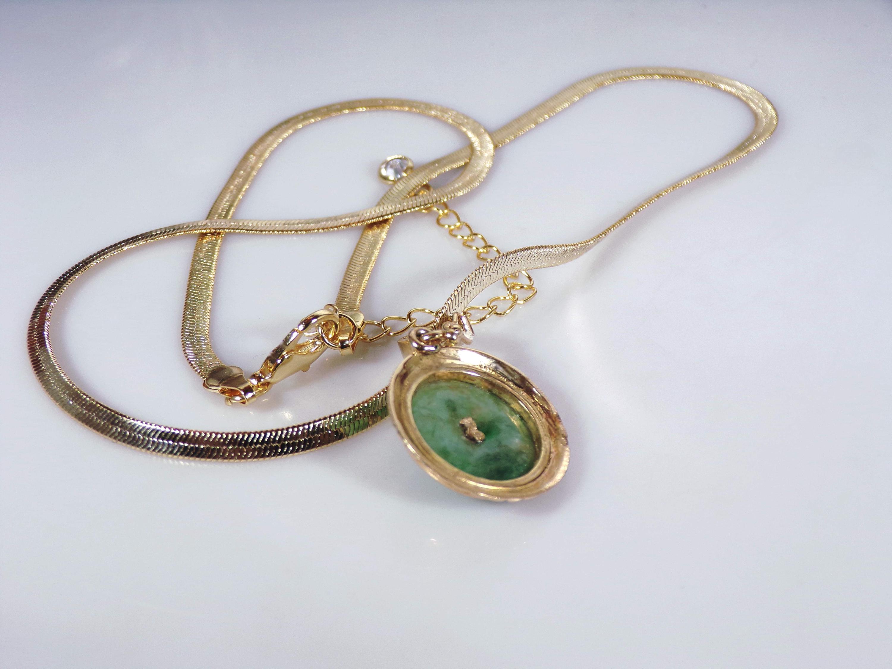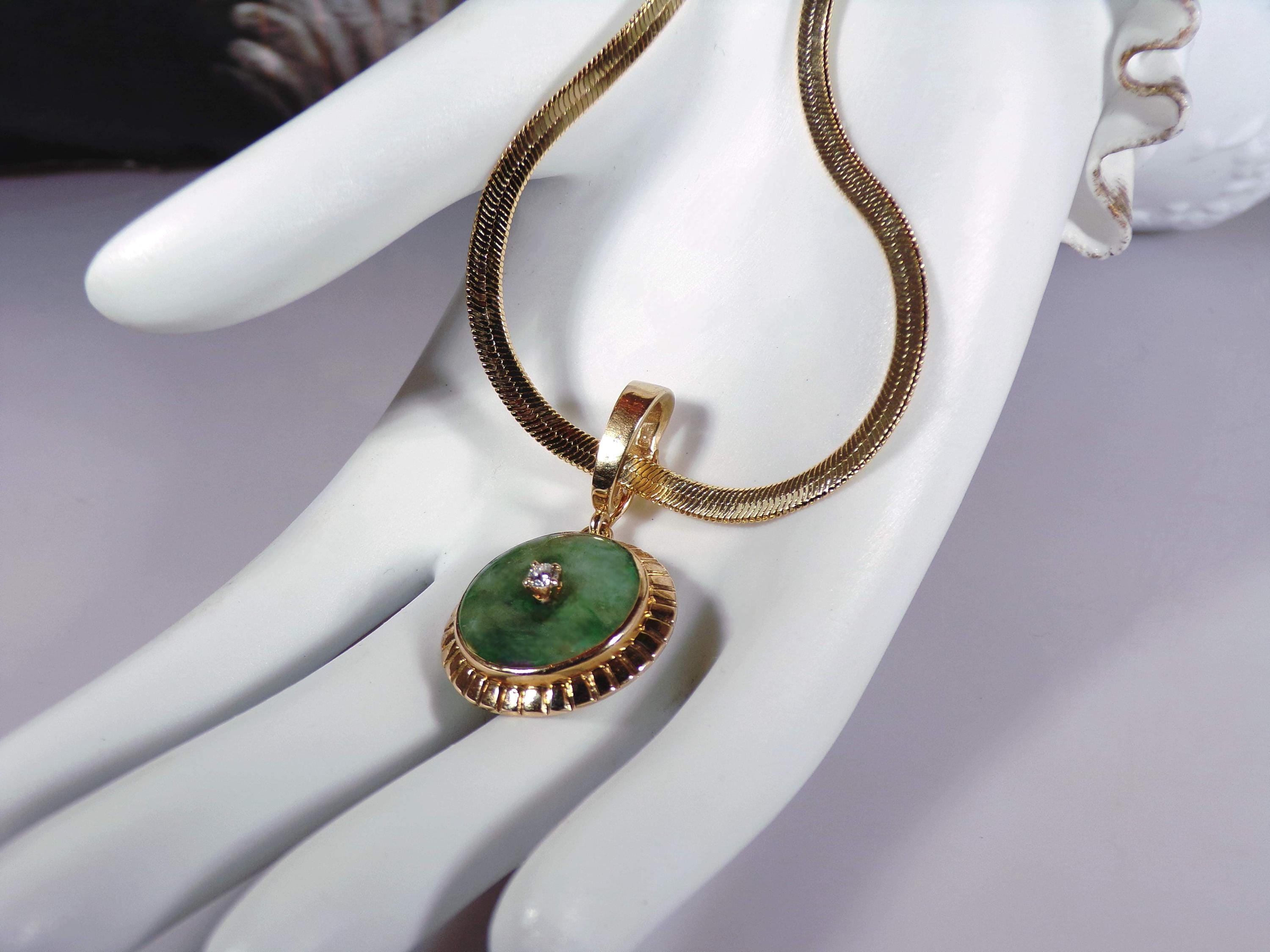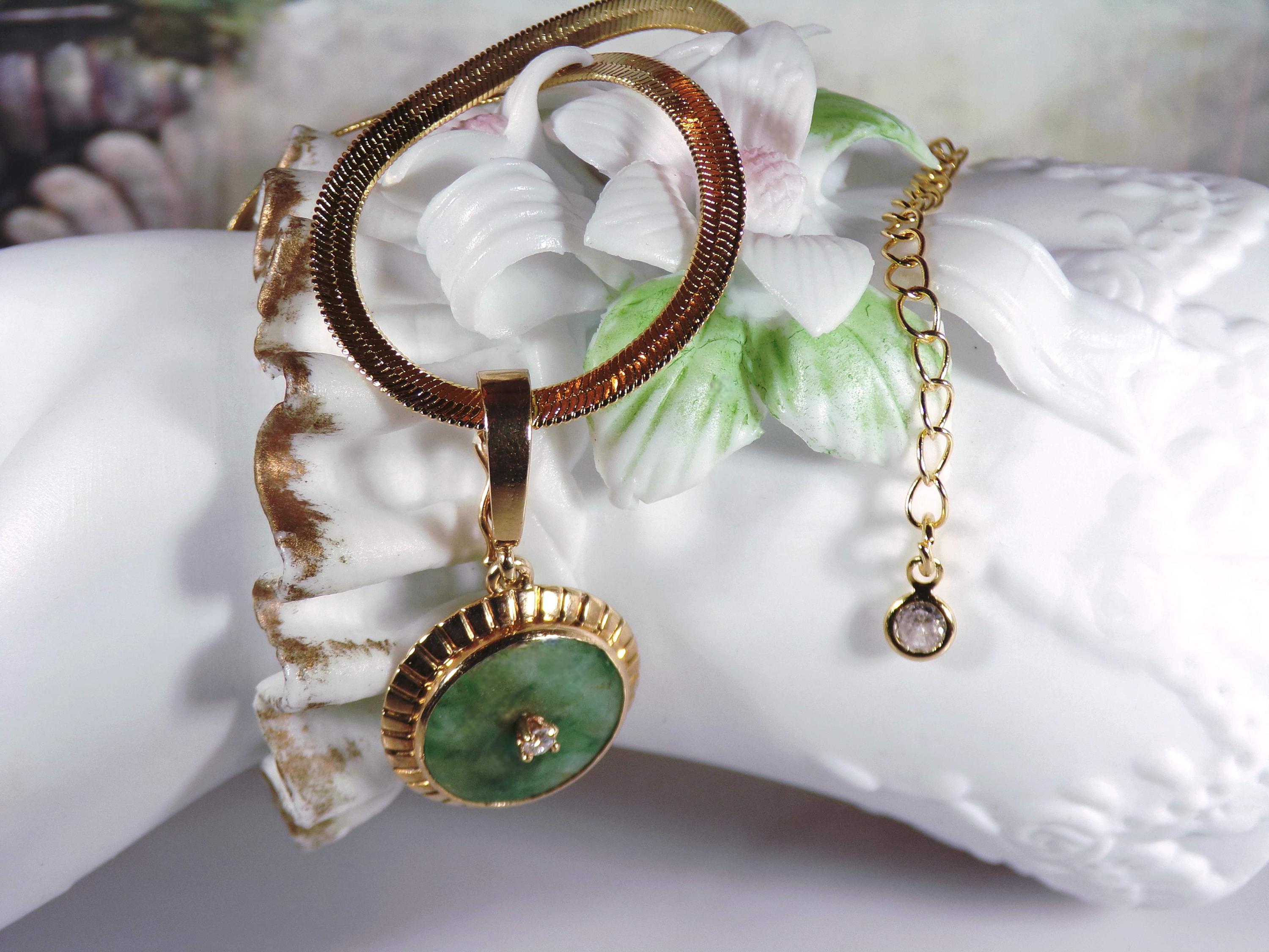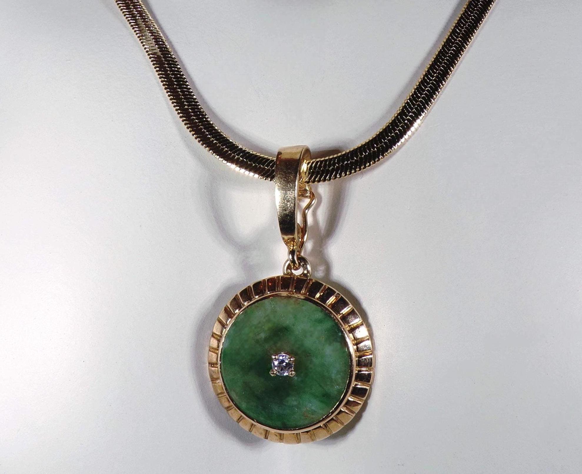 Jade and Diamond Pendant – 14K Yellow Gold Green Jade and Diamond Pendant – Genuine Gemstones – Gold Plated Omega Chain - Vintage Pendant