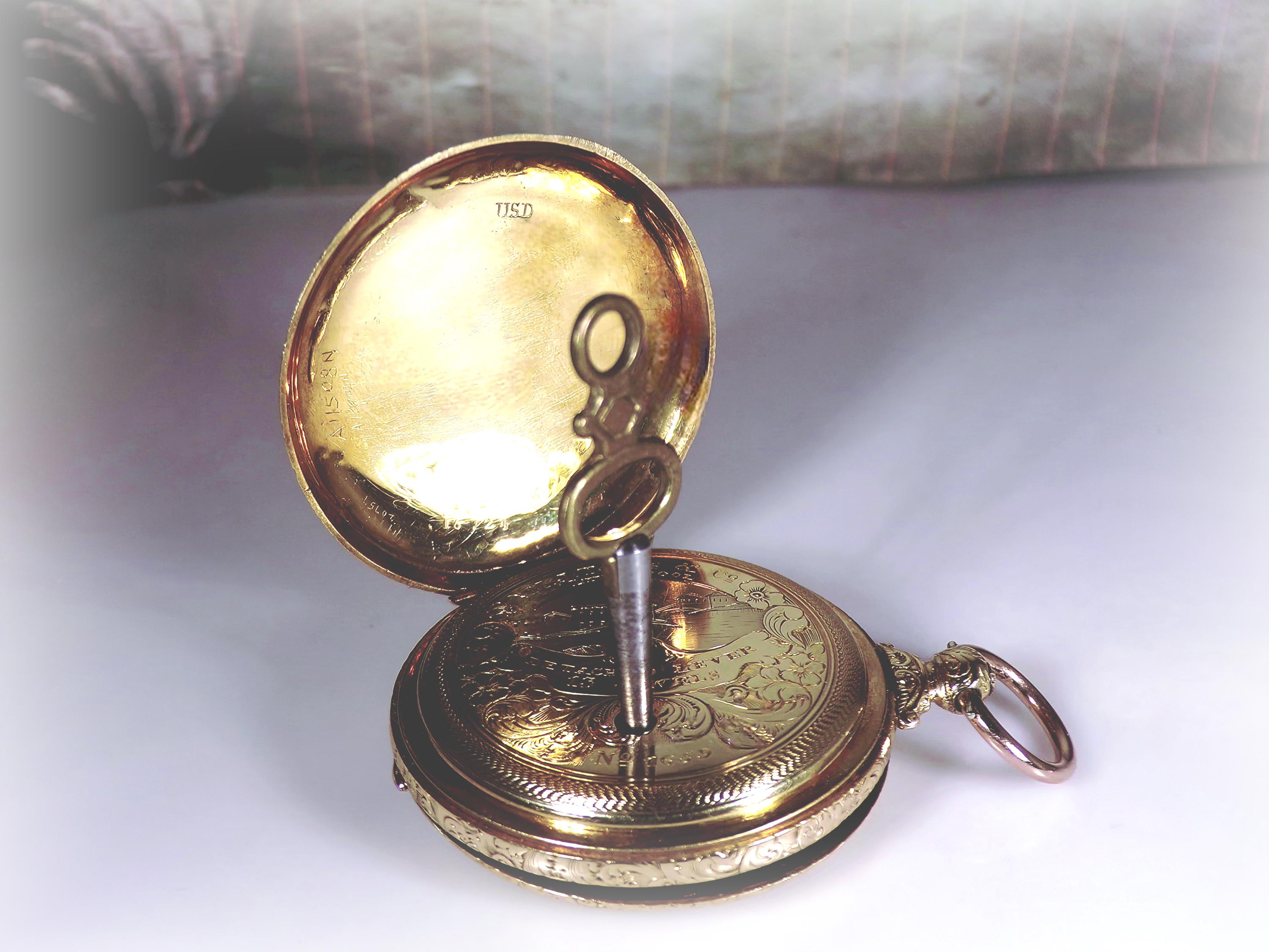 The back of the watch on the inside where the Key is inserted to wind the watch is also fully hand engraved and it is beautiful. This is a Key Wind Pocket Watch and the key comes with the watch. This is an absolutely stunning watch that works and runs very well!