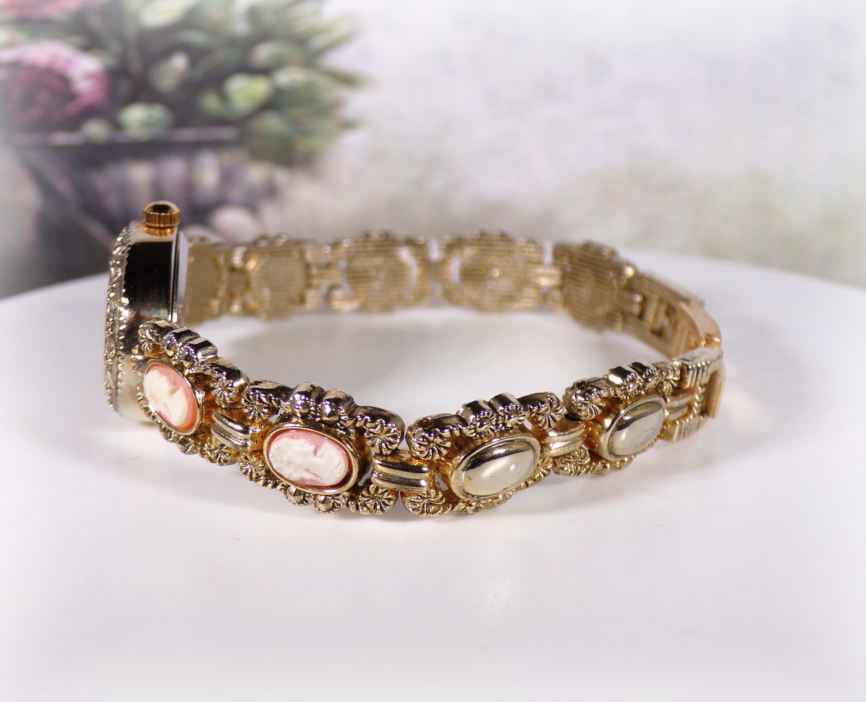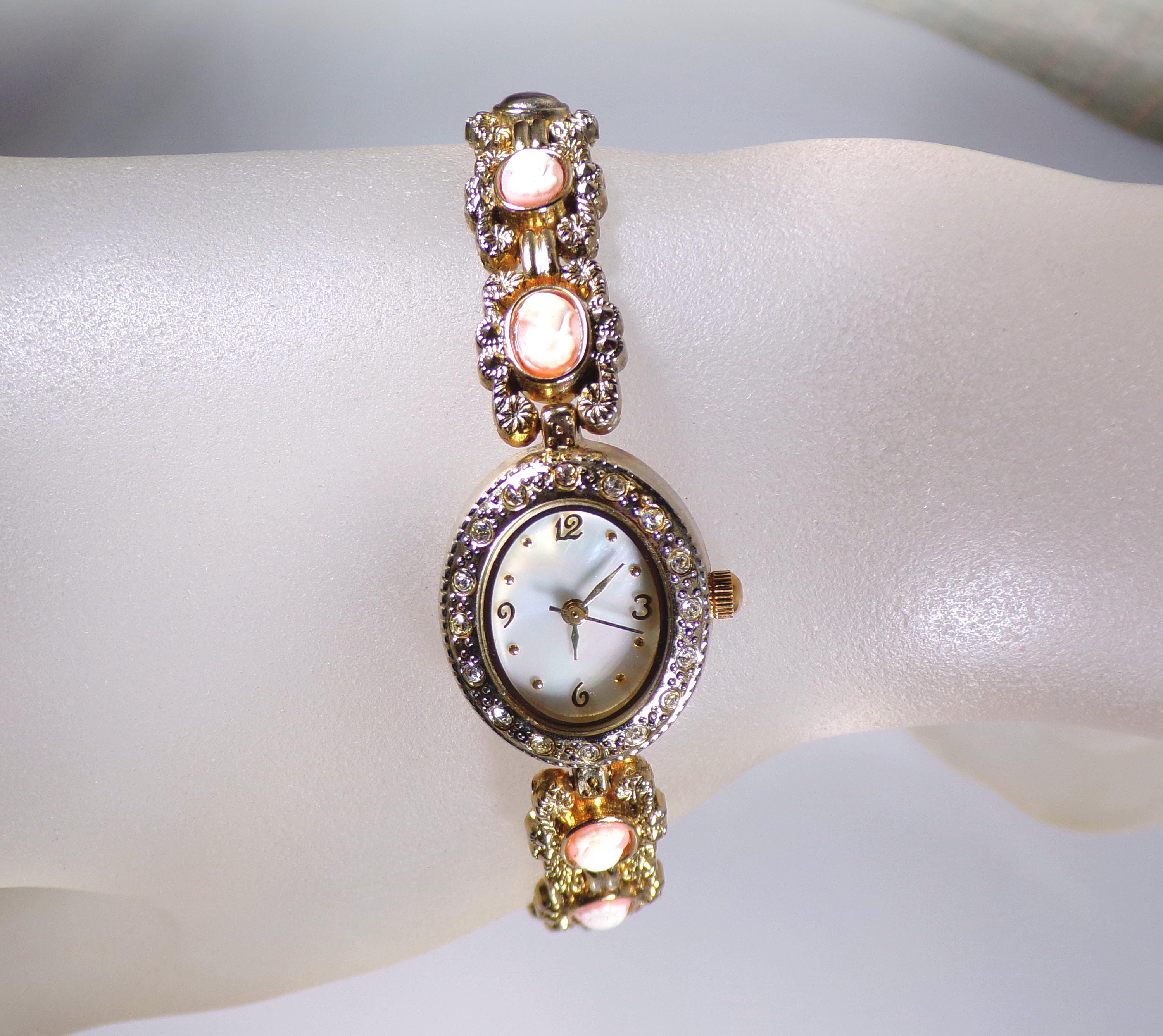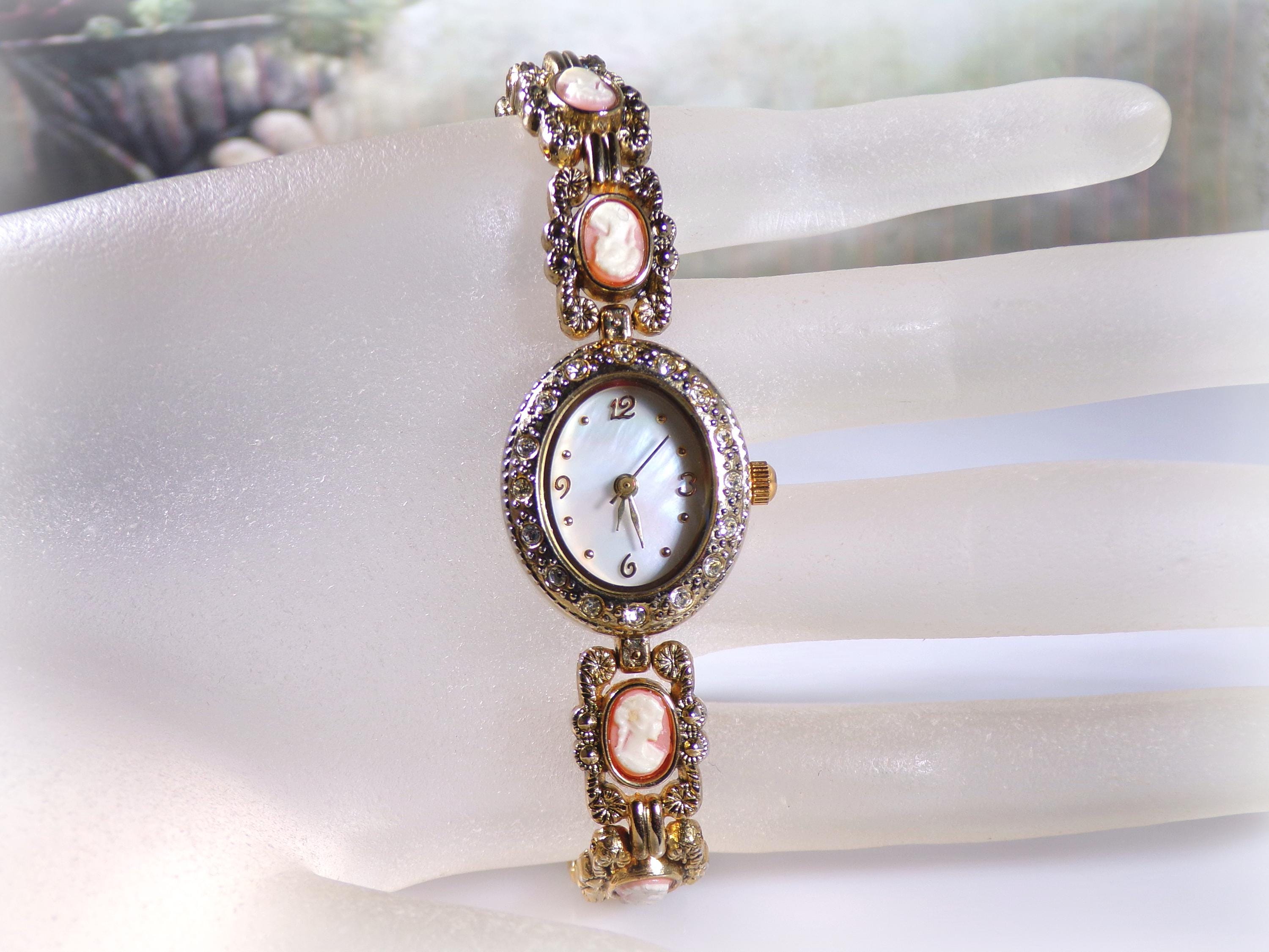 This is a very nice women’s wrist watch with cameos set into the band and Austrian Crystals placed around the bezel. The watch case and band has a gold tone metal with beautiful Victorian style design work. The watch has a stainless-steel back and a new battery installed. The crystal is quite clear, and the hands and numbers are gold in color. This is a quartz watch that is battery operated.