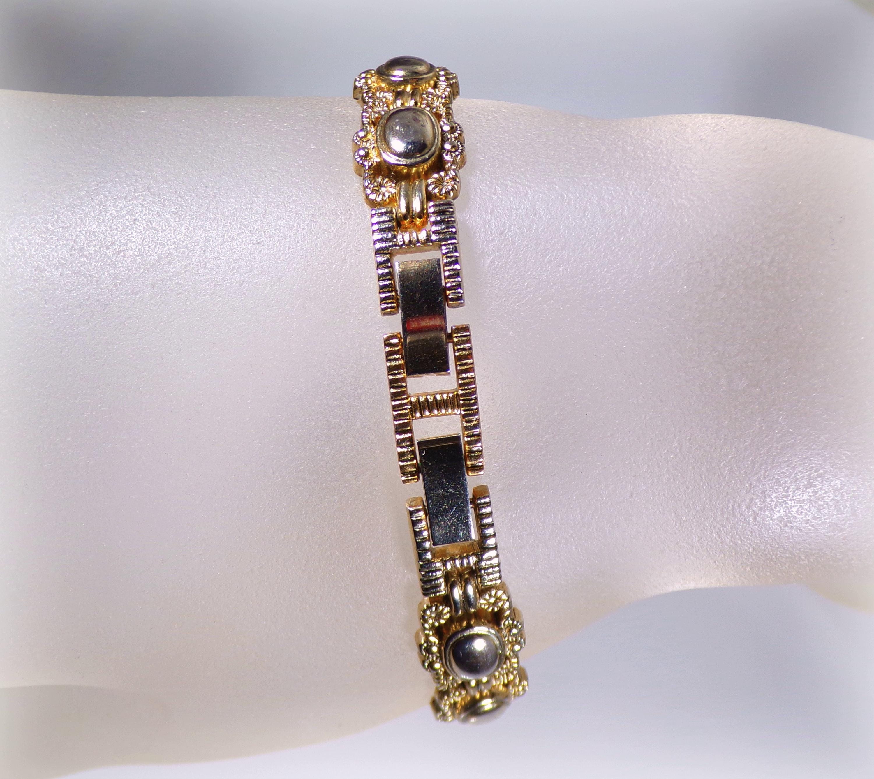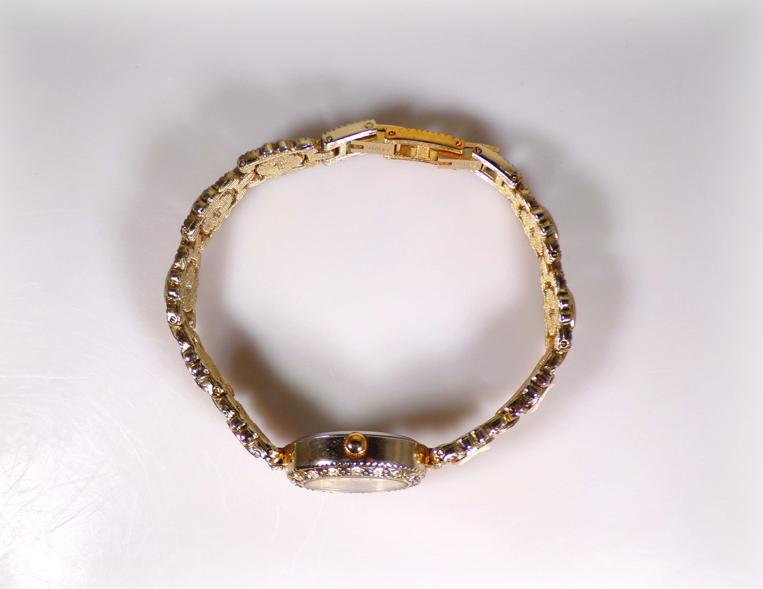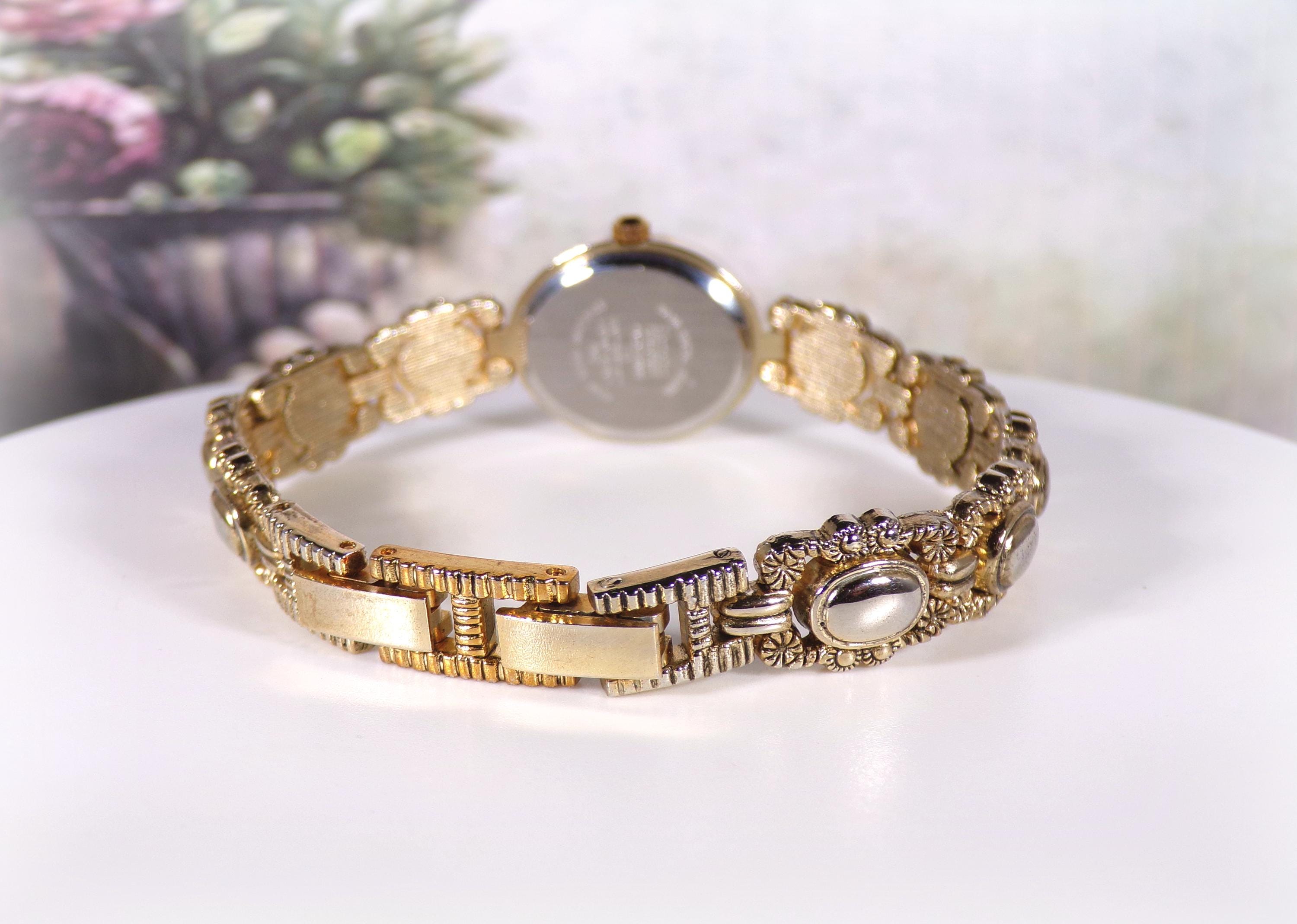 This is a very nice women’s wrist watch with cameos set into the band and Austrian Crystals placed around the bezel. The watch case and band has a gold tone metal with beautiful Victorian style design work. The watch has a stainless-steel back and a new battery installed. The crystal is quite clear, and the hands and numbers are gold in color. This is a quartz watch that is battery operated.