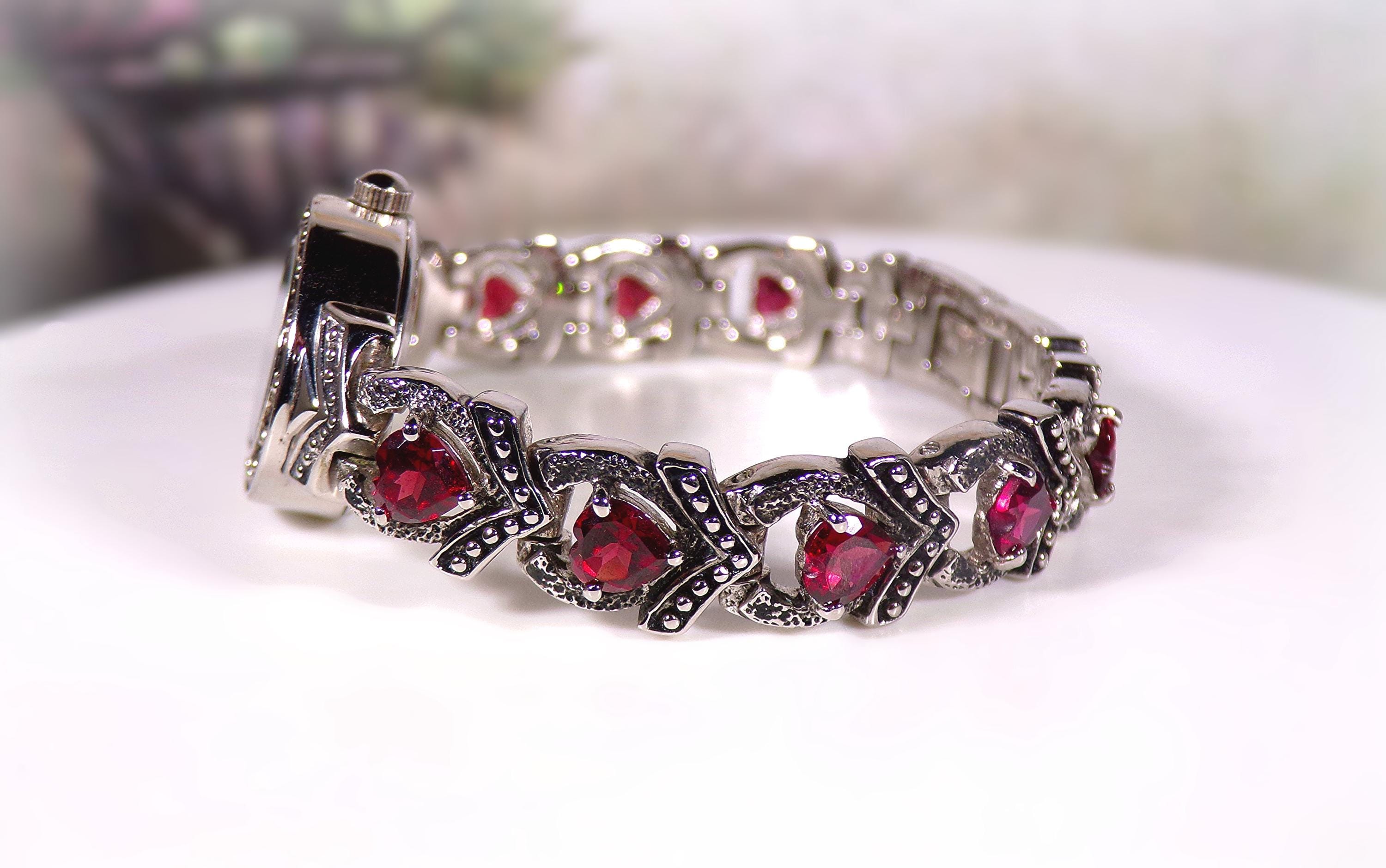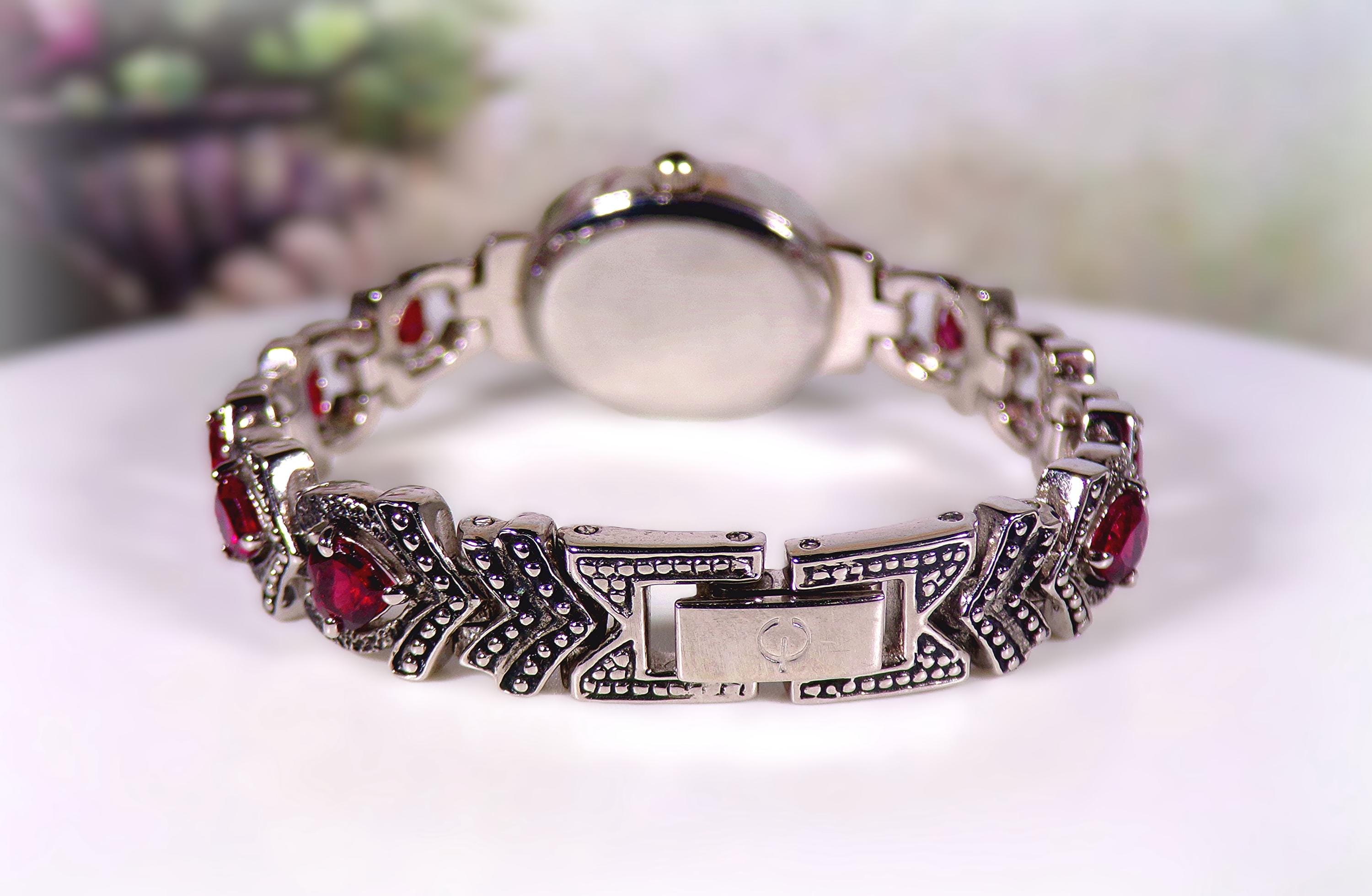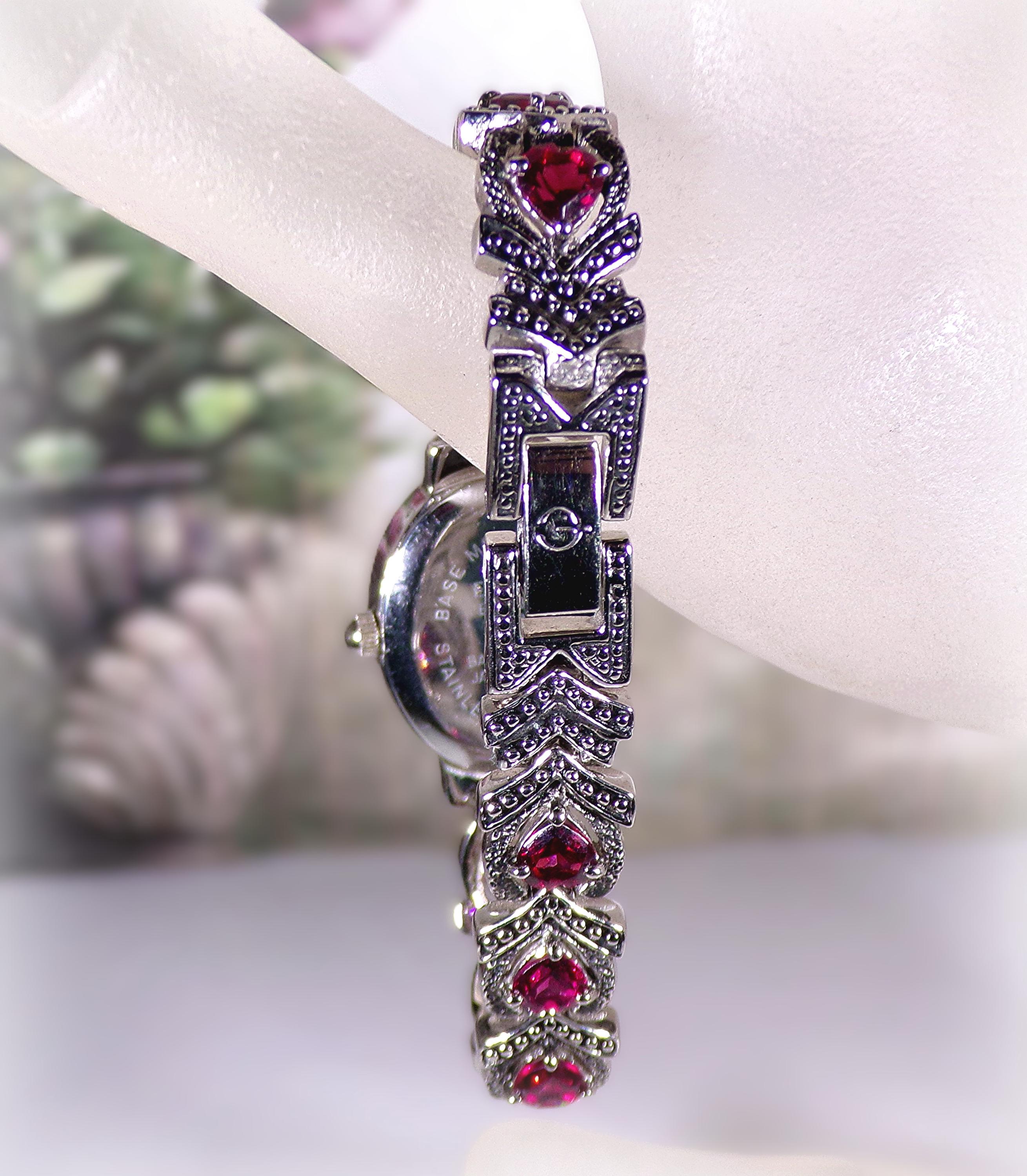 This is a very pretty watch with a silver marcasite design and heart-shaped cubic zirconia in a beautiful deep red. It has a stainless-steel case-back and a folding clasp that is easily handled. There are three extra links included for size adjustment as needed.