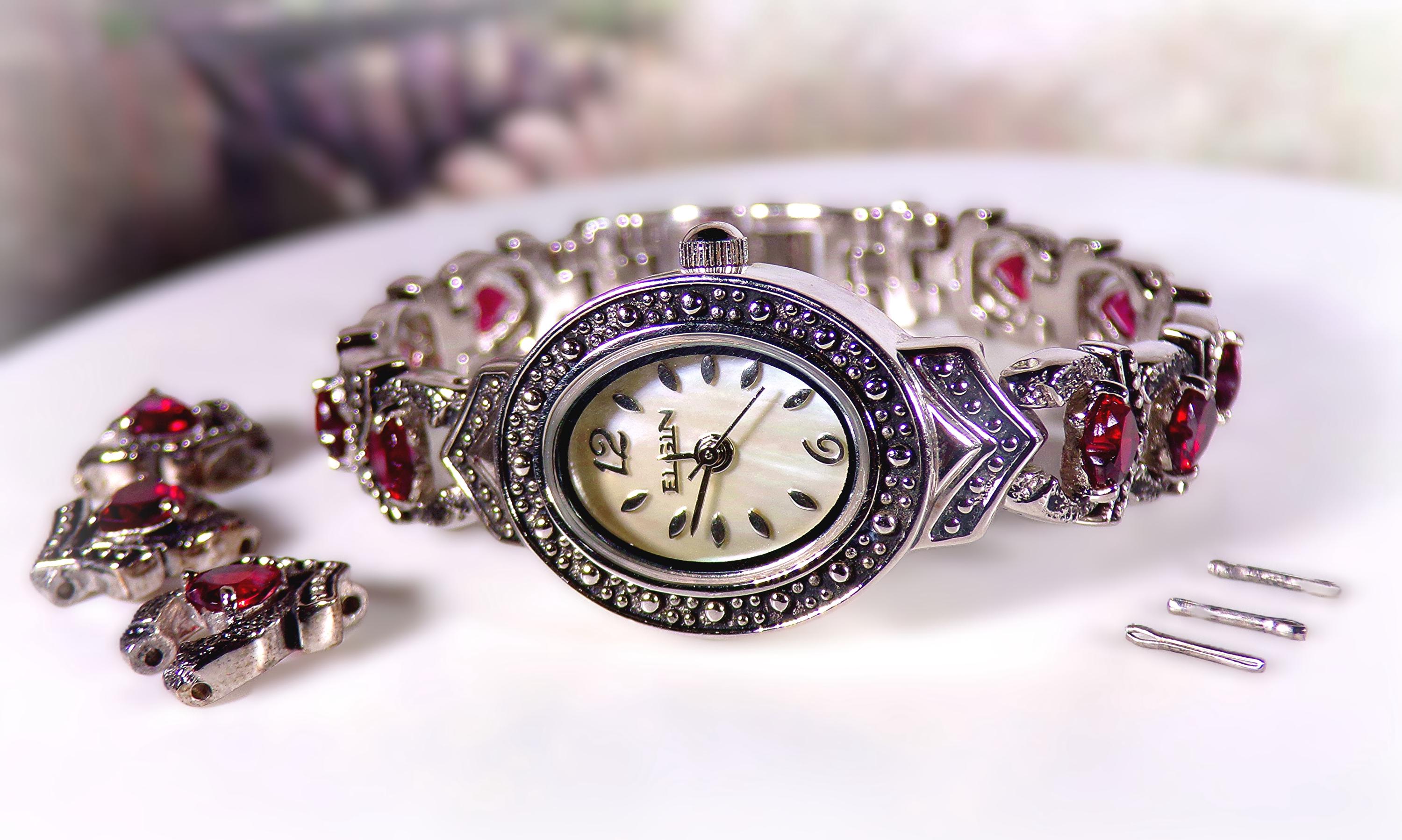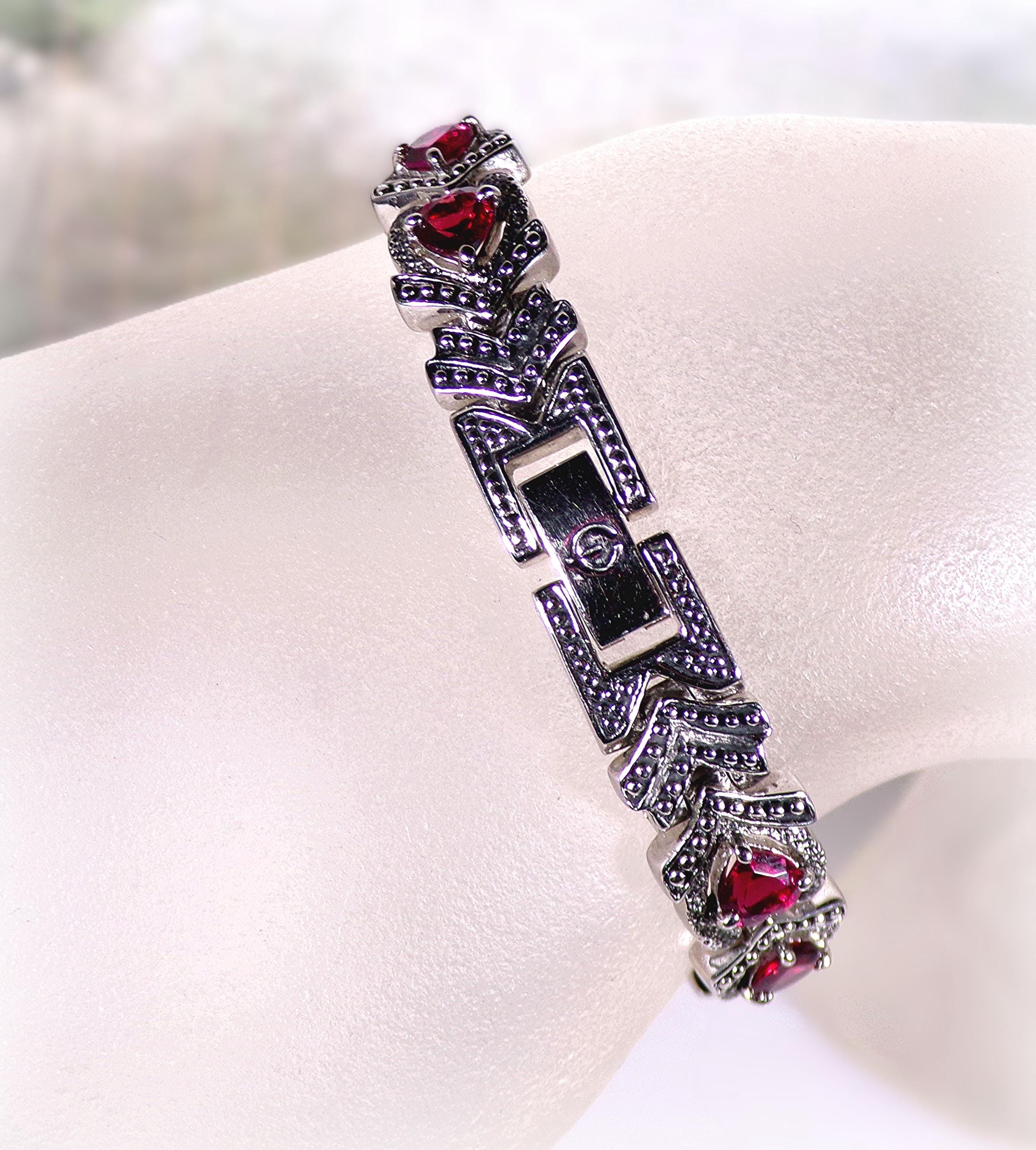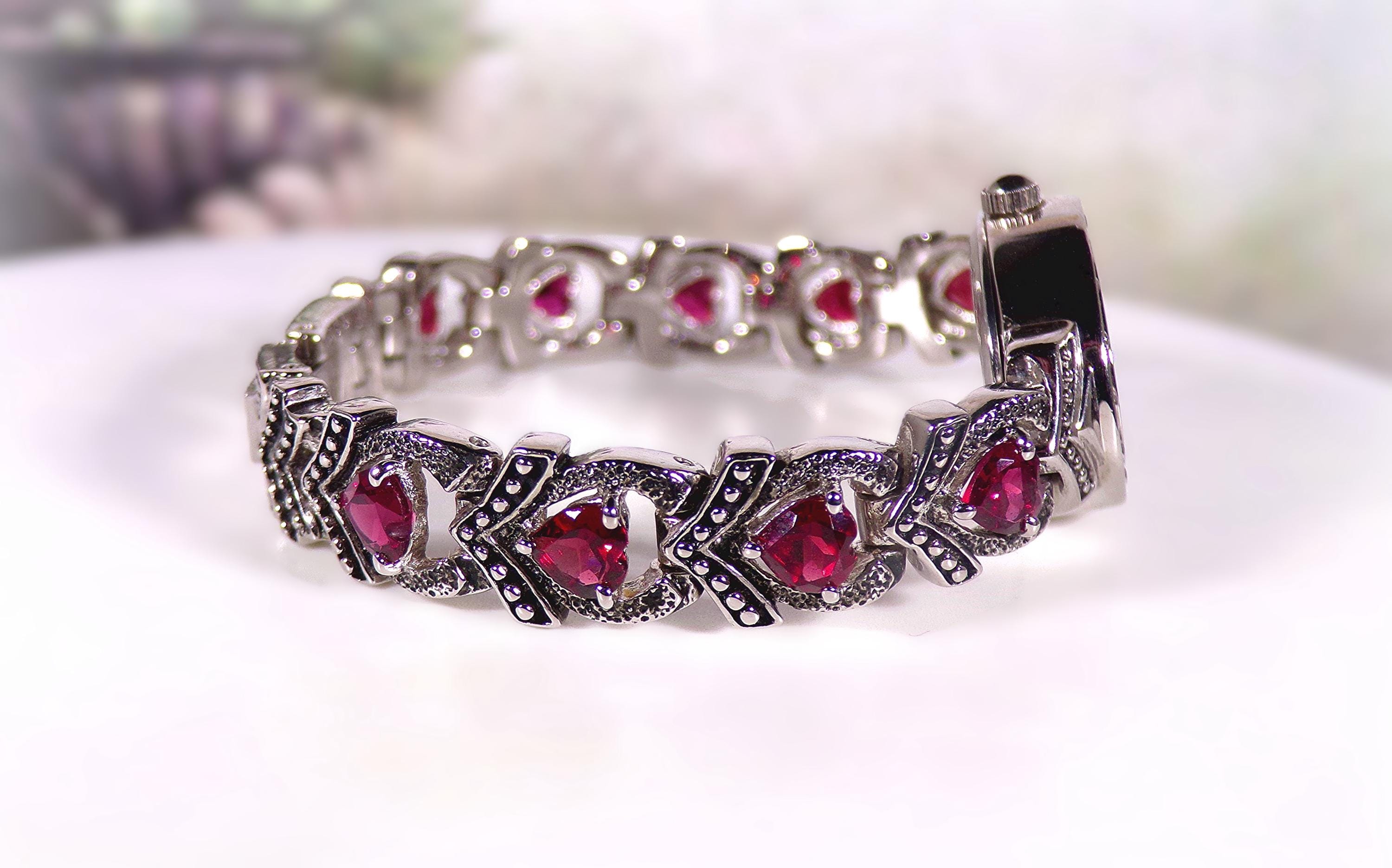 This is a very pretty watch with a silver marcasite design and heart-shaped cubic zirconia in a beautiful deep red. It has a stainless-steel case-back and a folding clasp that is easily handled. There are three extra links included for size adjustment as needed.