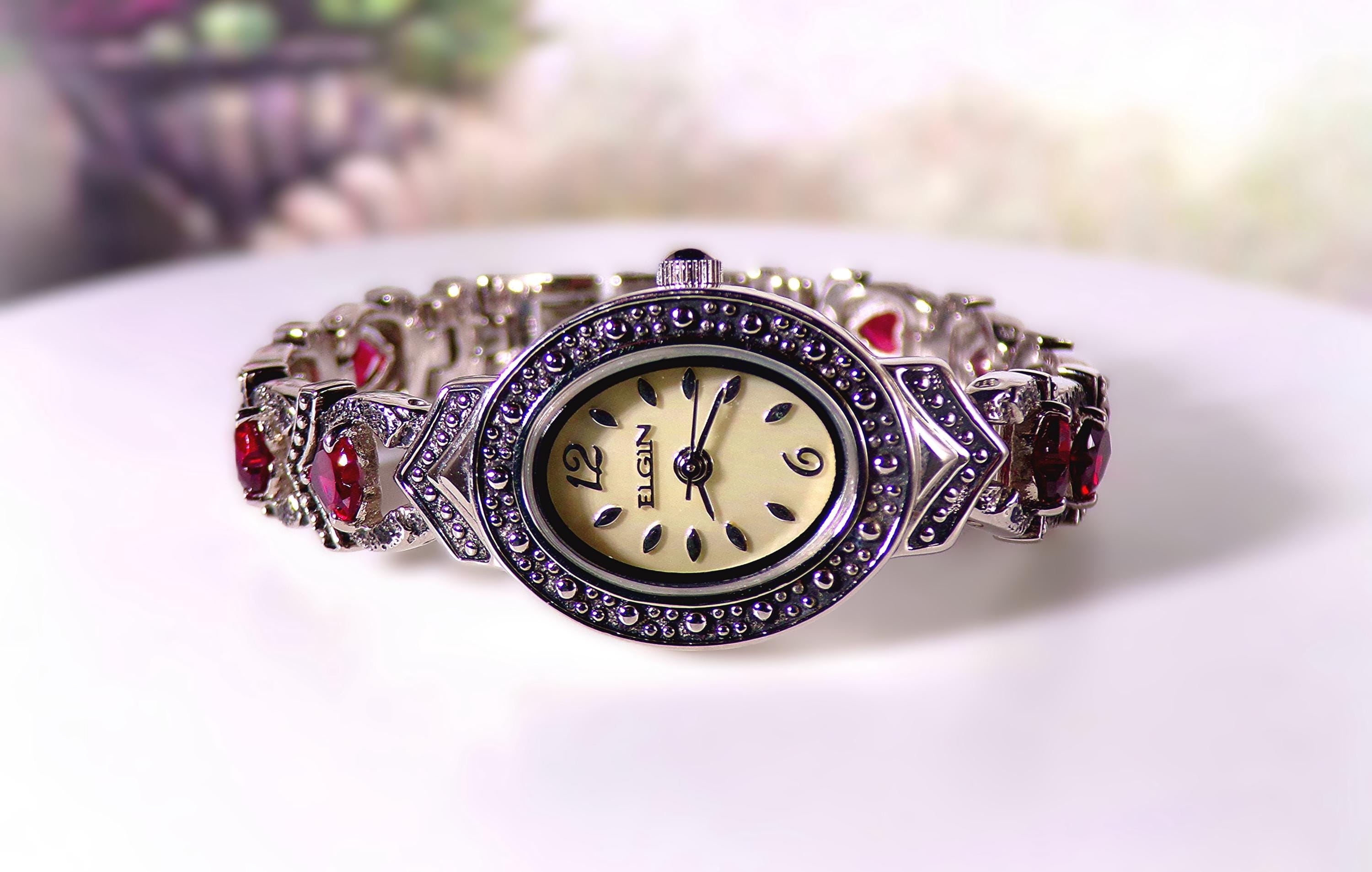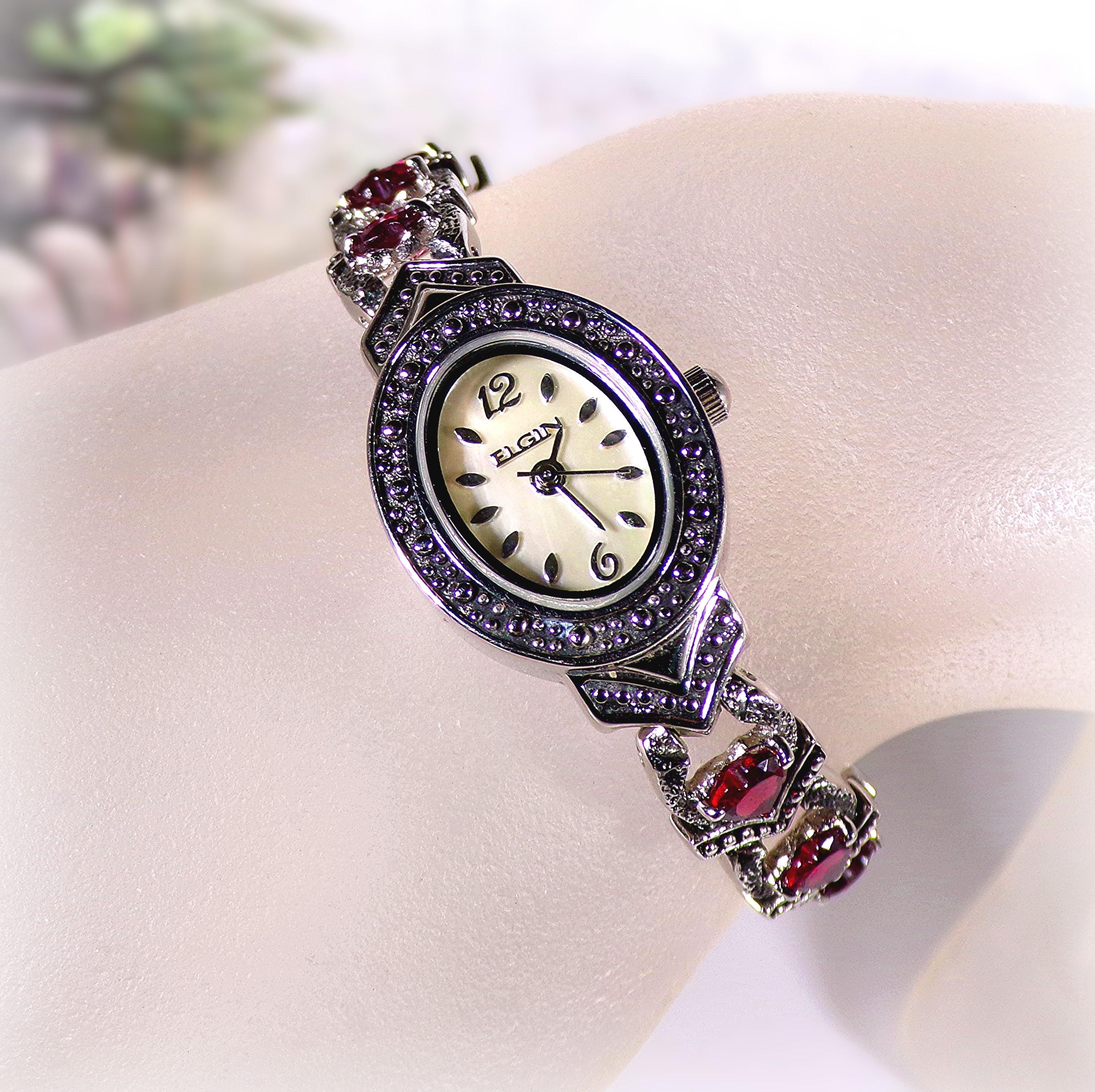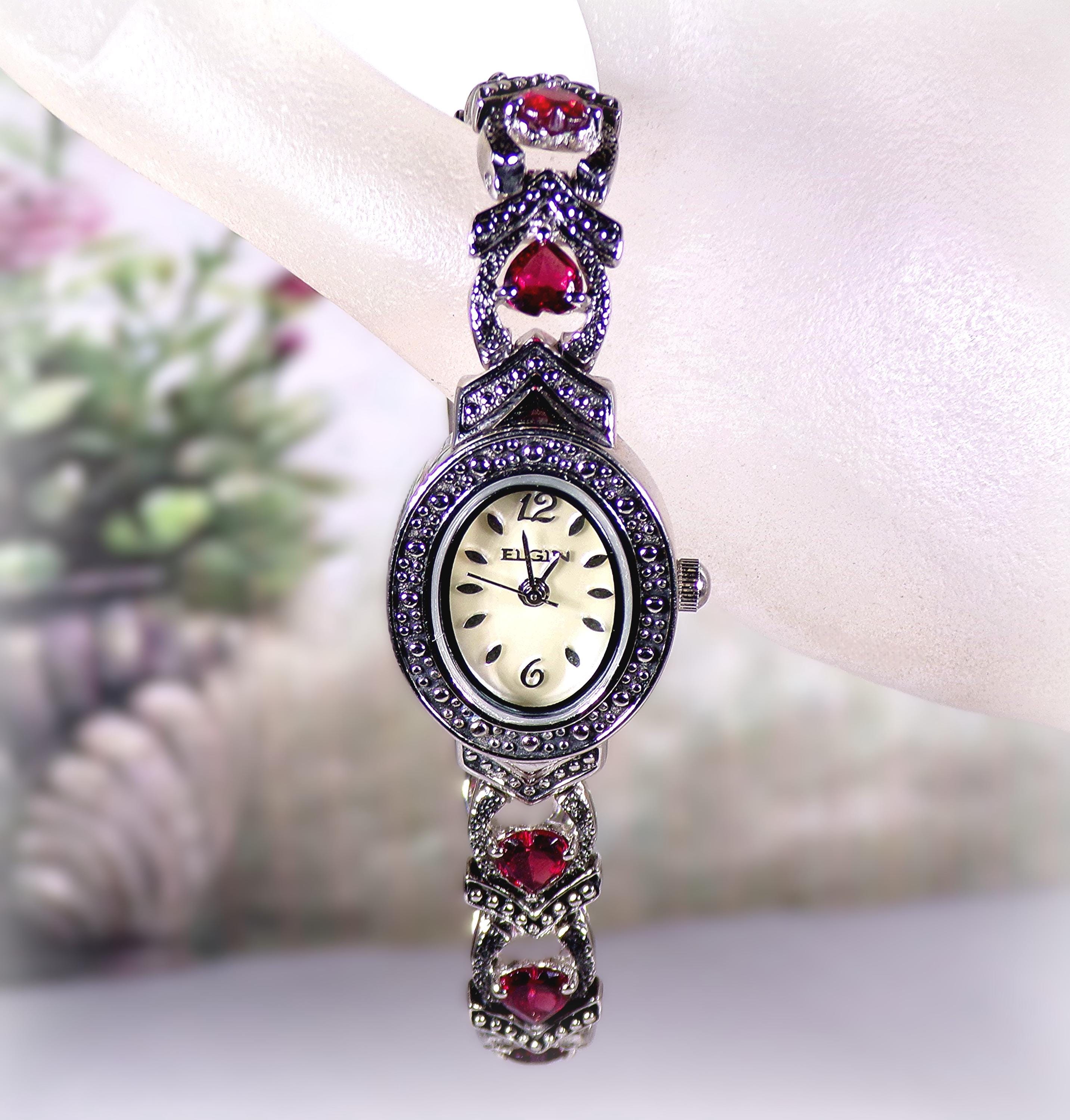 Womens Wrist Watch, Silver Marcasite Red Cubic Zirconia Elgin Watch – Heart-Shaped Stones – 6 Inches – Extra Links Included – Vintage Watch