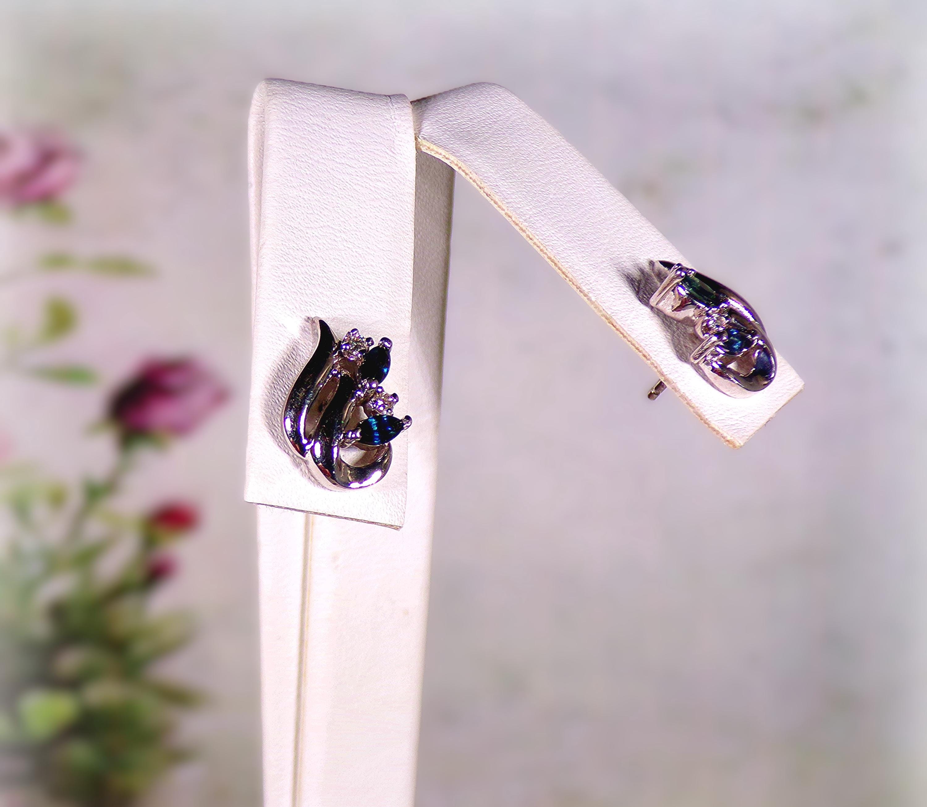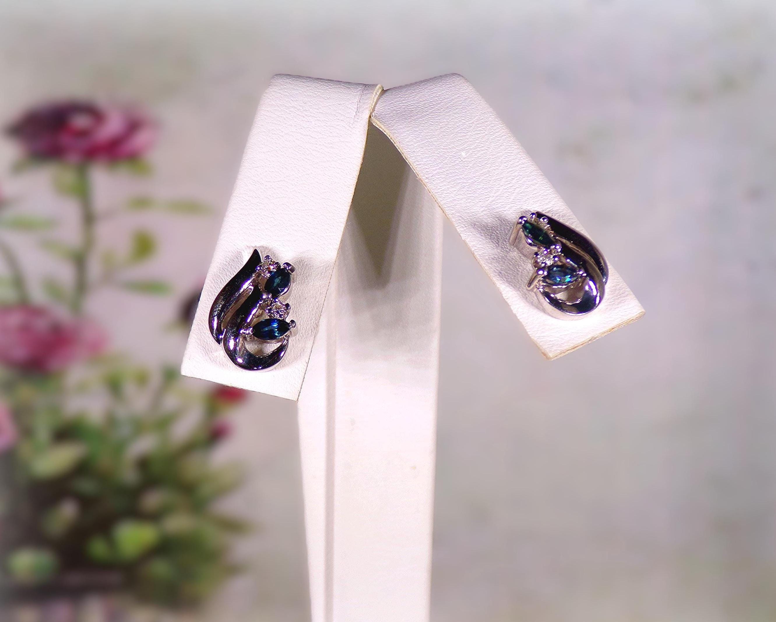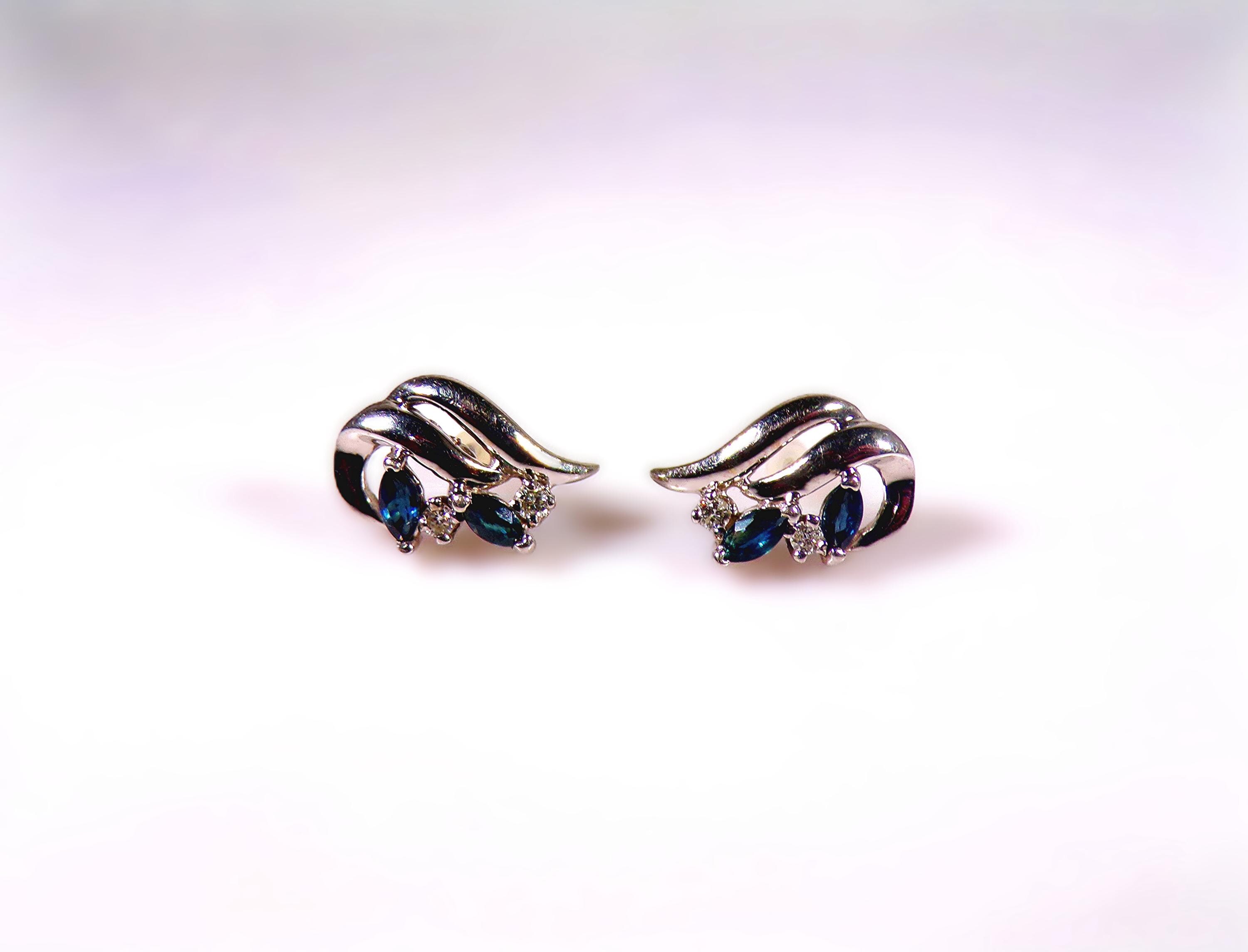 14k White Gold Marquise Cut Dark Blue Sapphire and Diamond Earrings – Genuine Diamonds – Womens Post Earrings – Vintage Earrings