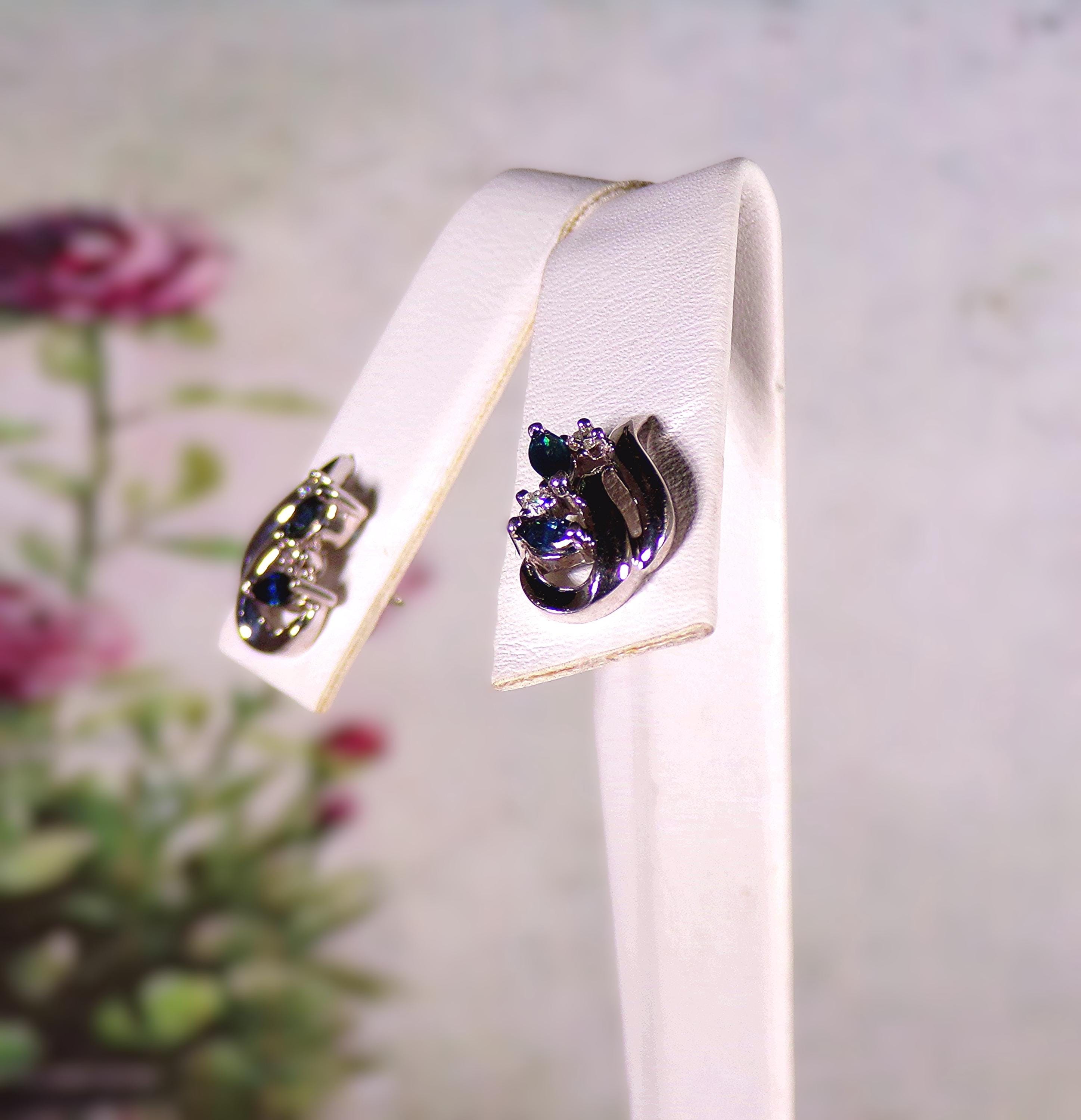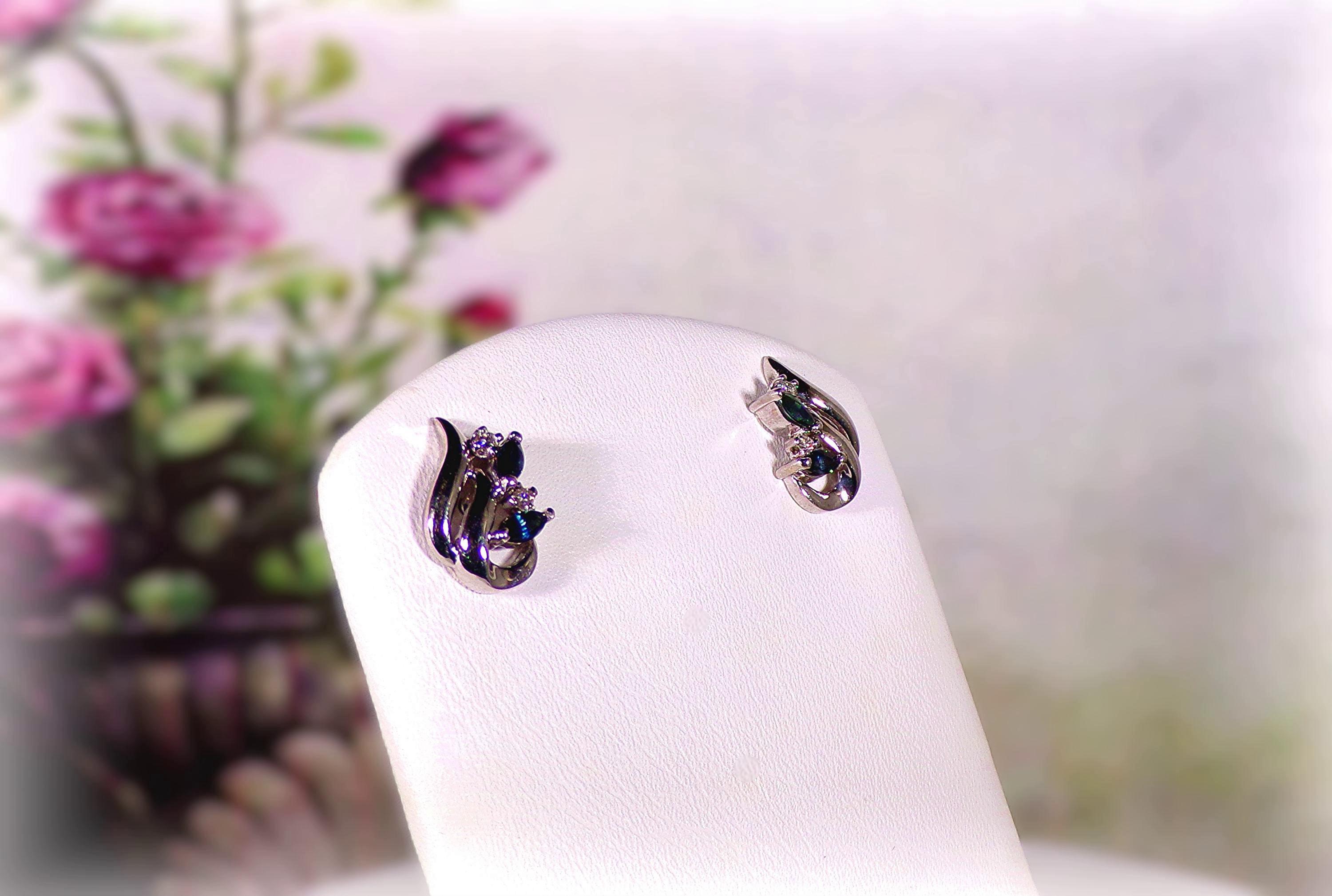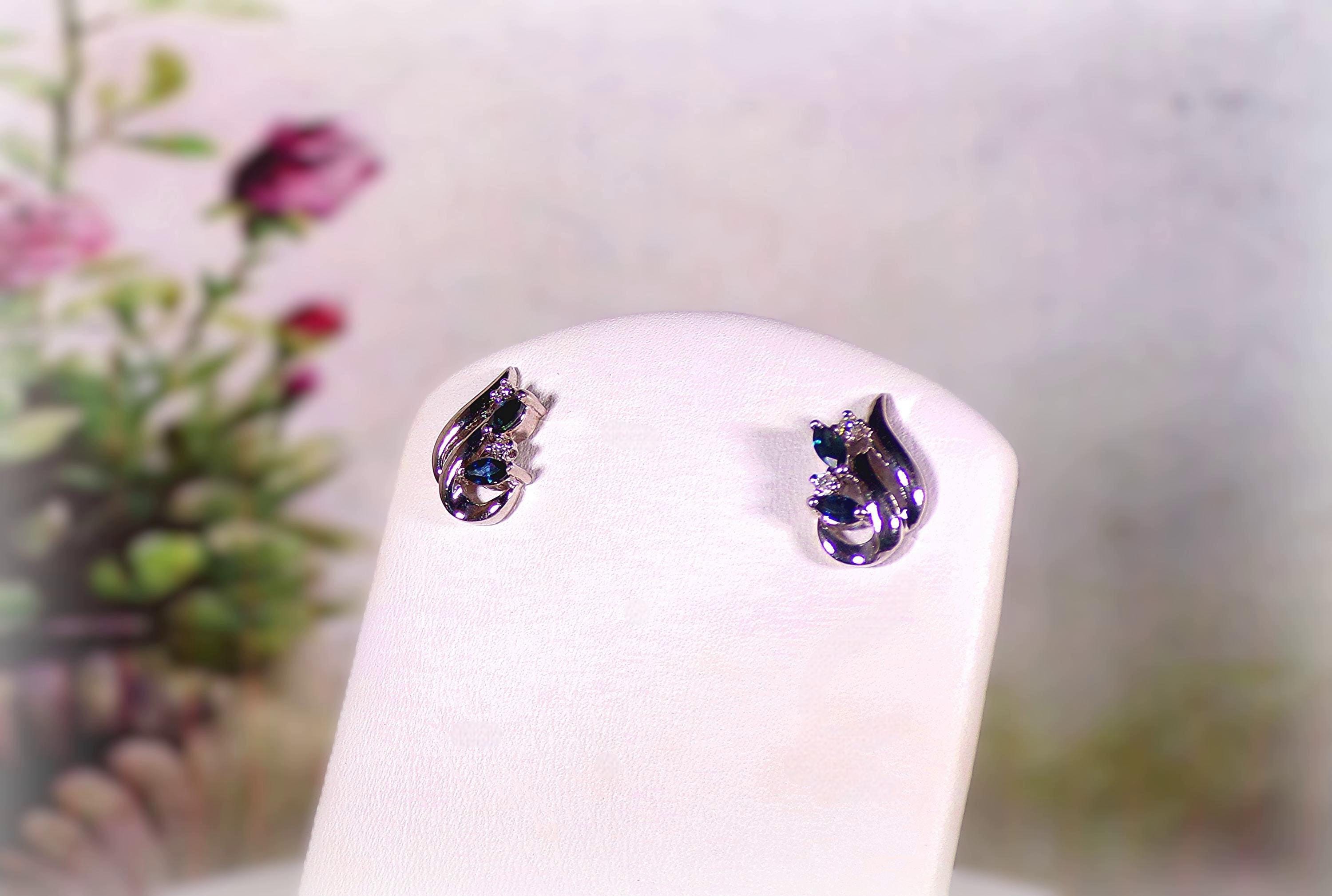 14k White Gold Marquise Cut Dark Blue Sapphire and Diamond Earrings – Genuine Diamonds – Womens Post Earrings – Vintage Earrings