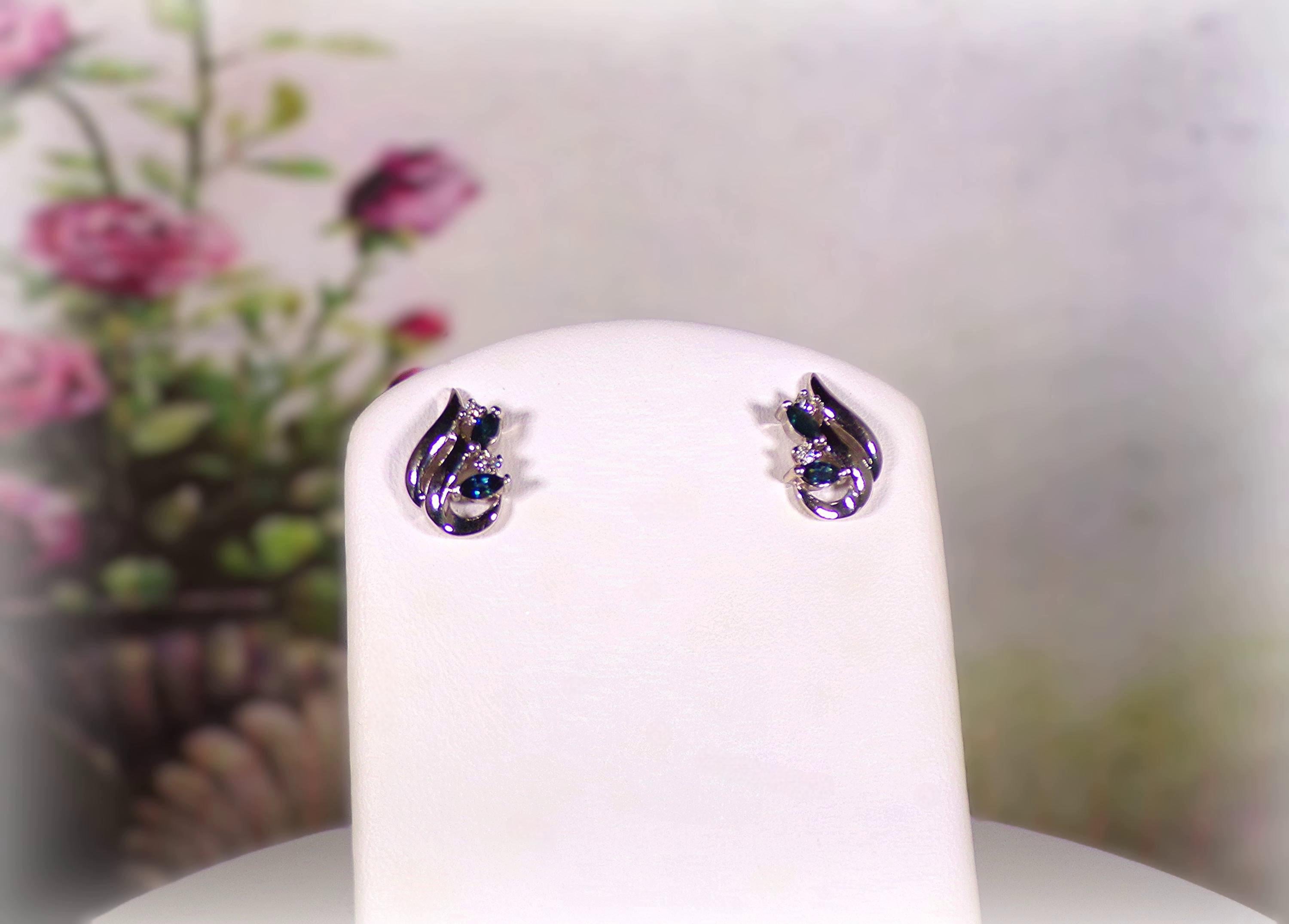 These lovely earrings feature marquise cut dark blue sapphires and small round diamonds set in 14k white gold. Perfect for everyday wear.