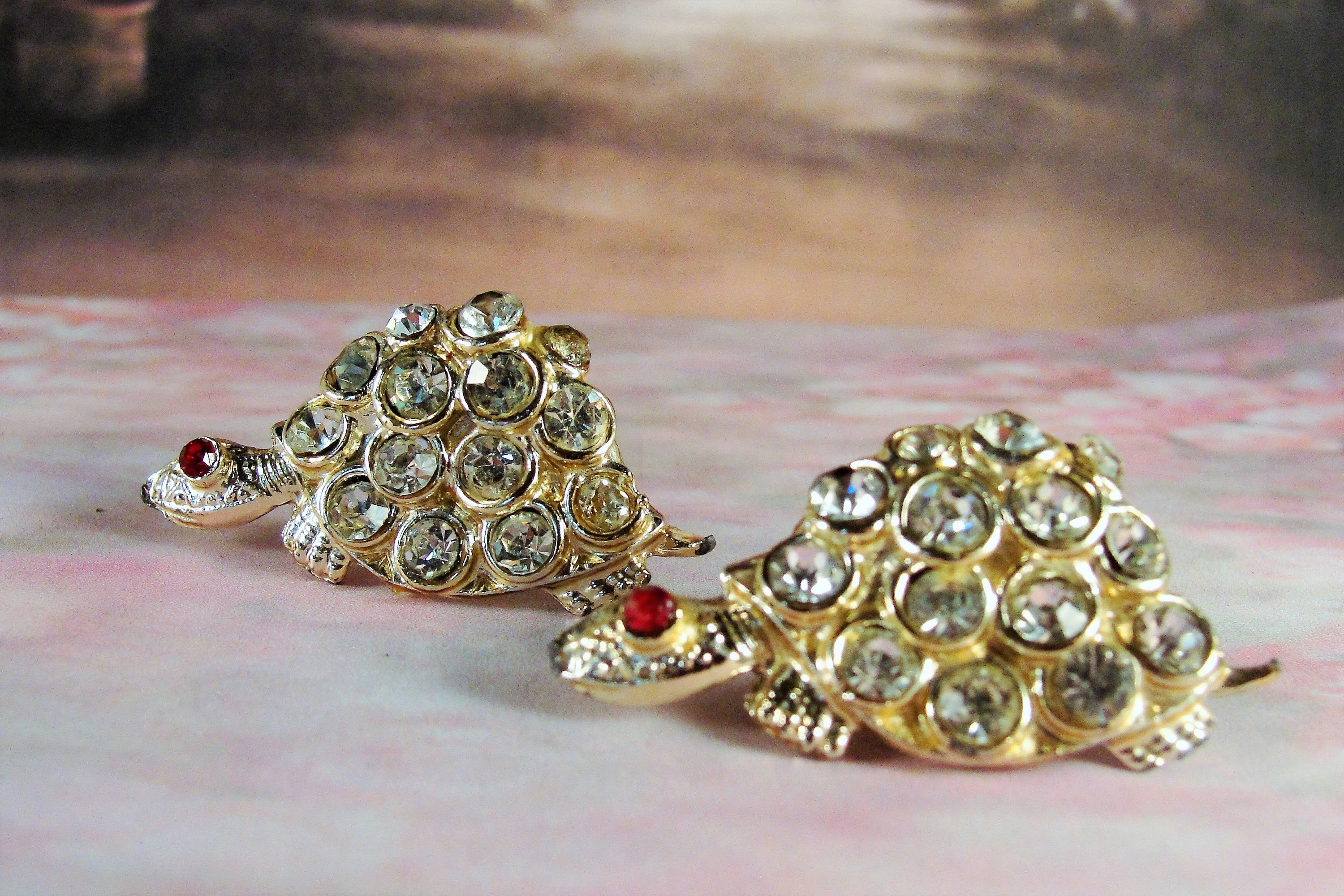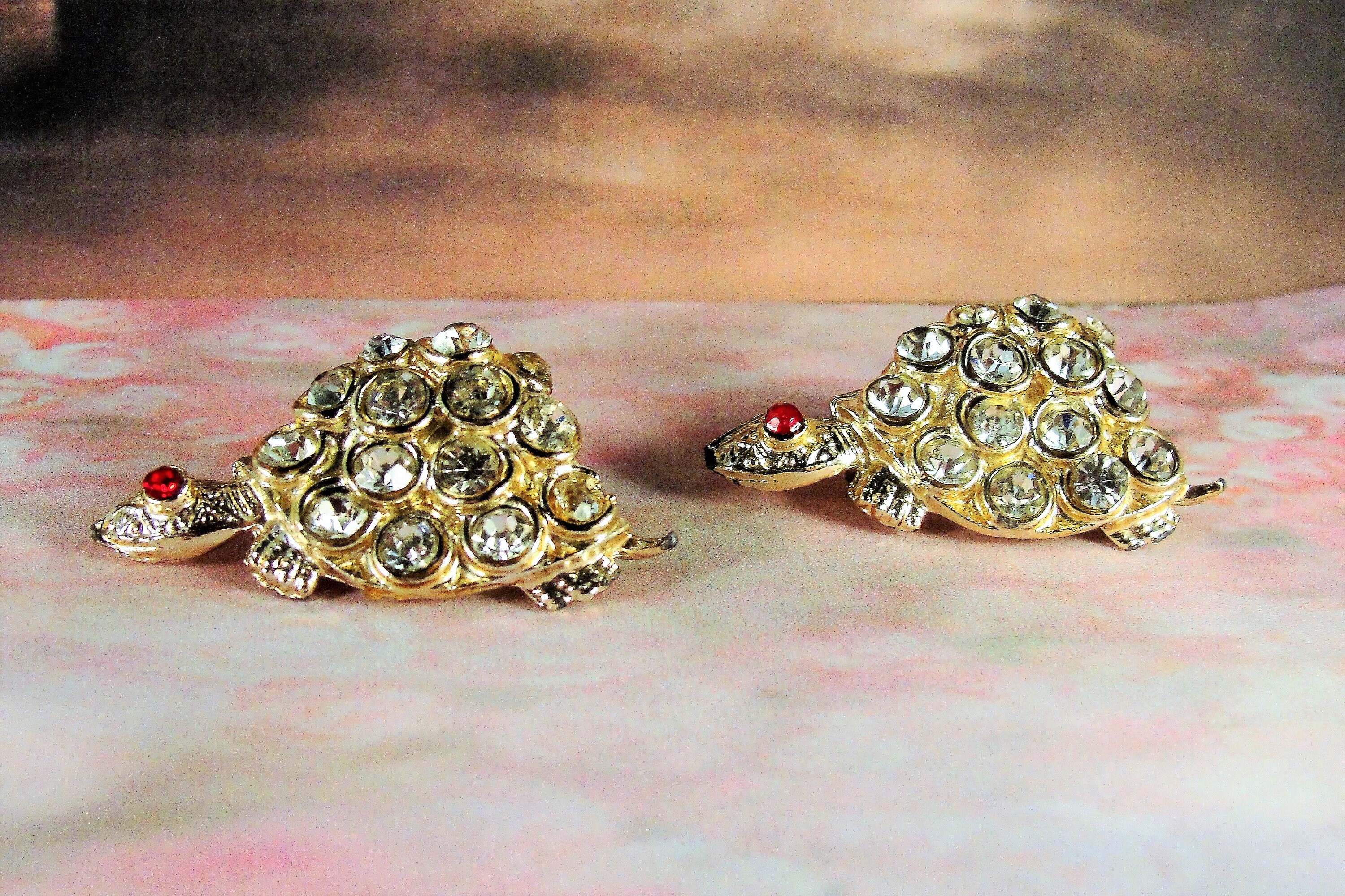 This is a set of two rhinestone turtle scatter pins that are set in a gold wash metal. The age of these pins is circa 1950's. The brooches consist of rhinestone encrusted bodies that are viewed as a side profile with a red rhinestone eye. Price is set for the pair. They have been together for so long, I would hate the thought of breaking them up now. There is a “C” Clasp on the back of each Turtle and both are in good working order.