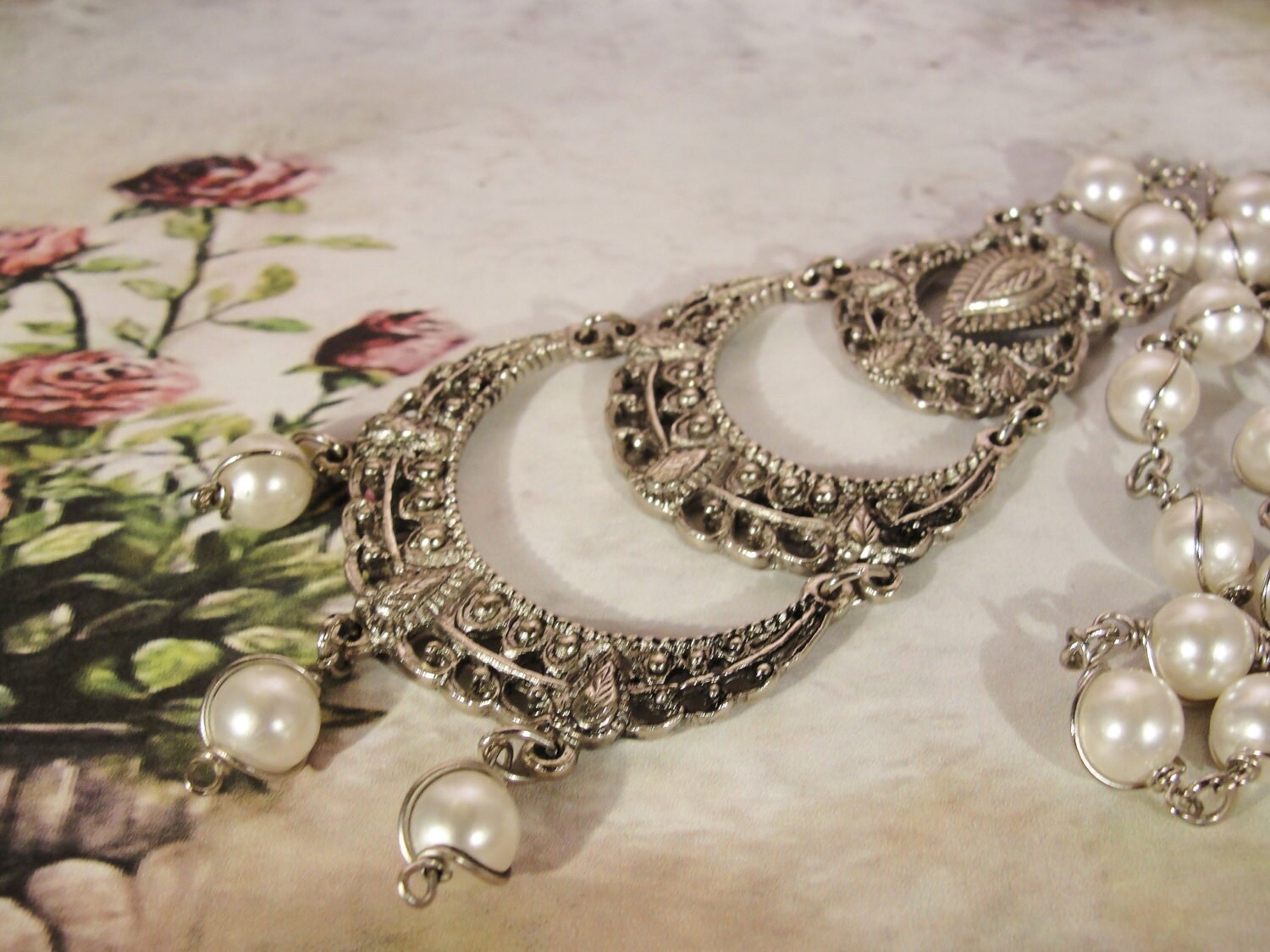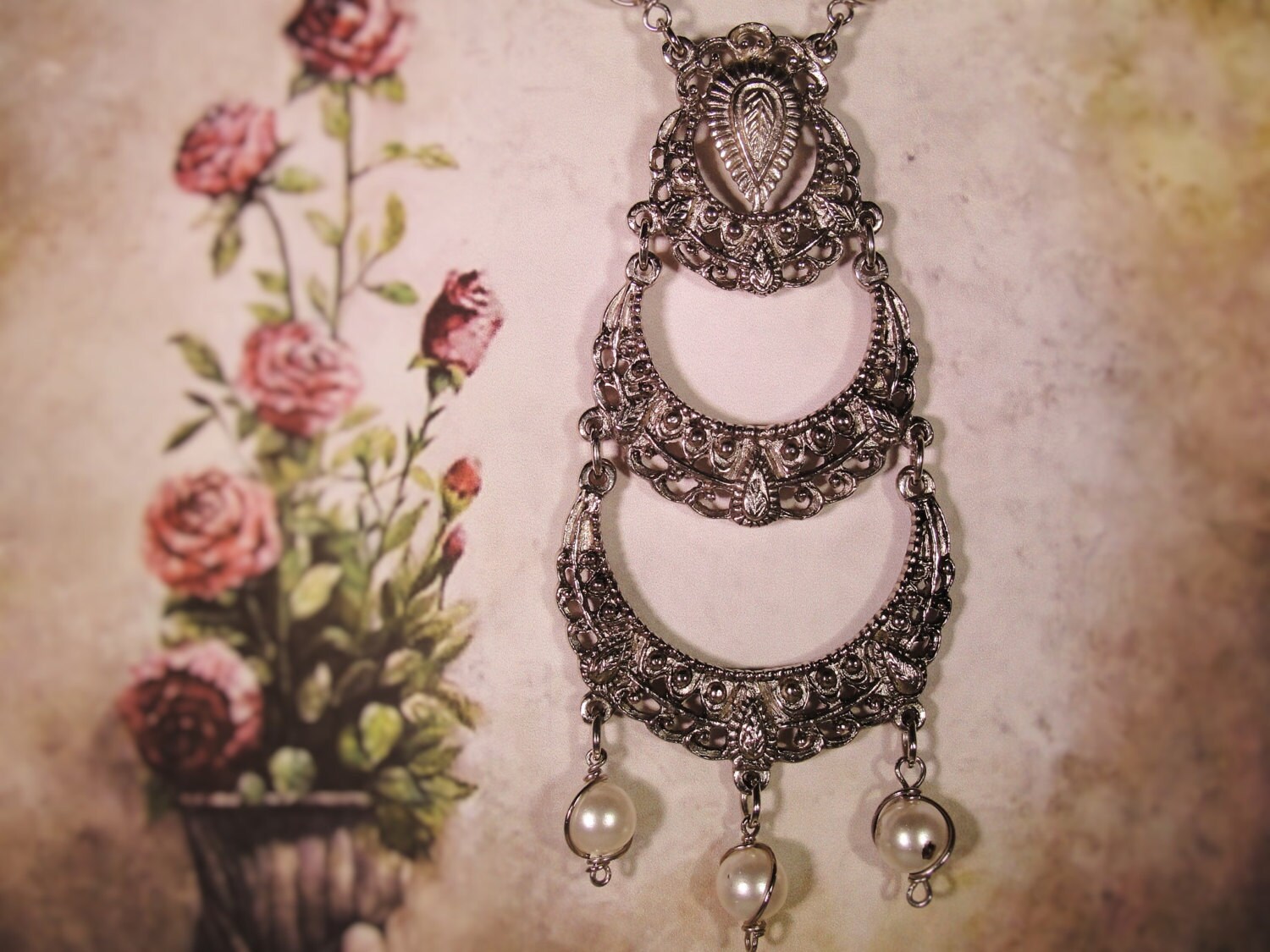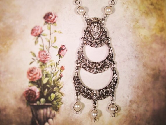 This is a great long pendant that has a decorative silver metal design that spans across 3 tiers of open metal work. A really beautifully done design. There are three Pearl drops at the end of the Pendant finishing off this very classy look. As you move up the chain of this necklace, there are gorgeous pearls at every other link of the chain all the way up to the Shepard’s hook. A very nice pendant that is unique and can be easily worn with so many things.