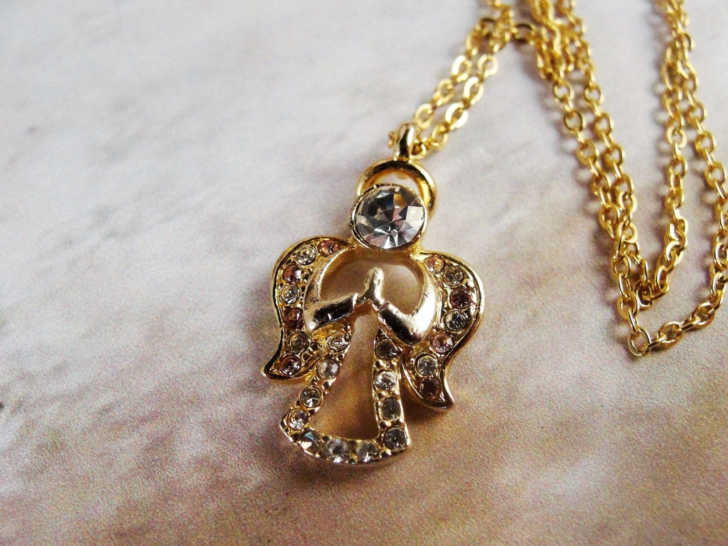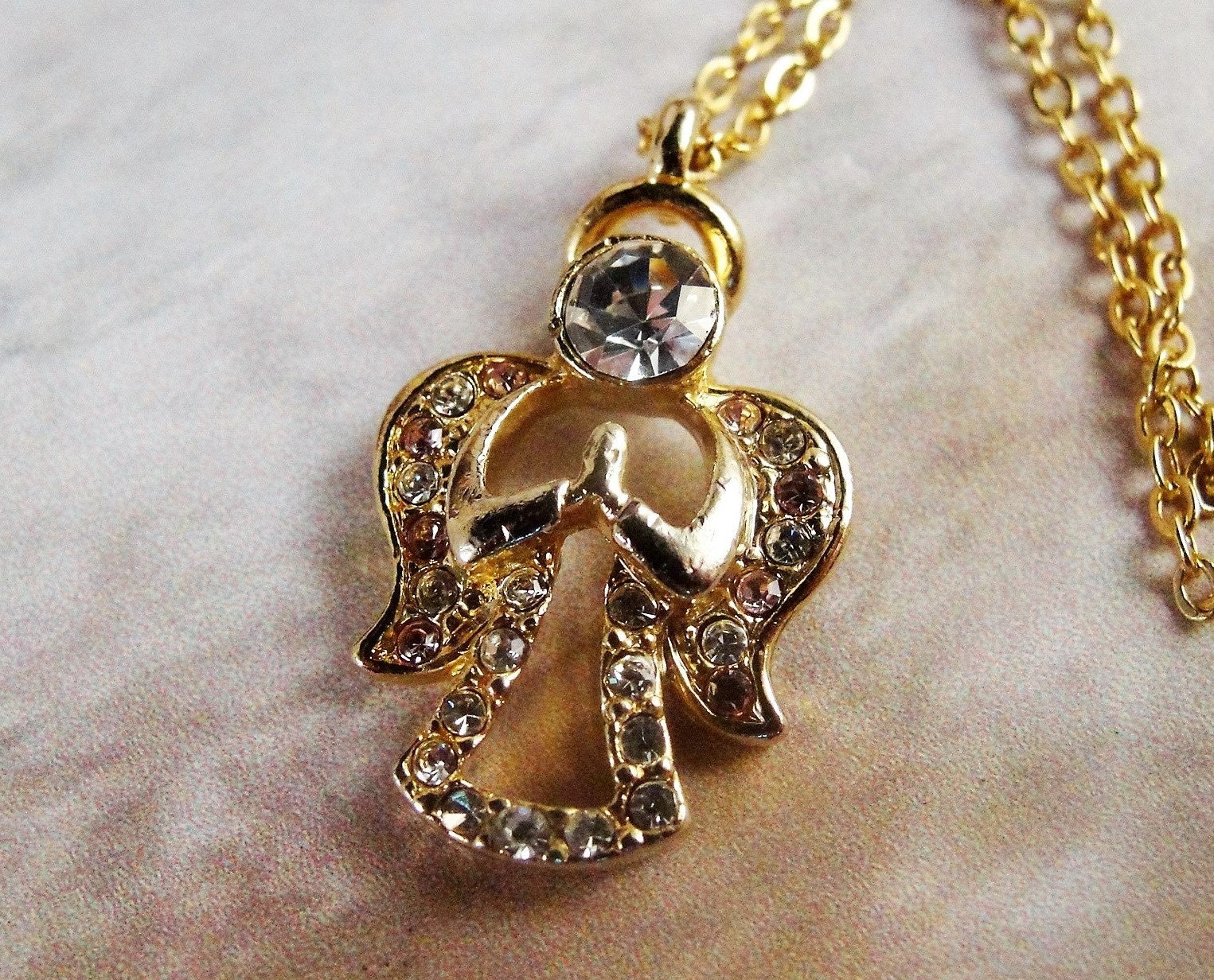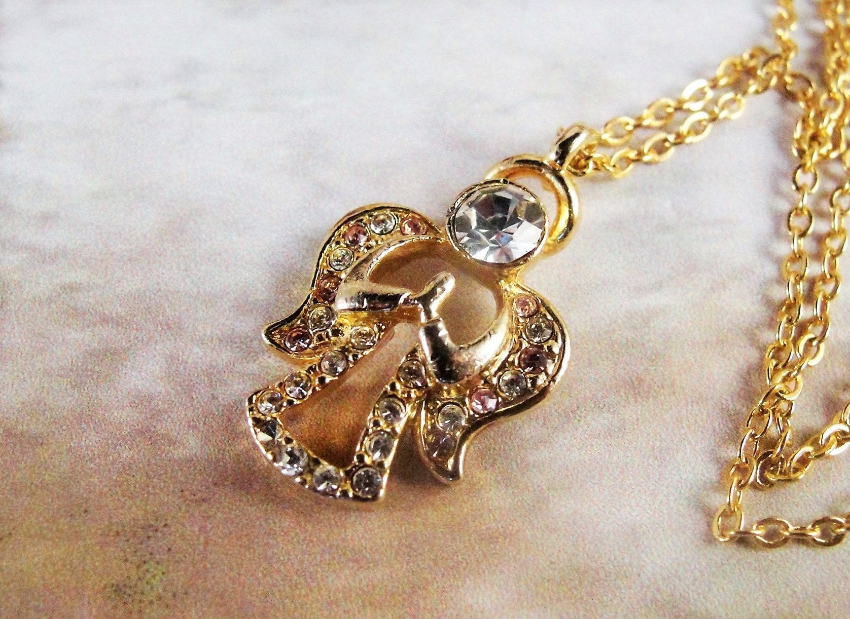 This is a very nice pendant by the Designer “DM” (Danbury Mint) featuring a praying angel in Clear and Pale Pink Rhinestones set in a Gold Tone Metal. The head of the Angel is a Large Clear Rhinestone and the Wings of the Angel are a mix of Clear and Pink Rhinestones and her little dress is are clear rhinestones. A lovely pendant for any age.