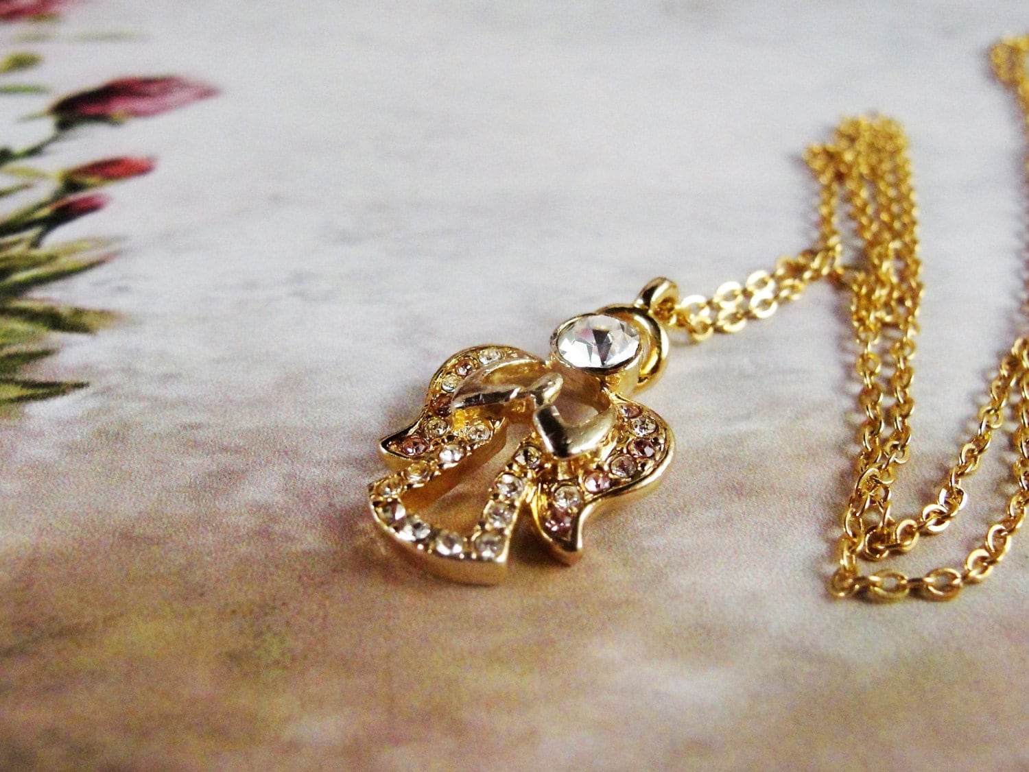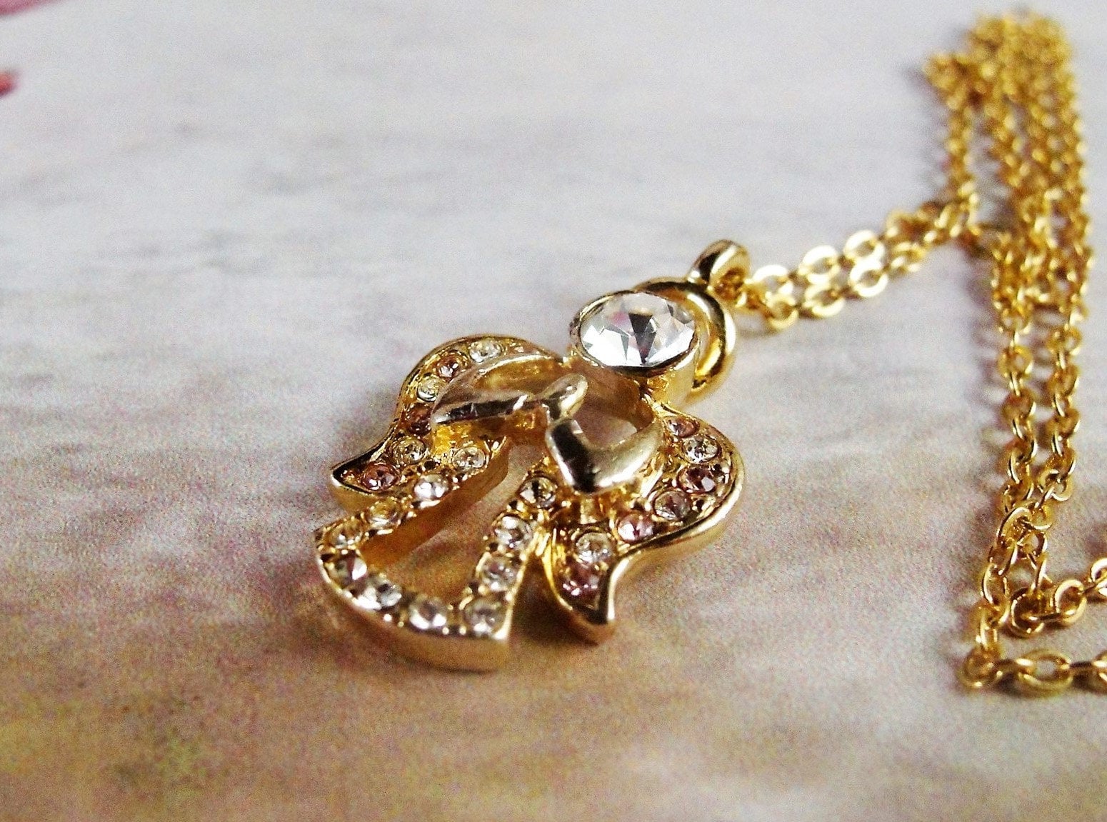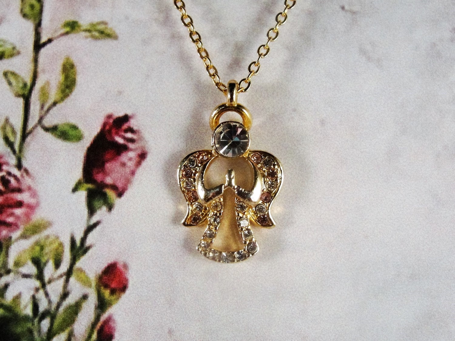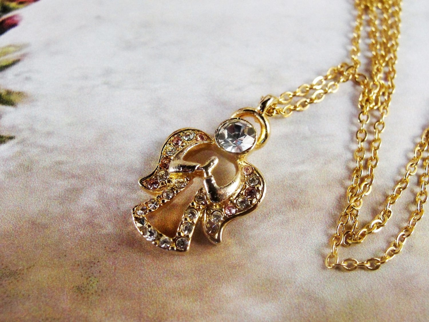 This is a very nice pendant by the Designer “DM” (Danbury Mint) featuring a praying angel in Clear and Pale Pink Rhinestones set in a Gold Tone Metal. The head of the Angel is a Large Clear Rhinestone and the Wings of the Angel are a mix of Clear and Pink Rhinestones and her little dress is are clear rhinestones. A lovely pendant for any age.