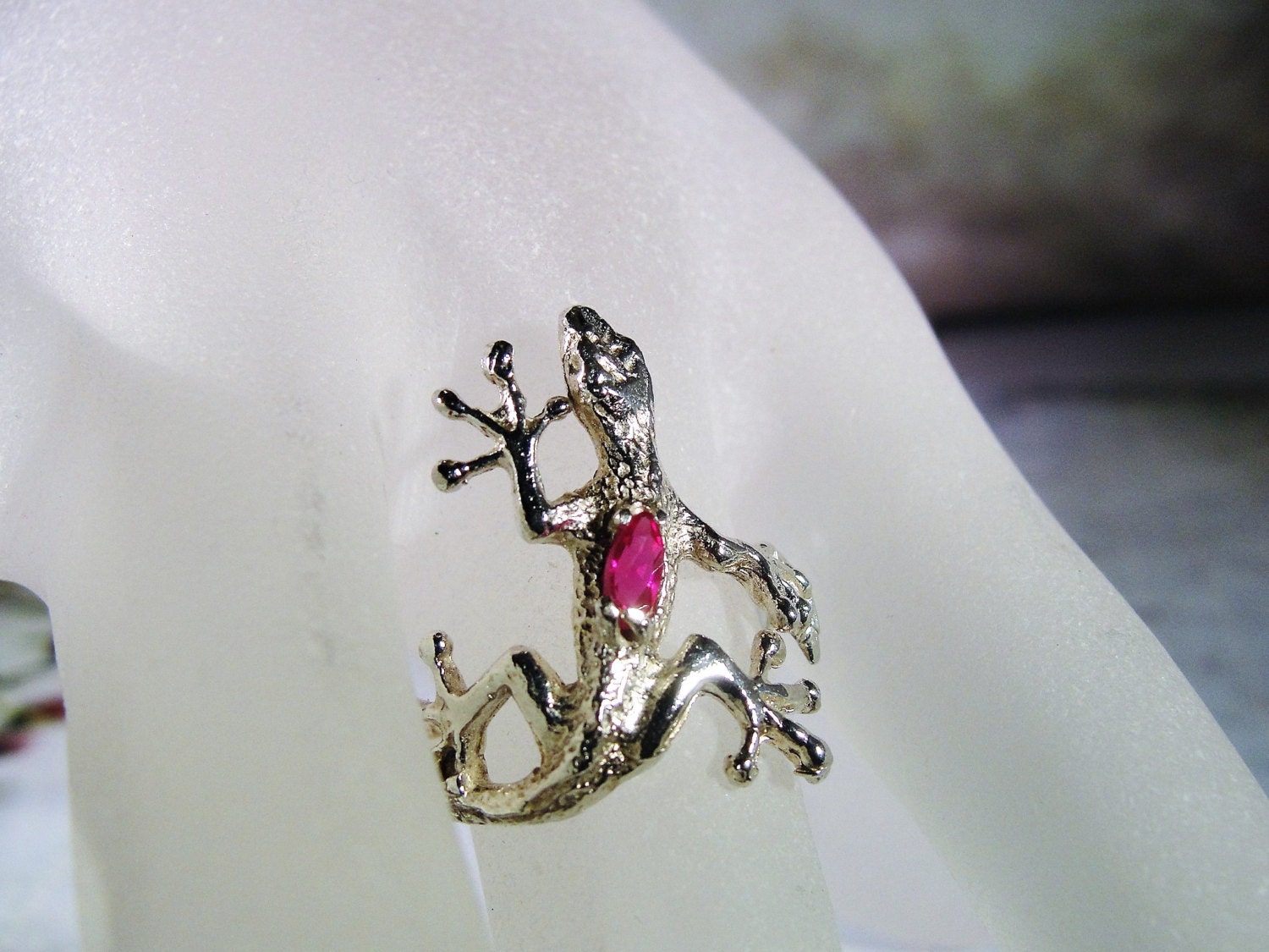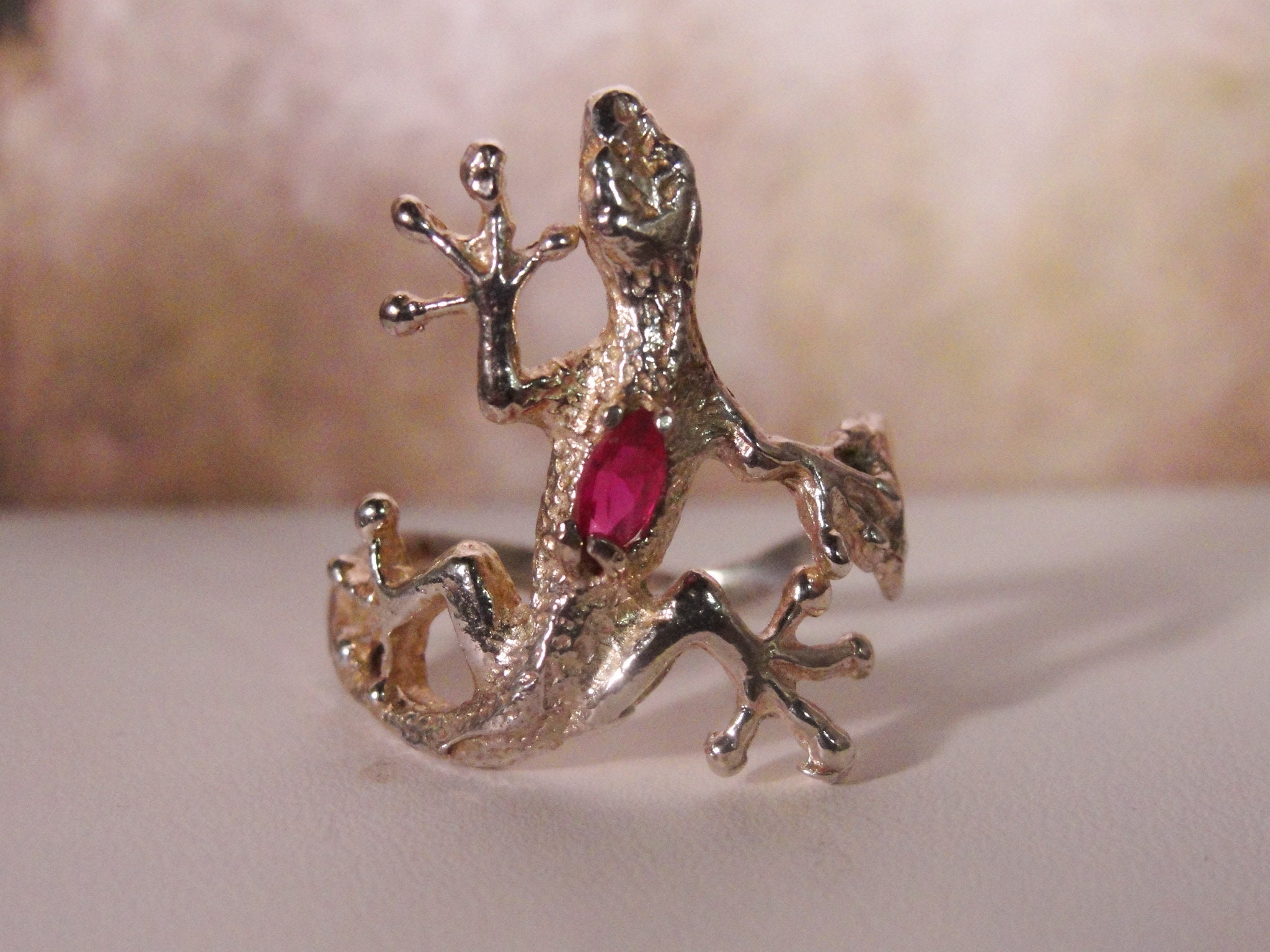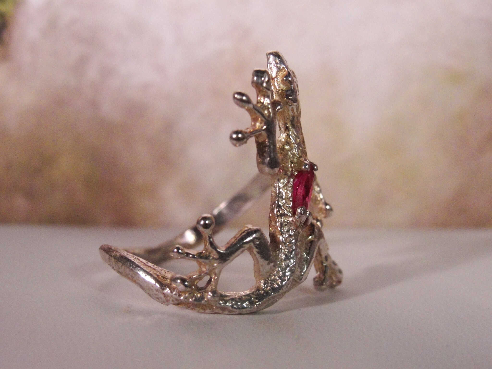 The synthetic ruby is a very nice touch and it is a very clear stone. The area of the lizard where the stone is located has an open back so the brilliance of the stone is able to be seen. It is marquise shaped stone, although the body of the lizard does wrap around it. Also, there is tons of detail work on this lizard, it is not plain, it is very decoratively unique!