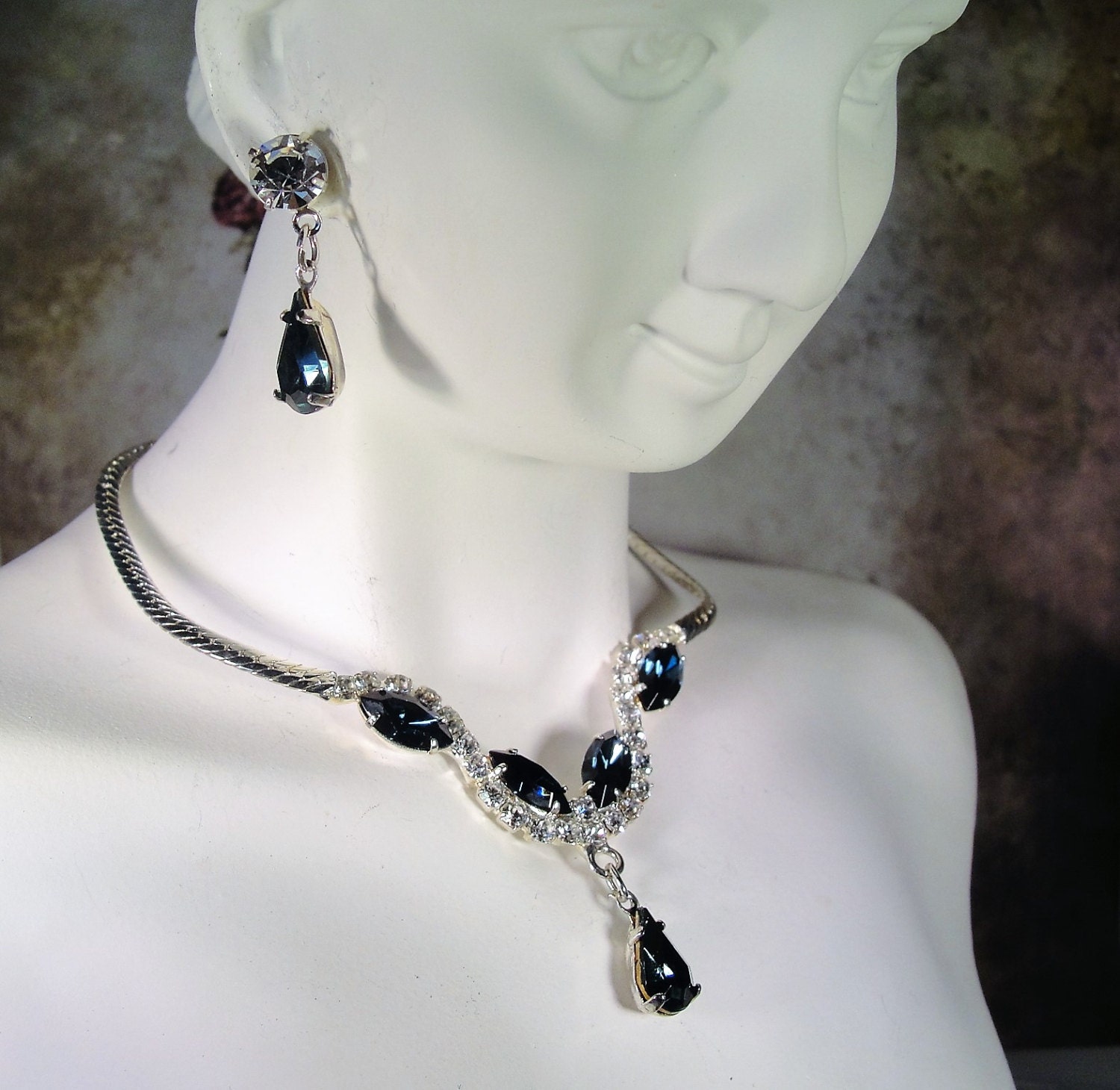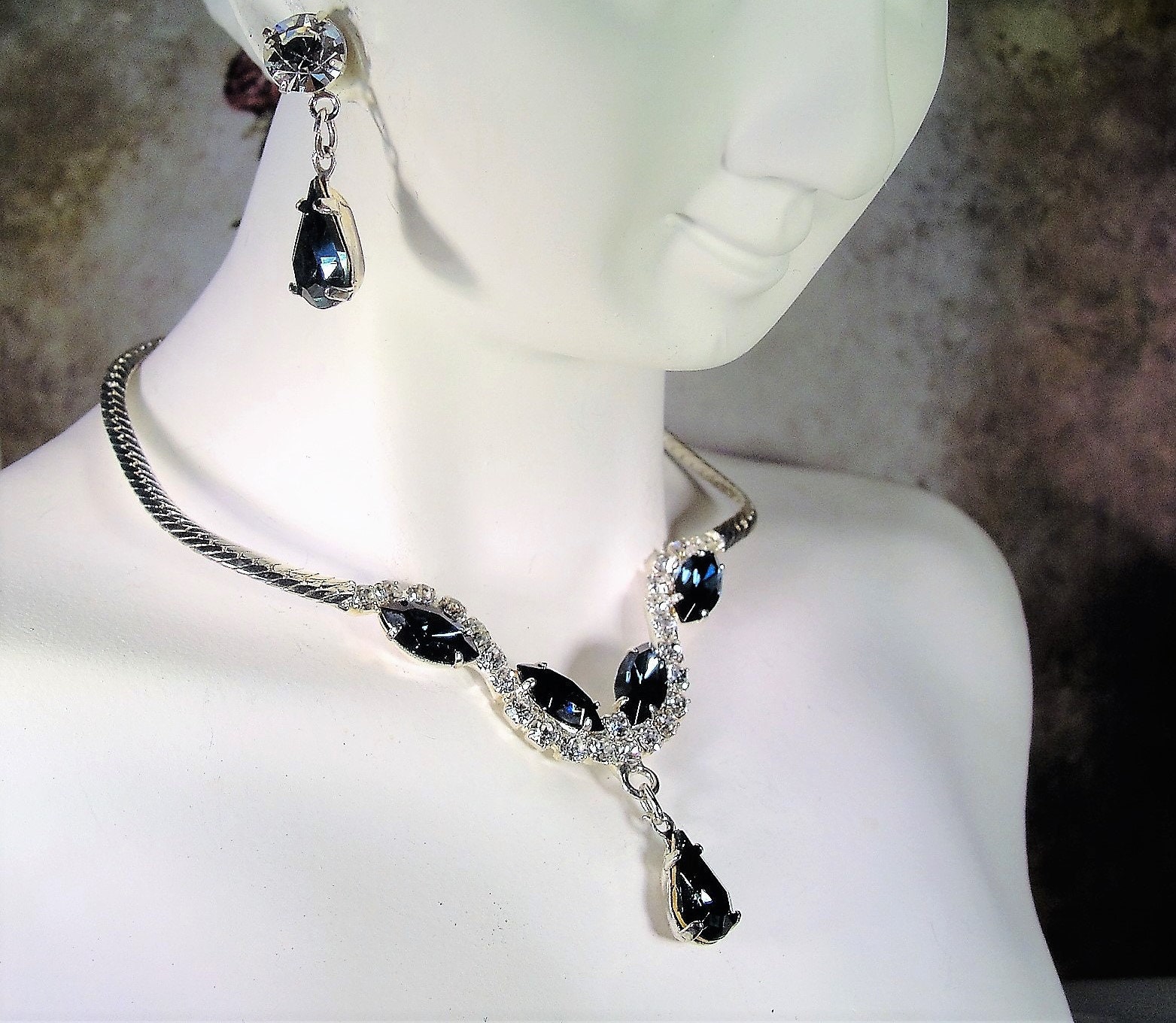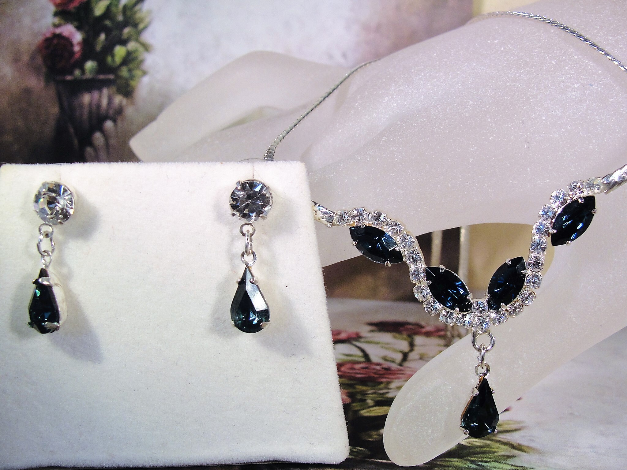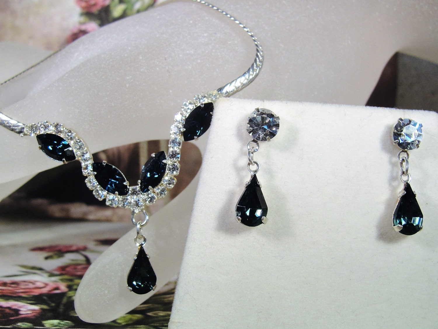 This is a gorgeous necklace and earrings set that is so very classy and elegant. The blue sapphires are a gorgeous deep blue color that look so believably real. All clear sapphires are shiny, sparkly and clear. There are no dark rhinestones in the set at all.