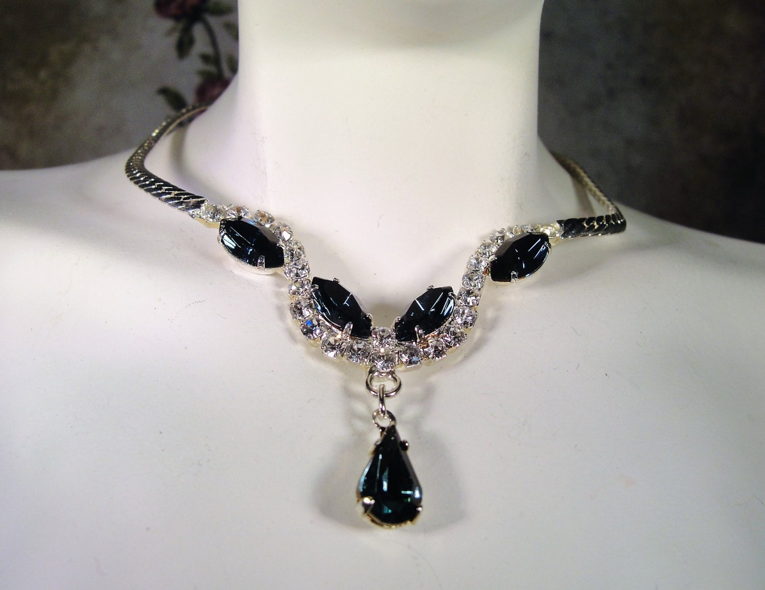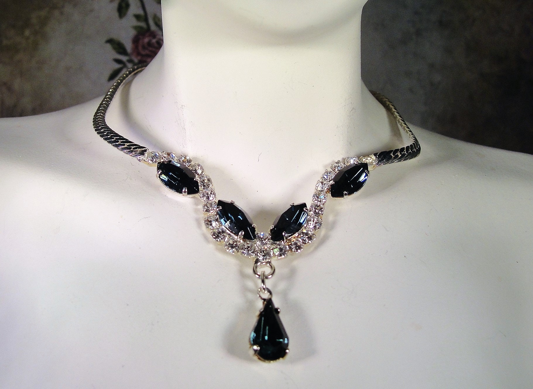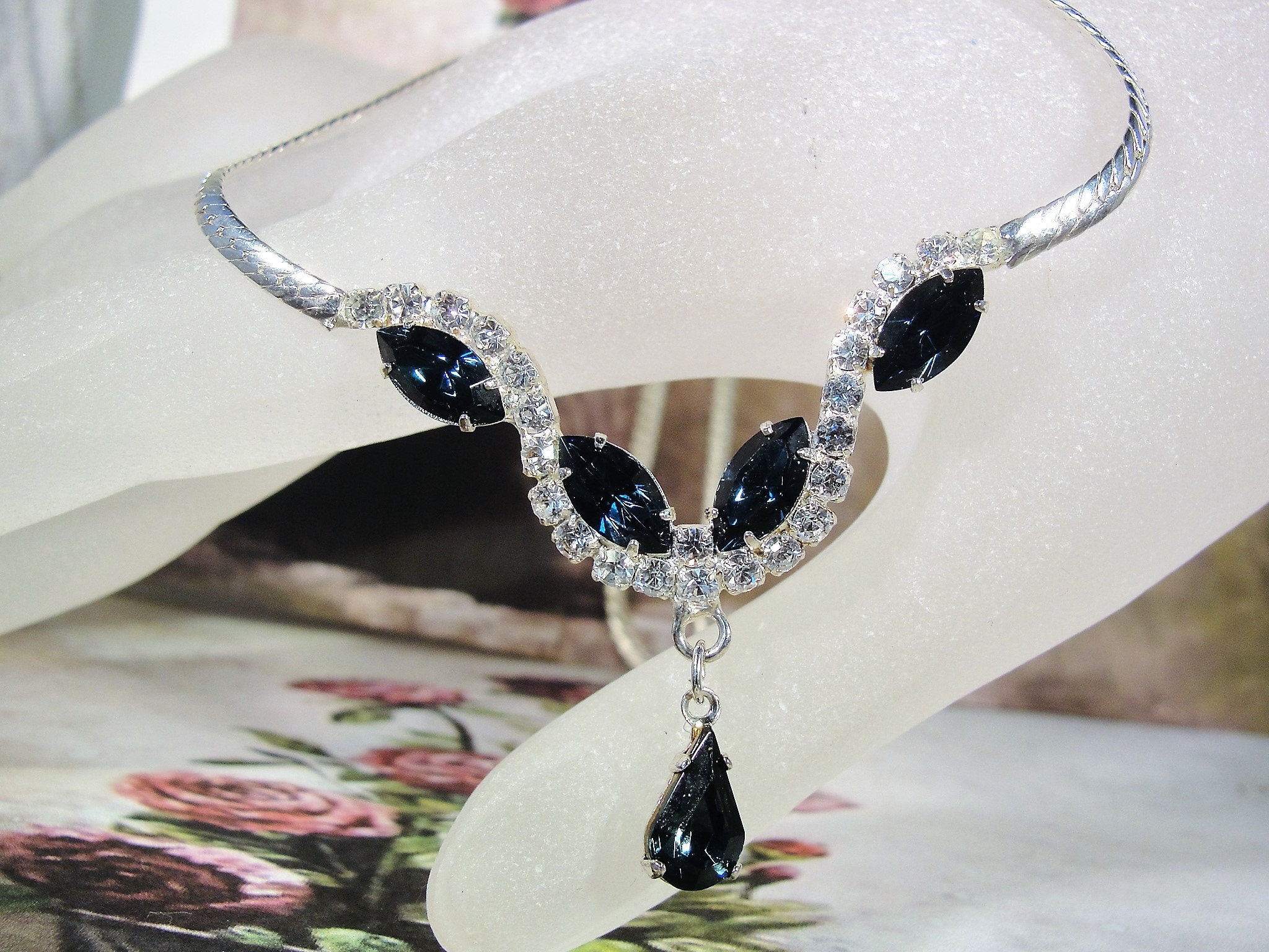 The necklace is done is a pendant fashion and connected to a flat herringbone silver tone chain. The pendant part of the necklace is done in a stiff expanded “U” shape with dark blue marquise and teardrop sapphire rhinestones adorning it.