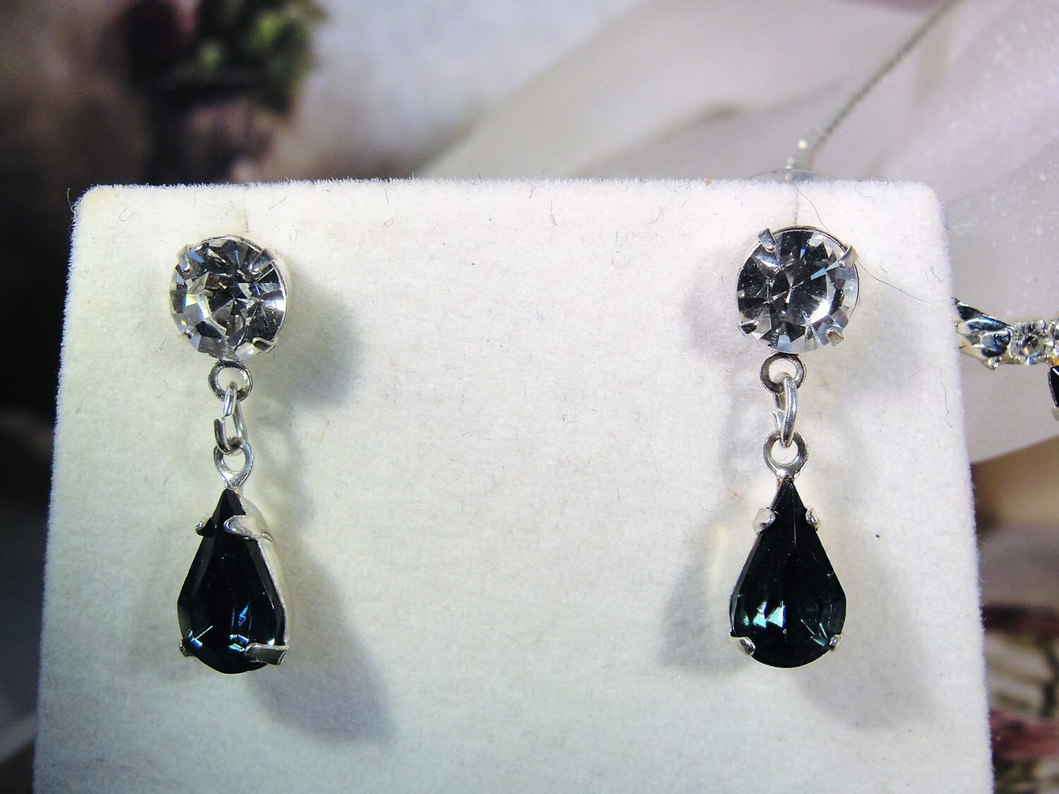 The earrings are for pierced ears and are post earrings that have a clear round rhinestone at the top and a delicate dark blue teardrop rhinestone dangling from it. All rhinestones are prong set. Comfort backs will be provided with these earrings.
