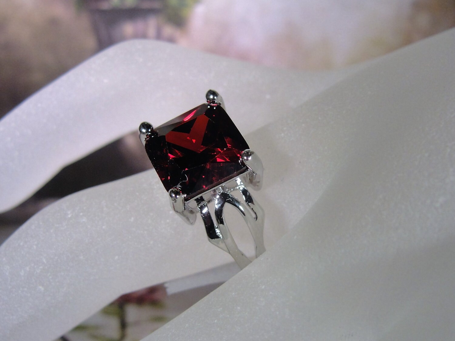 This is a clean and simple, square cut deep red Cubic Zirconia stone set in a Sterling Silver Ring. It has a nice decorative split shank band and a simple Art Deco basket setting. This is a nice ring for all occasions. It is New Old Stock (NOS) and has never been worn.