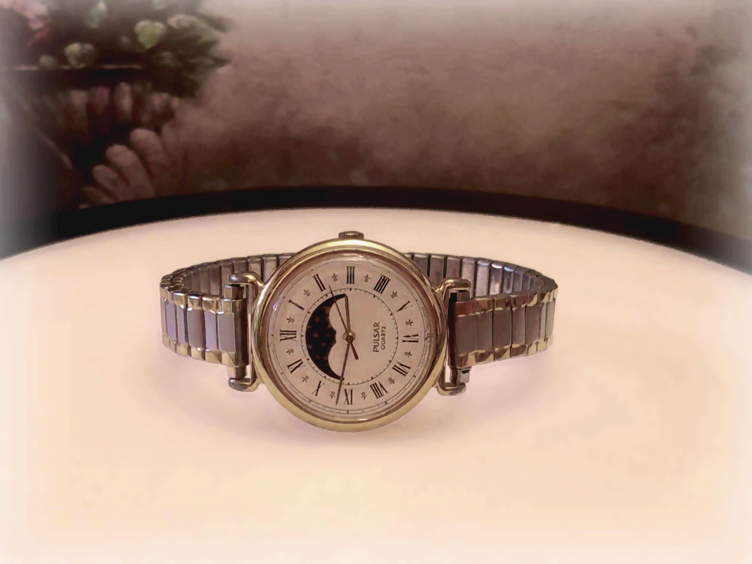 Moon Phase Wrist Watch – Pulsar Quartz Wrist Watch – Round Case with Moon Phase Movement – Silver and Gold Two Tone Band – Vintage Wrist Watch