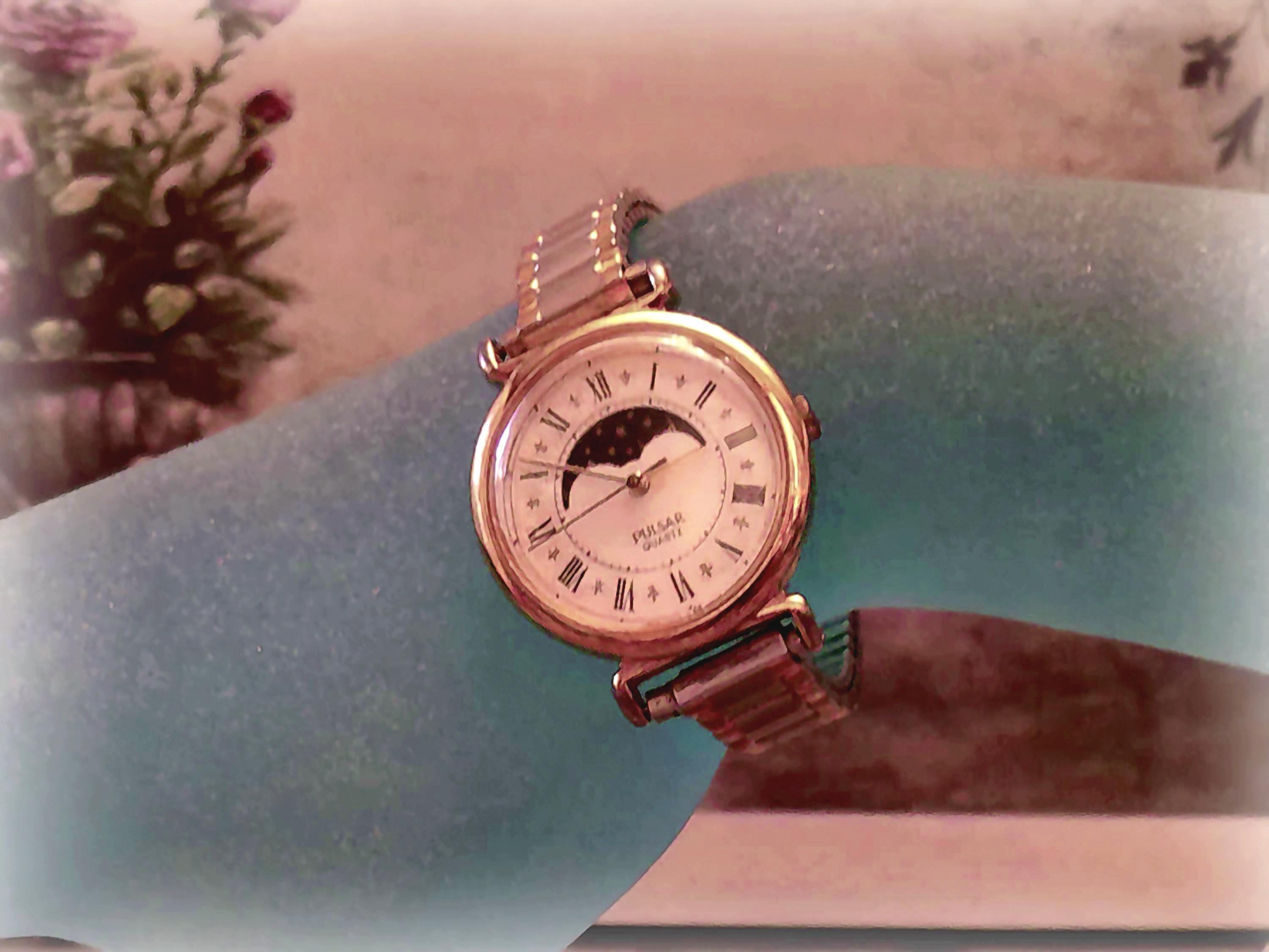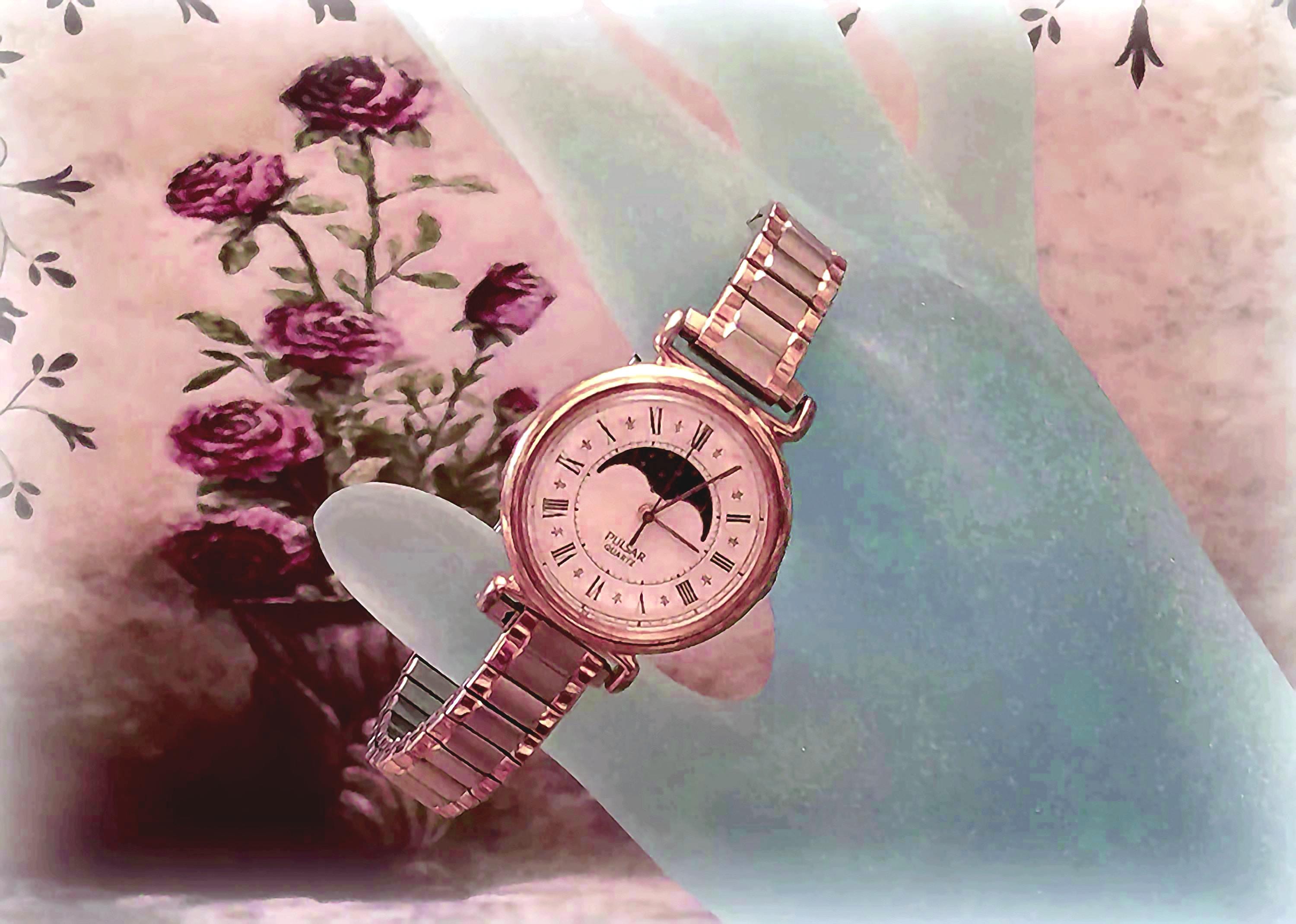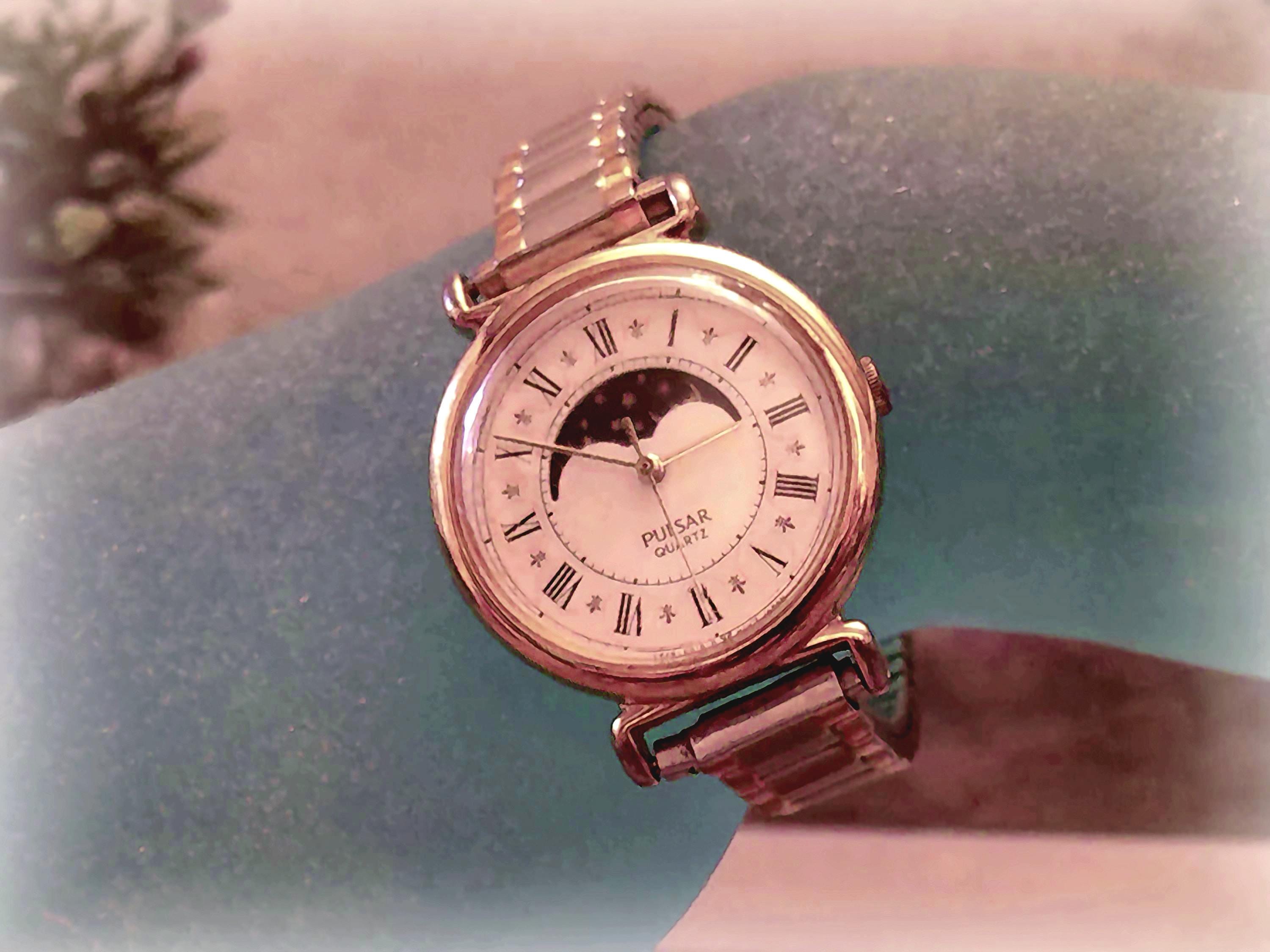 This is a wonderful Moon Phase Wrist Watch with a clean face and clean Moon Phase movement. This watch is a Quartz watch and is working and keeping good time. The face has a Moon Phase background and black hands. The movement manages the time and the actual Moon Phase. This watch is classy, elegant and stunning. Perfect for everyday or special occasions.